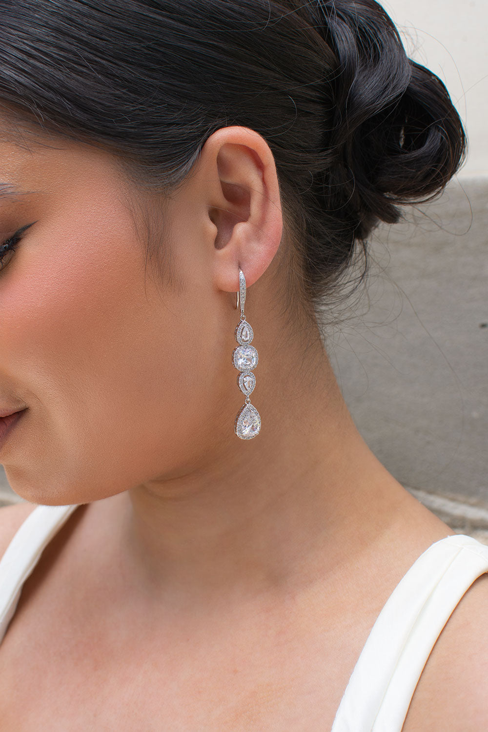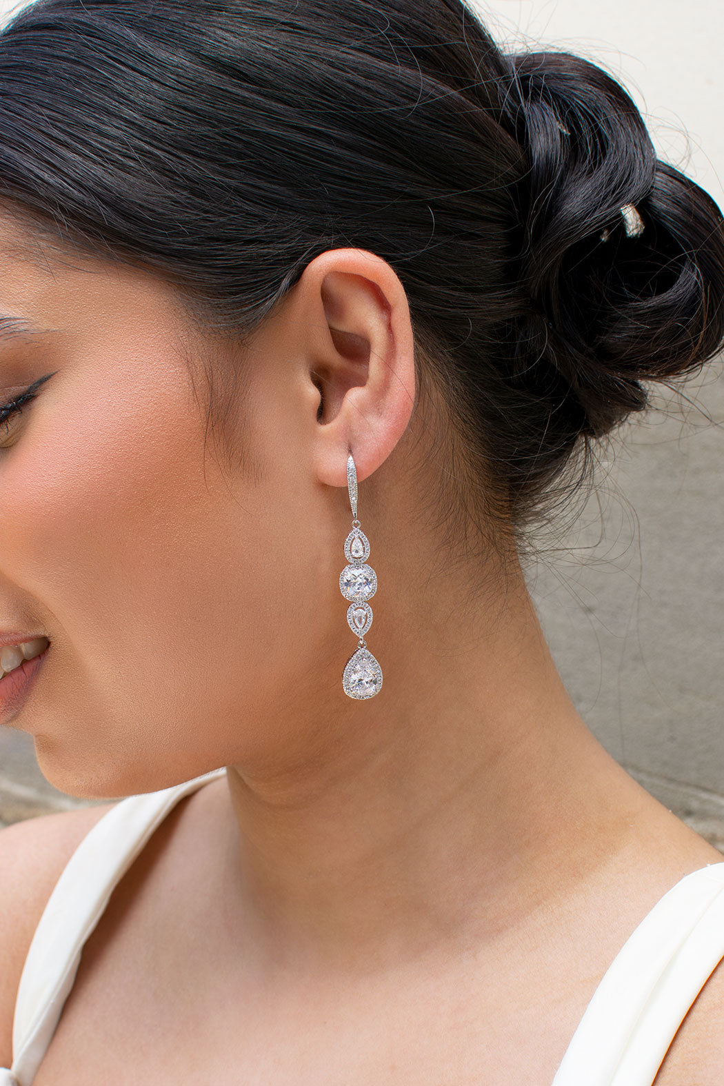 A sparkling wonder of an earring, Montana is a luxe long drop statement piece that is sure to capture the attention of all. Hanging beneath a crystallised classic hook fitting, Montana features three stacked intricately encrusted crystals with a final hanging teardrop crystal that will light up with movement as you stride down the aisle, parade through the day and twirl into the night. If you are looking for a touch of Hollywood glamour on your special day, Montana is the earring for you.