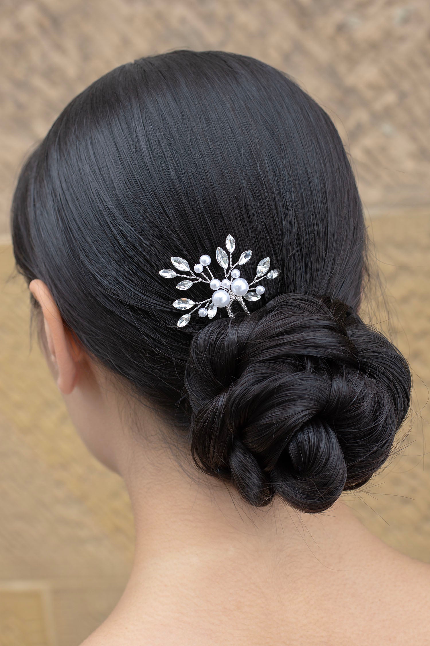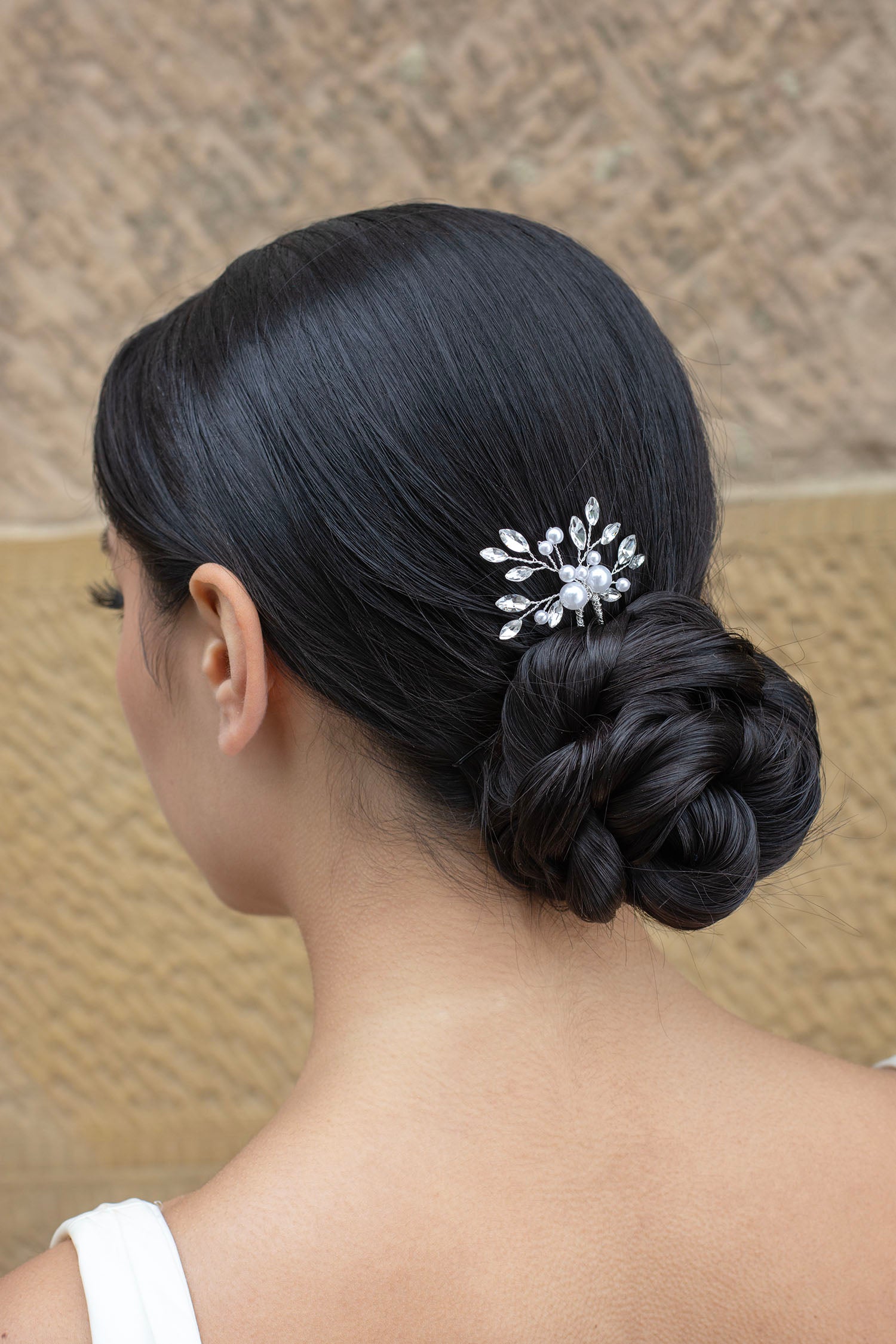 Soft and refined, our Talia hairpin features shining swirls of pearls and tiny navette crystals. Talia is a delicate and classic bridal accessory perfect for both brides and bridesmaids.