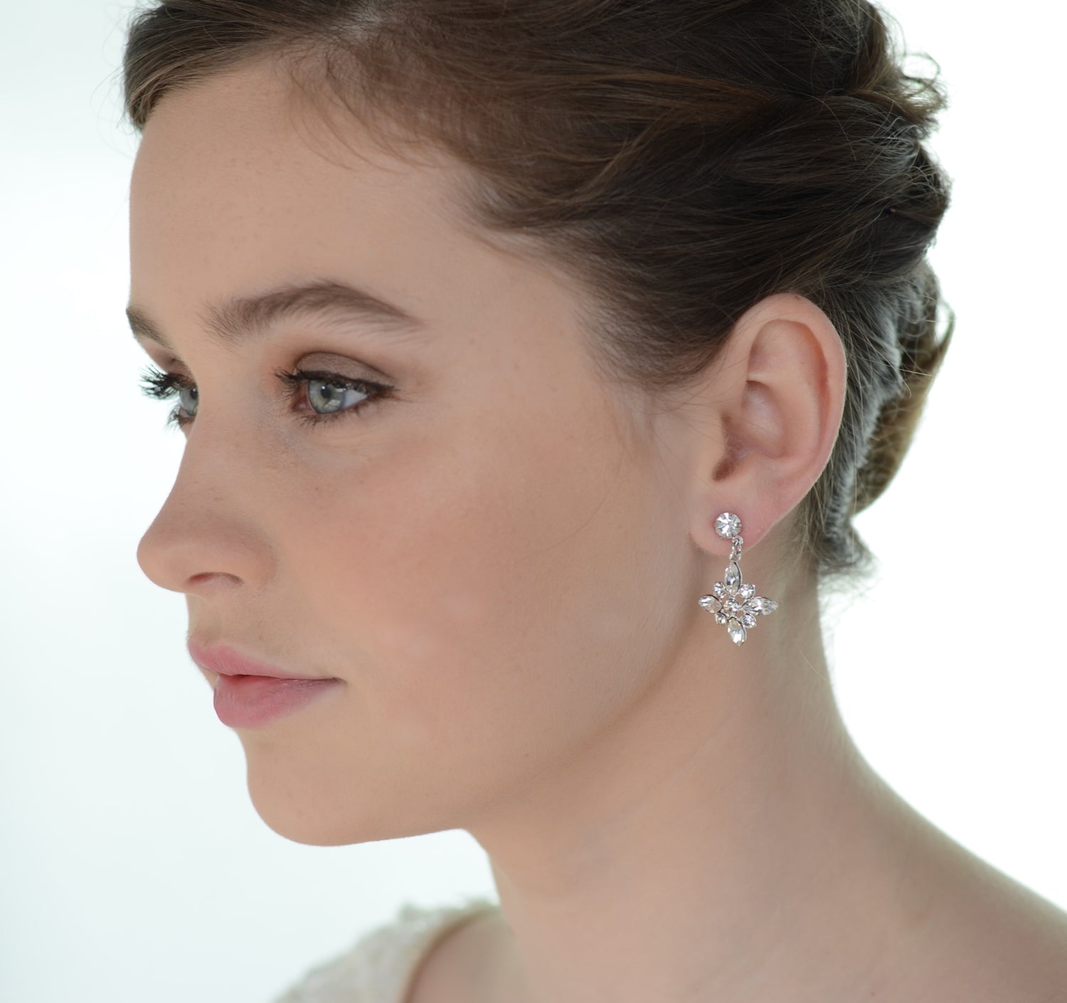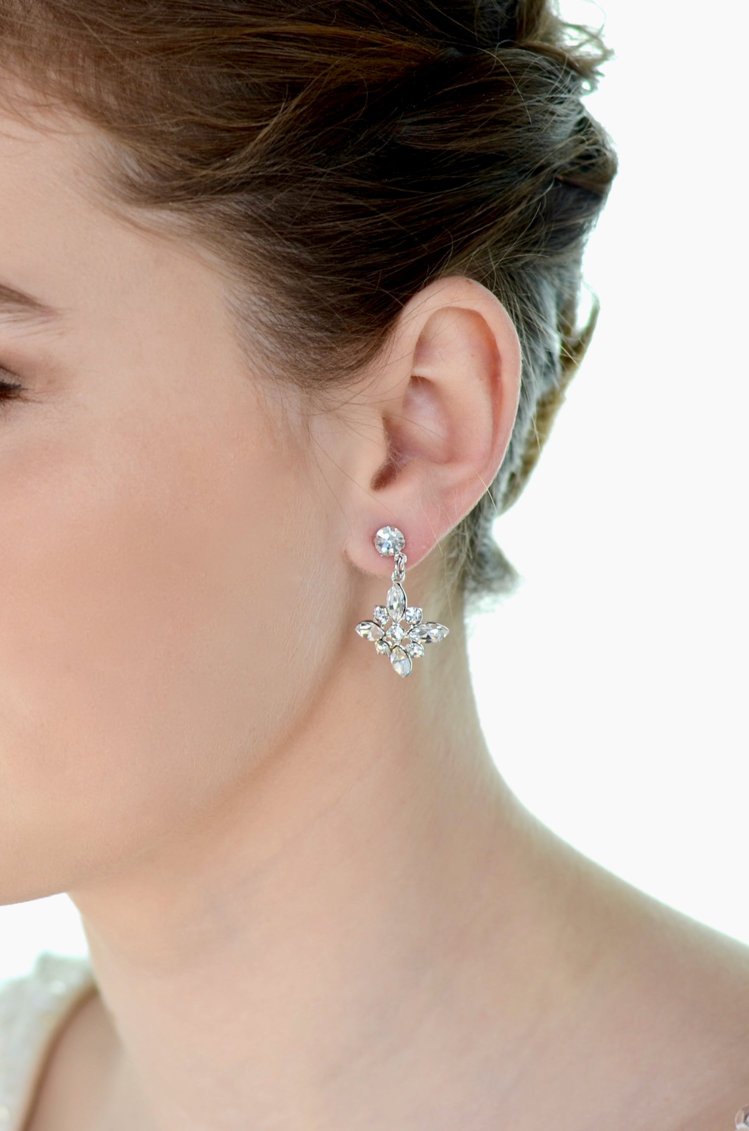 Made by hand in Australia this cross shape earring uses German parts with genuine Swarovski stones. Briar is a classic and charming quality Silver earring with four navette shaped stones and tiny round crystals the Briar Bridal Earring is a graceful asset to a Bride or Bridesmaids