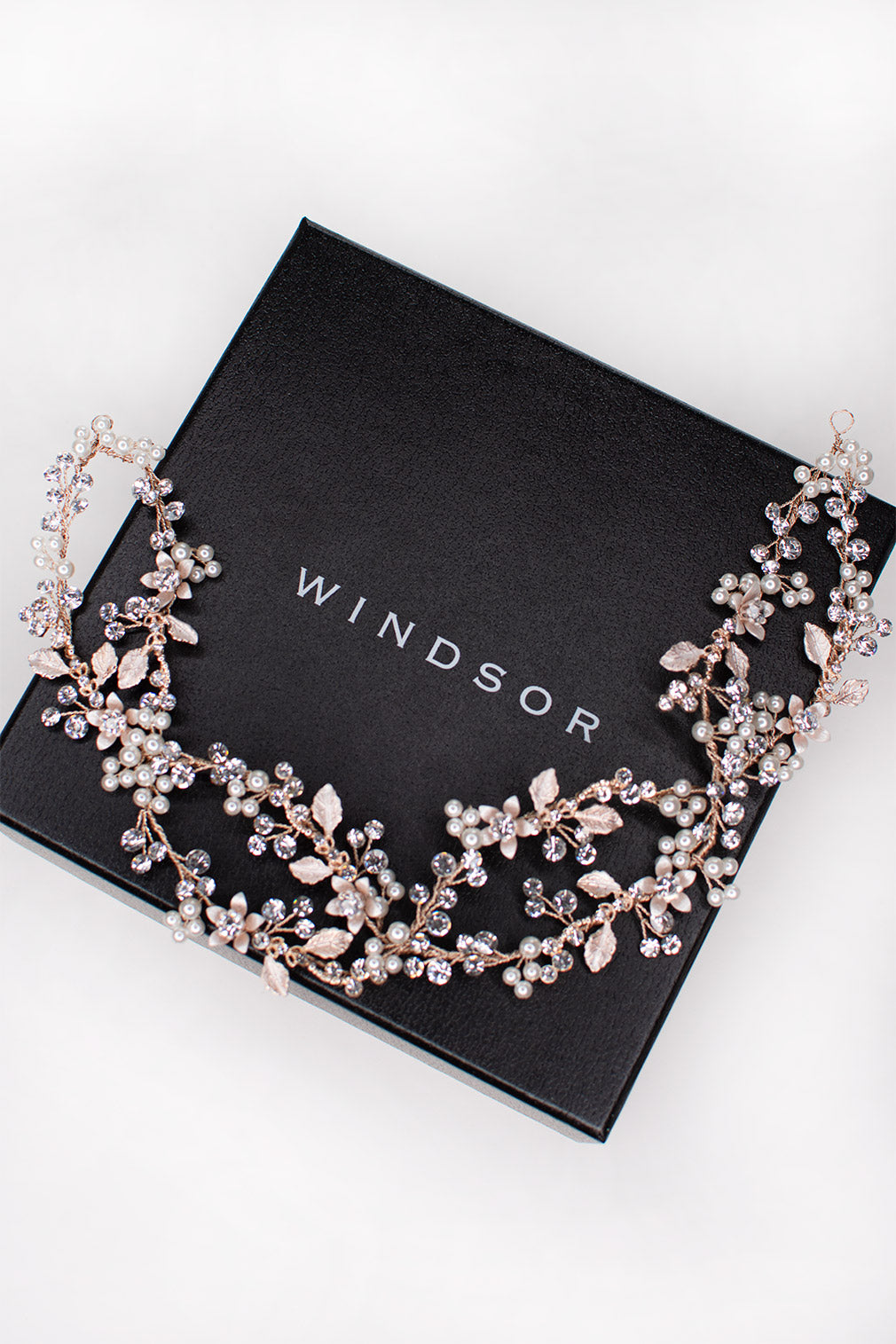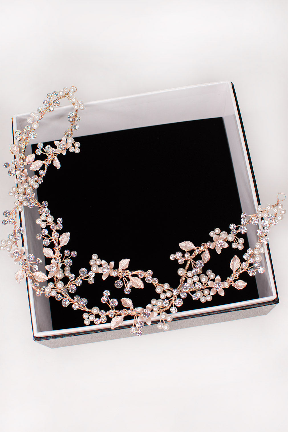 Angelic in its simplicity, the Carmella Twin is a beautifully decorated double row vine. Amongst the tiny sprigs of pearls and crystal, fine delicate leaves and metal flowers are entwined along the base. Hand-painted with a soft pearlescent sheen, these fine leaves gently glisten amongst the pearl and crystal detailing of Carmella creating an enchanting allure. Carmella is very flexible and can be woven or shaped to any hairstyle, featuring two small metal hooks on each end allowing for pins to secure the headpiece.