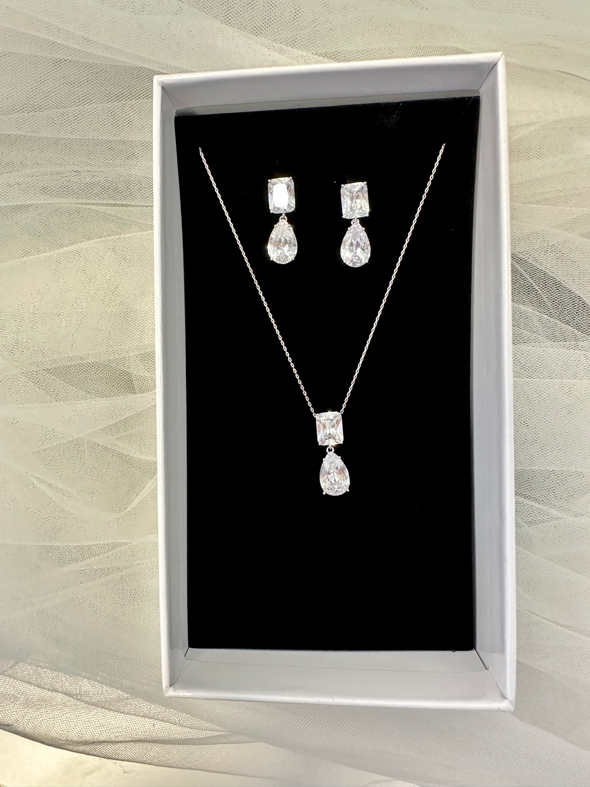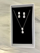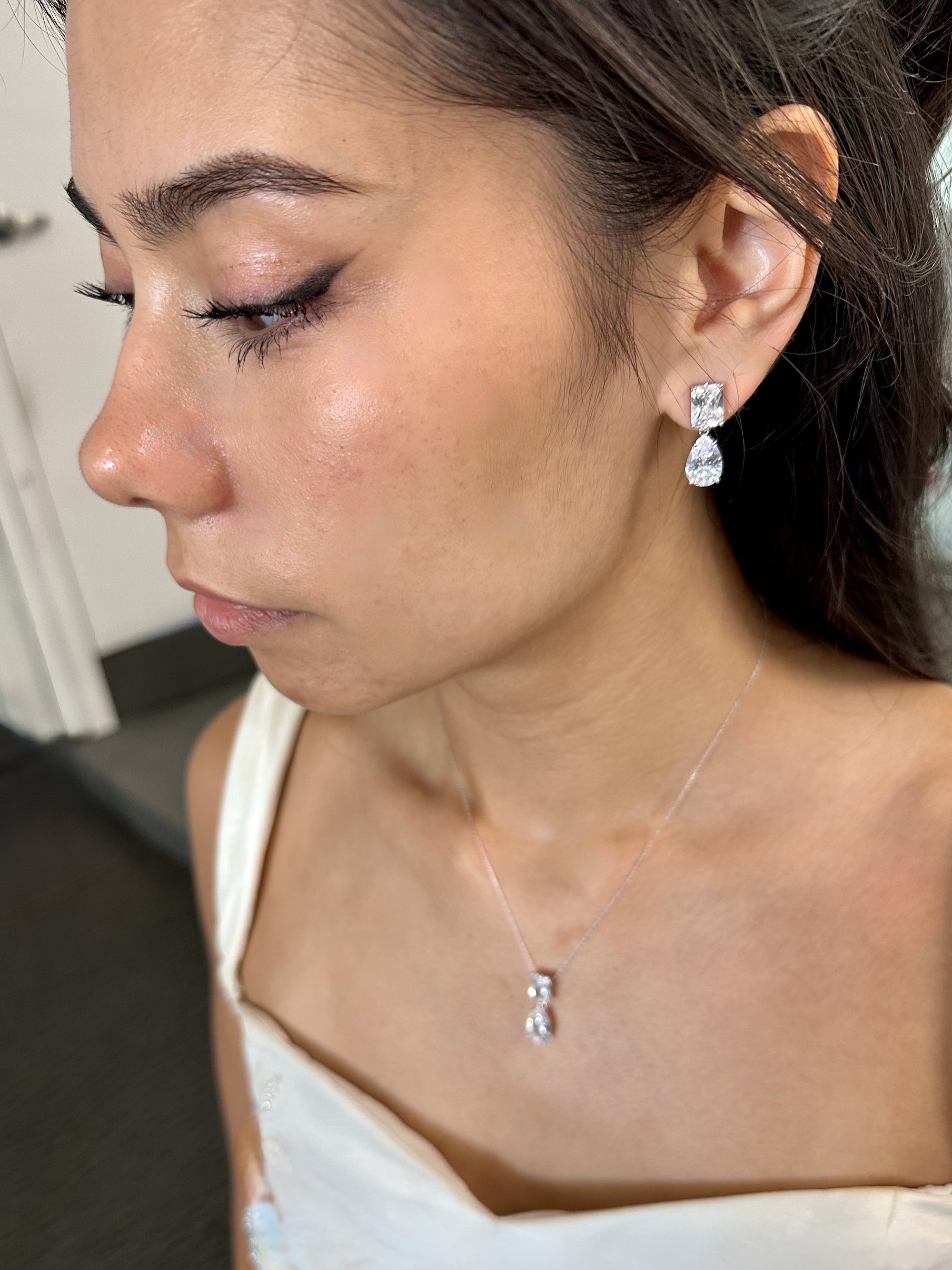 The Ada Necklace and Earrings set epitomises bridal elegance with its distinctive rectangle-to-teardrop design. Crafted from superior quality crystal stones, each piece captures and reflects light with remarkable brilliance, creating an enchanting sparkle that complements any wedding aesthetic. The all-crystal composition delivers the refined sophistication modern brides seek. Whether worn as a complete set or just the Ada Bridal earrings alone, these timeless pieces radiate understated luxury and grace for your most cherished moments.