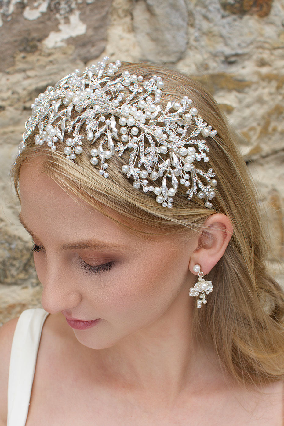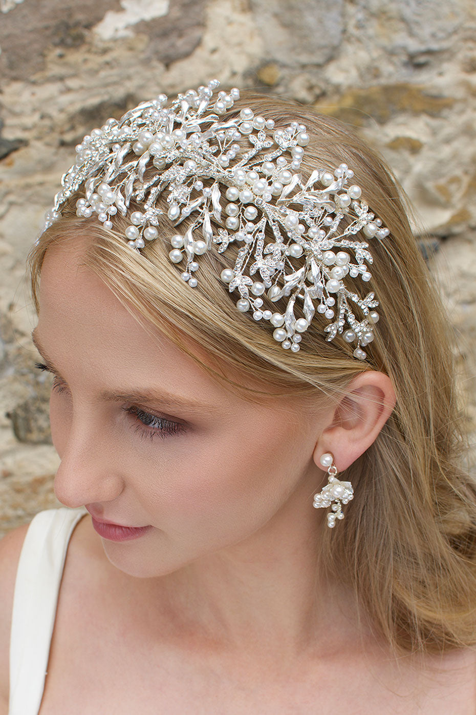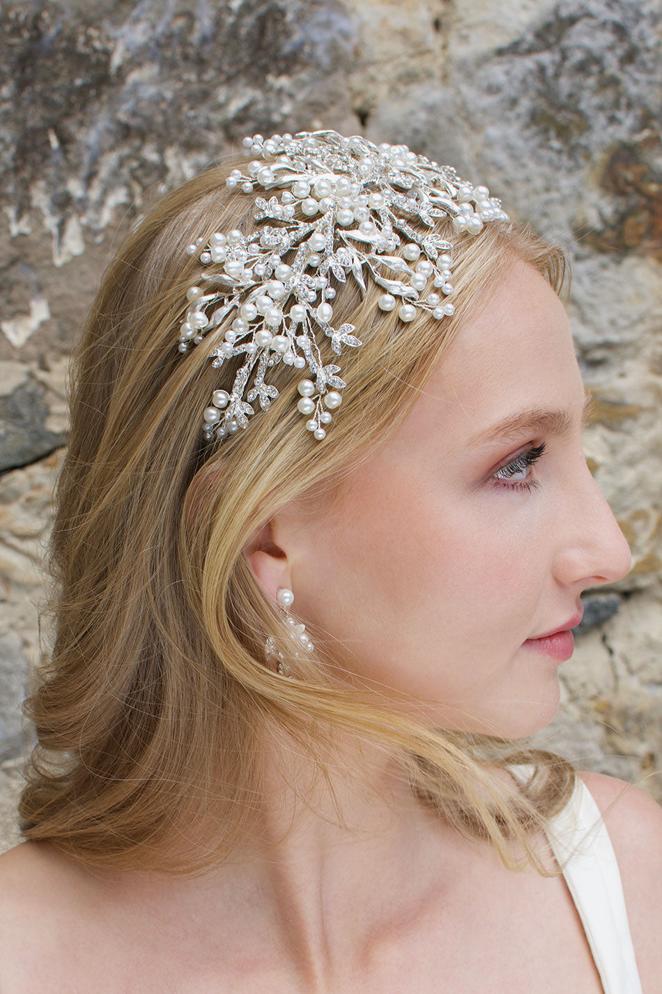 Alessandra adorns the head beautifully as the dainty materials stretch from the base to decorate the hair. The metal leaves are encrusted with dainty stones that sparkle and shine in the light, a perfect finishing touch for all bridal looks.