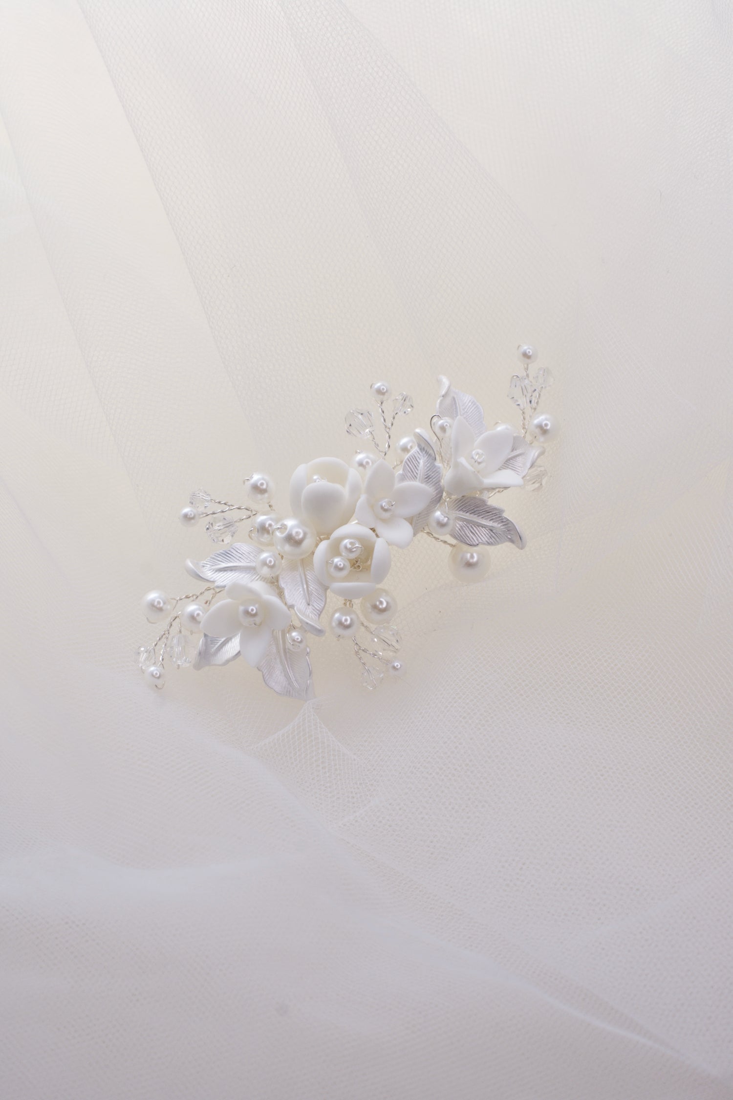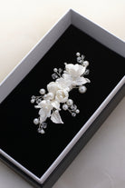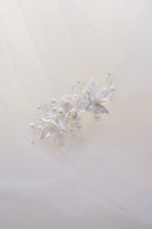 A angelic wave of pearl and porcelain, Angelina is a divine addition to your bridal look. Perfectly placed pearls, leaves and florals give this piece its ethereal name. Angelina is an easy to style headpiece; wear above your veil or place at the top of a bun. The ivory pearls and white ceramic pair perfectly with minimal gowns, and pick up on floral details. Feel the most divine on your your Wedding Day with Angelina.