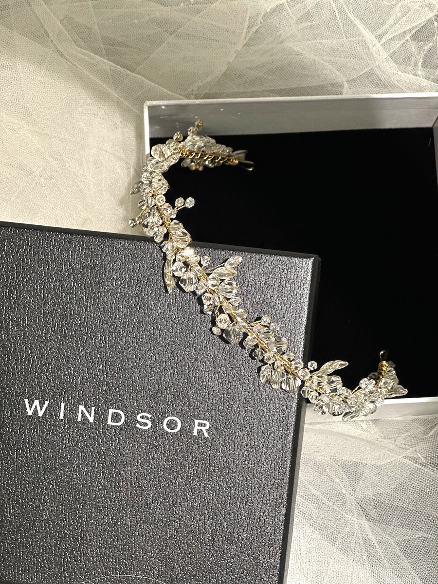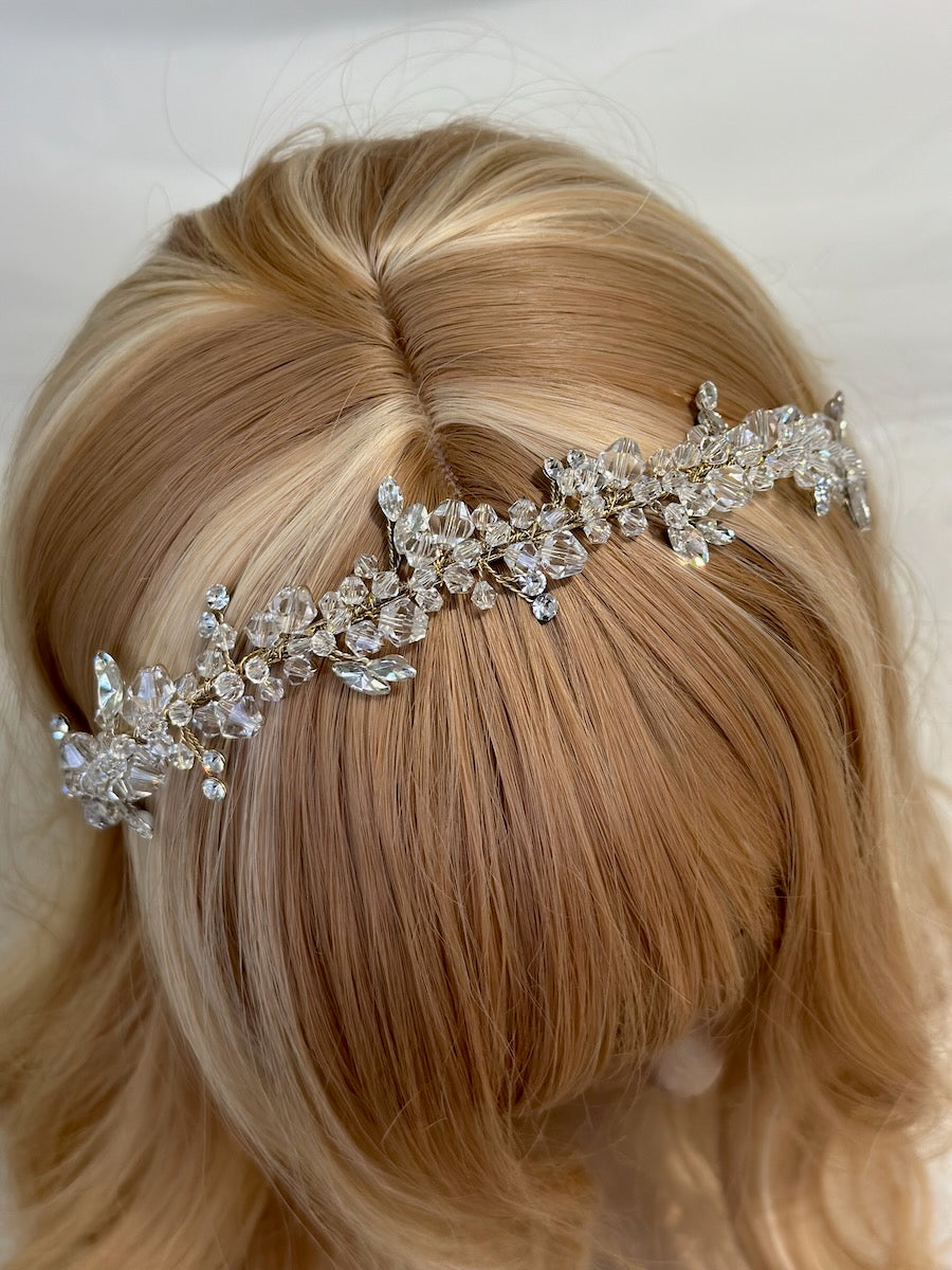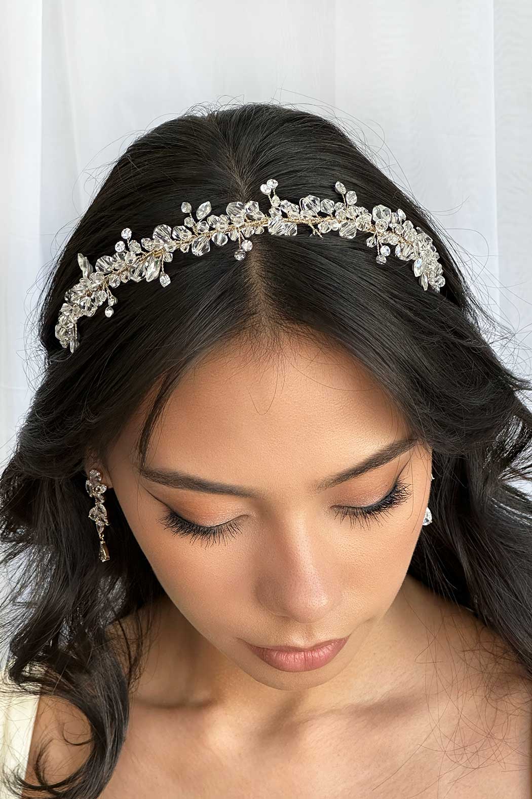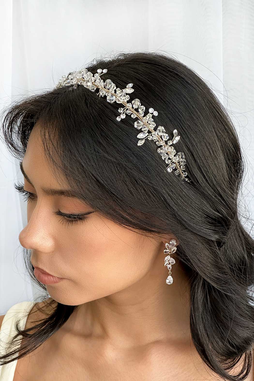 A delicate and stunning headband, Ariel features bunches of quality clear crystal sprigs and stones that adorn and outstretch along the entirety of the headband. With a soft golden base frame, Ariel is the perfect simple headband that will be the perfect touch to your bridal ensemble.