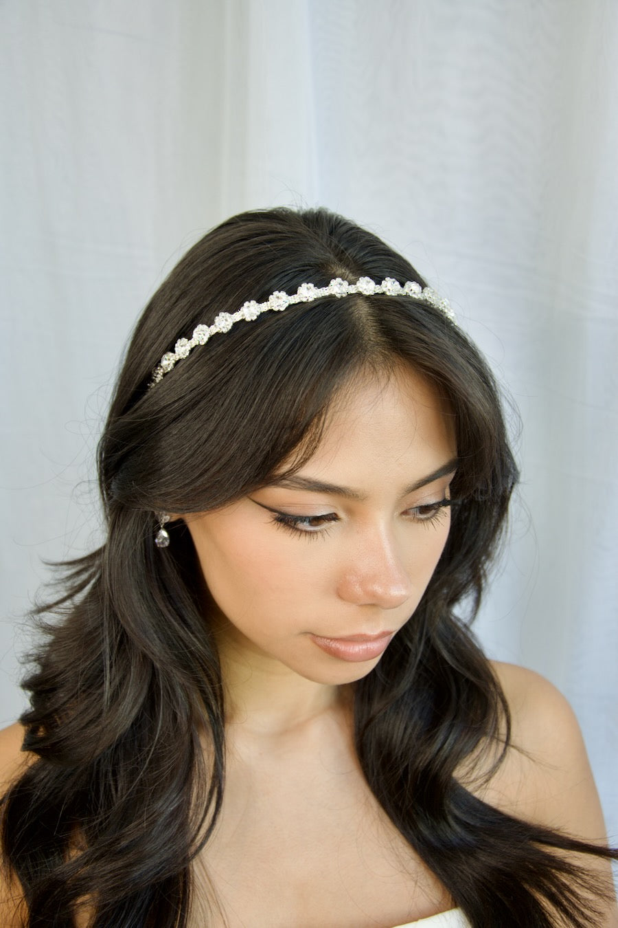 Astrid is that classic perfect headband for the Bride who just wants that extra touch for her Bridal look. Less than a centimetre wide Astrid adds that gleam of beauty to an elegant Bride. Crystals are nestled in a ring of tiny stones on a bright silver band.