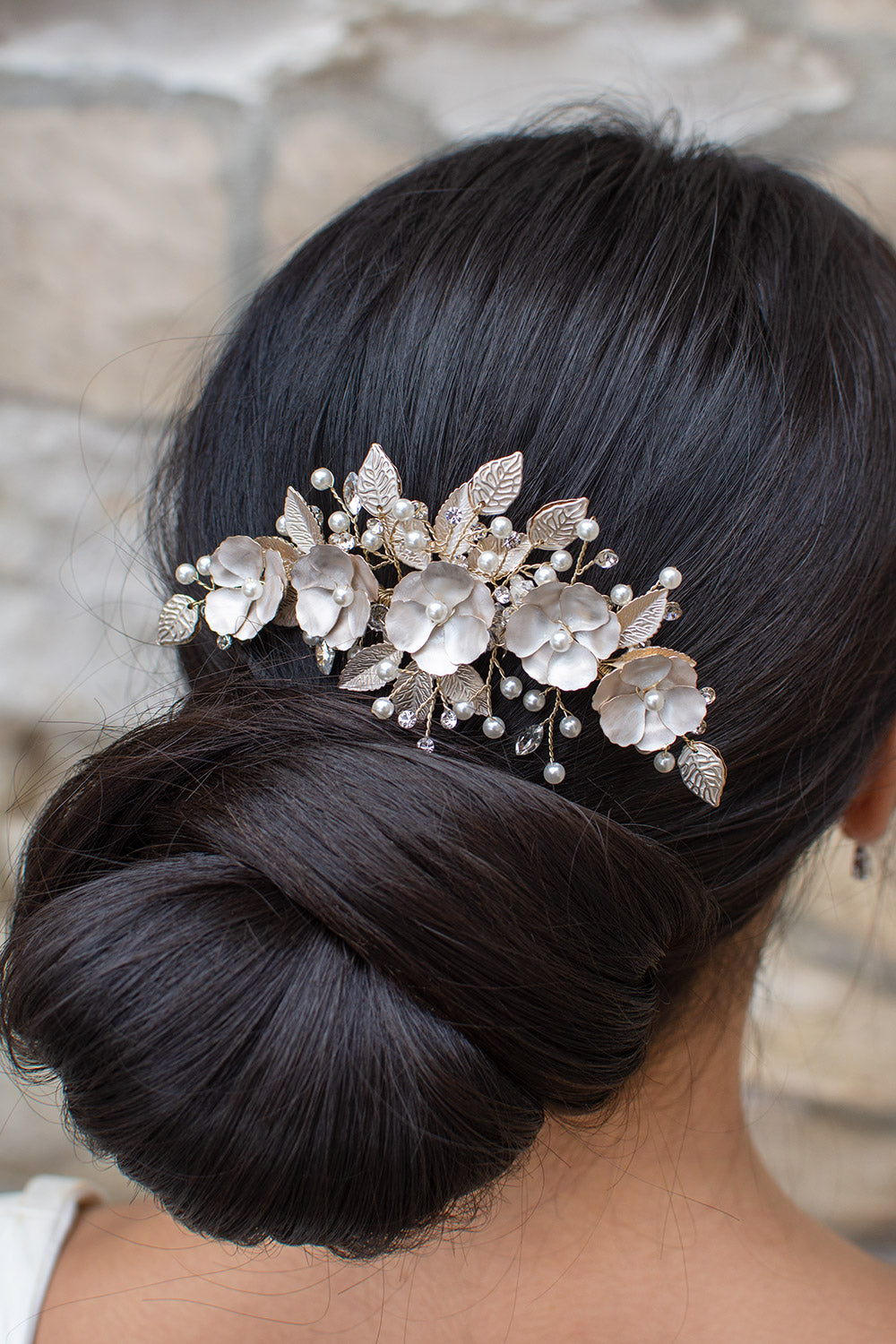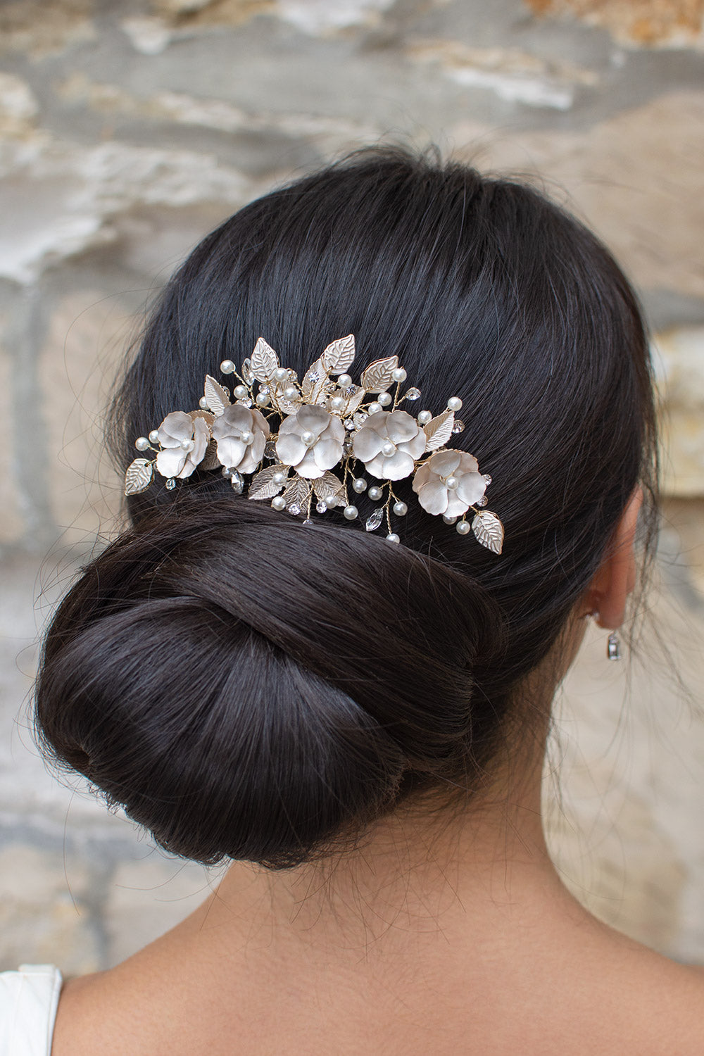 A beautiful and popular bridal side comb, Ava's sensational design features a delicate array of metal florals alongside gleaming Swarovski crystal and pearl sprigs. Ava's five centrepiece metal flowers are hand painted with a pearlescent gold finish which gracefully glimmer in the light, forming a natural arching shape to compliment the head. In addition, Ava comes fitted with a secure comb fitting at the back for an easy and comfortable wear; a perfect accessory for brides, bridesmaids and flower girls alike.