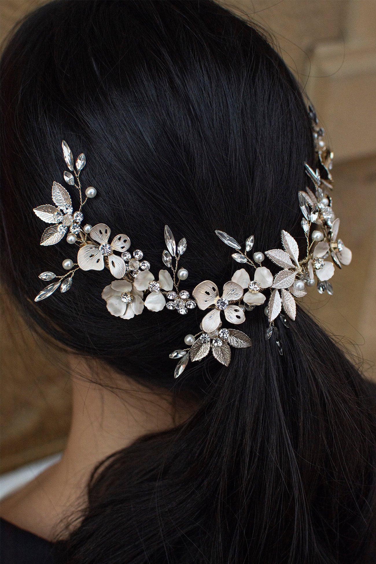 The vine version of the Bianca side comb, Bianca Double is perfect for a look with refined elegance. An array of delicate petals and leaves stretch around to decorate the head with the extra touch of grace and glamour every bride strives for. If you are looking for a hint of sparkle, Bianca is the perfect choice.
