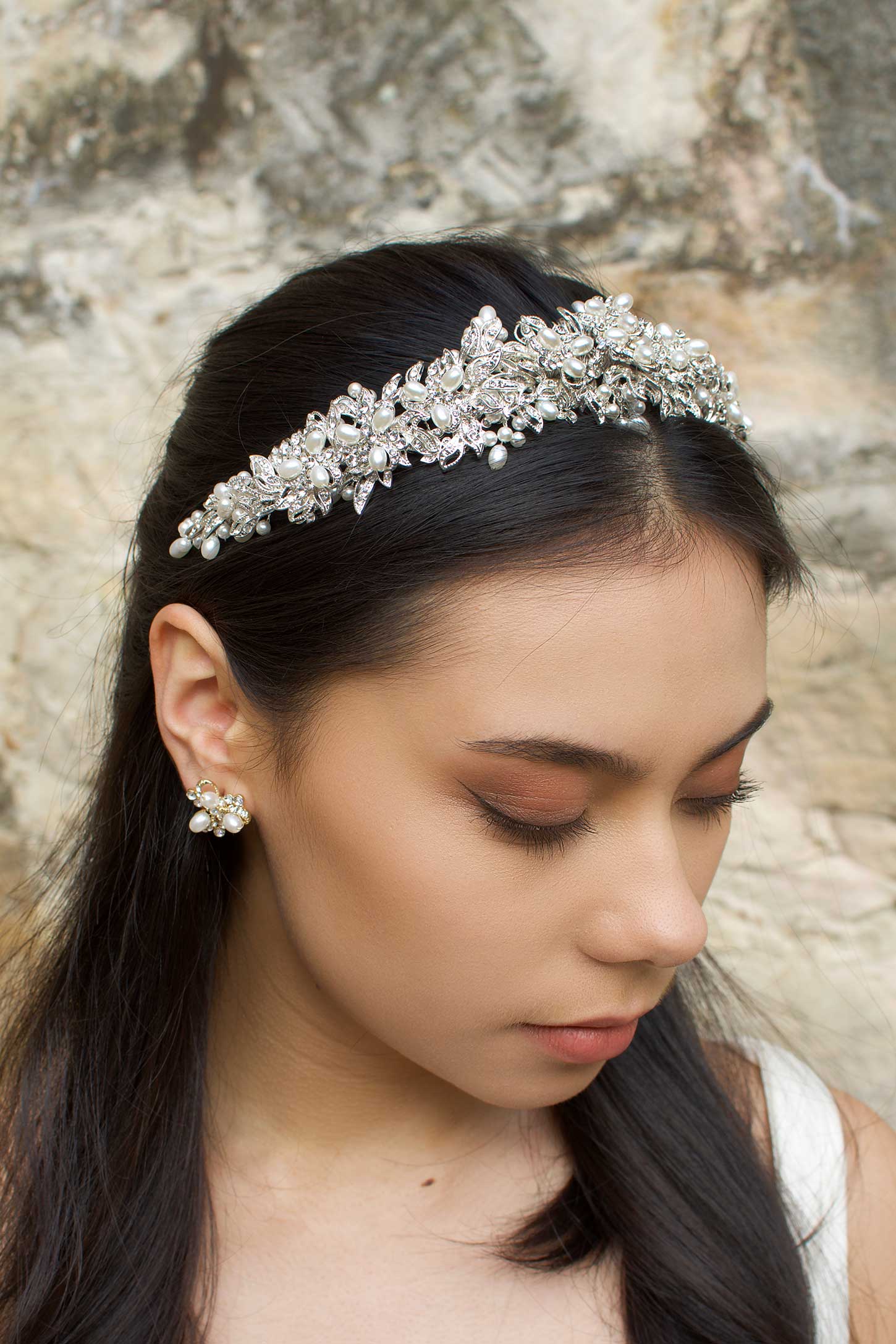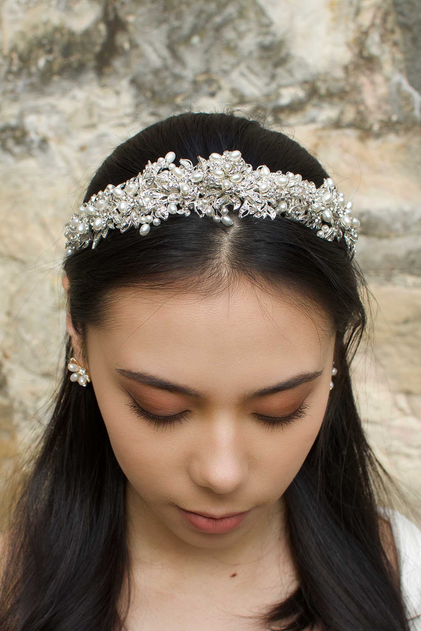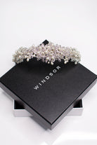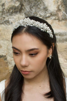 An incredibly detailed piece, Caroline's components are magnificently layered in a 3D-effect which rises to the peak of the crown. Layers of encrusted open-leaves outstretch from the centre-out, flowing down the band of the piece; with the central area adorned in pearls that are additionally featured as pearl sprigs throughout the entirety of the crown. Caroline's crystals brightly gleam in their elegant tapered style, sure to catch the admiring-eyes of many.