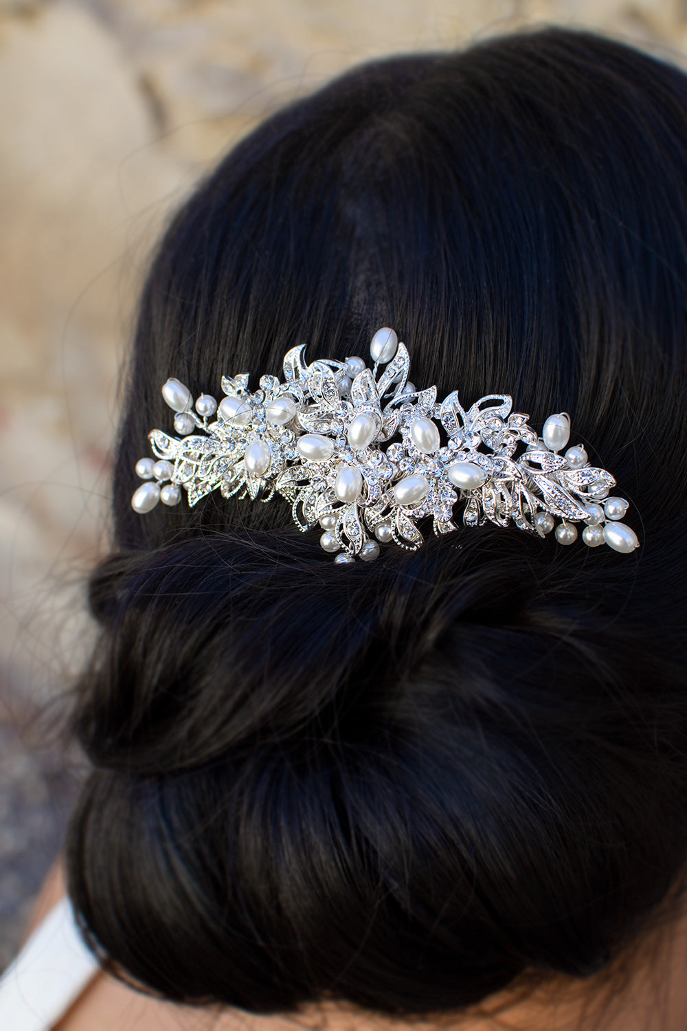 The Caterina side comb matches with the Caroline headband and the Marie-Sue earring. The comb fitting is gently curved to fit the shape of your head. You can also adjust this yourself a little if needed.