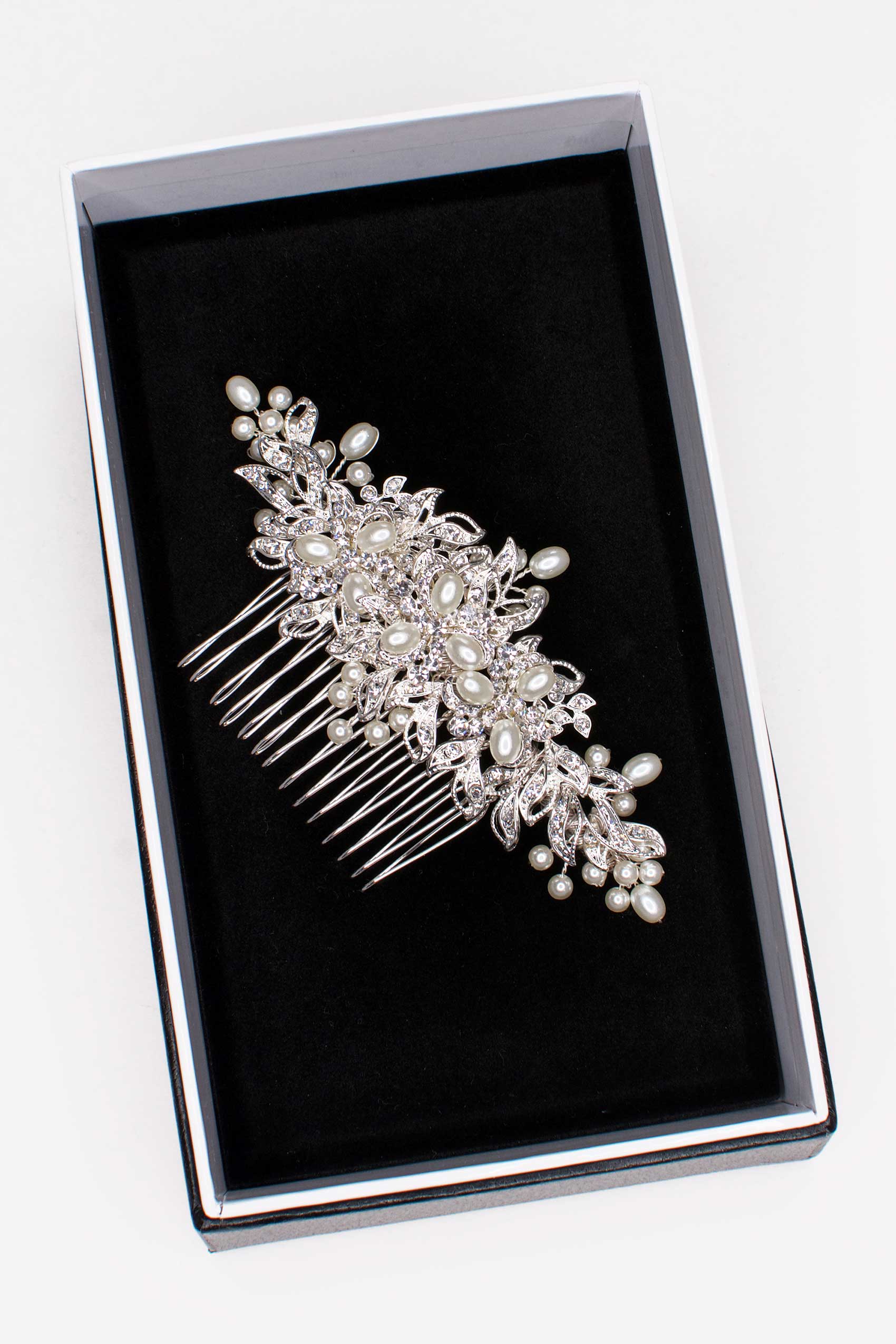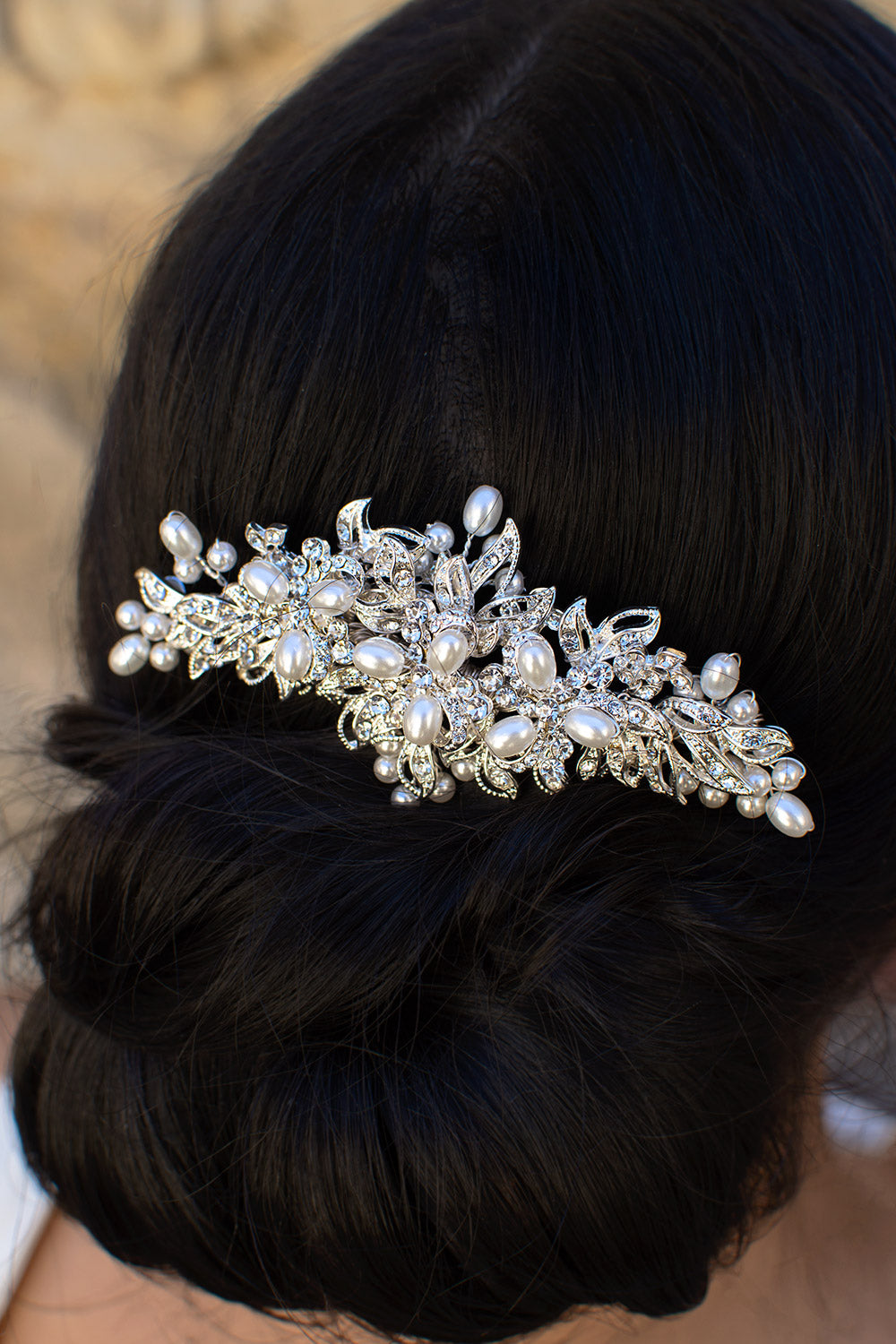 Caterina is a gorgeous curving silver side comb featuring an awe-inspiring display of pearls and crystal-encrusted filigree, putting this piece is in a class of its own. Caterina comes fitted to a hair comb to seamlessly slide into place. So let Caterina lead from the top as you make your way down the aisle on your dream wedding day.