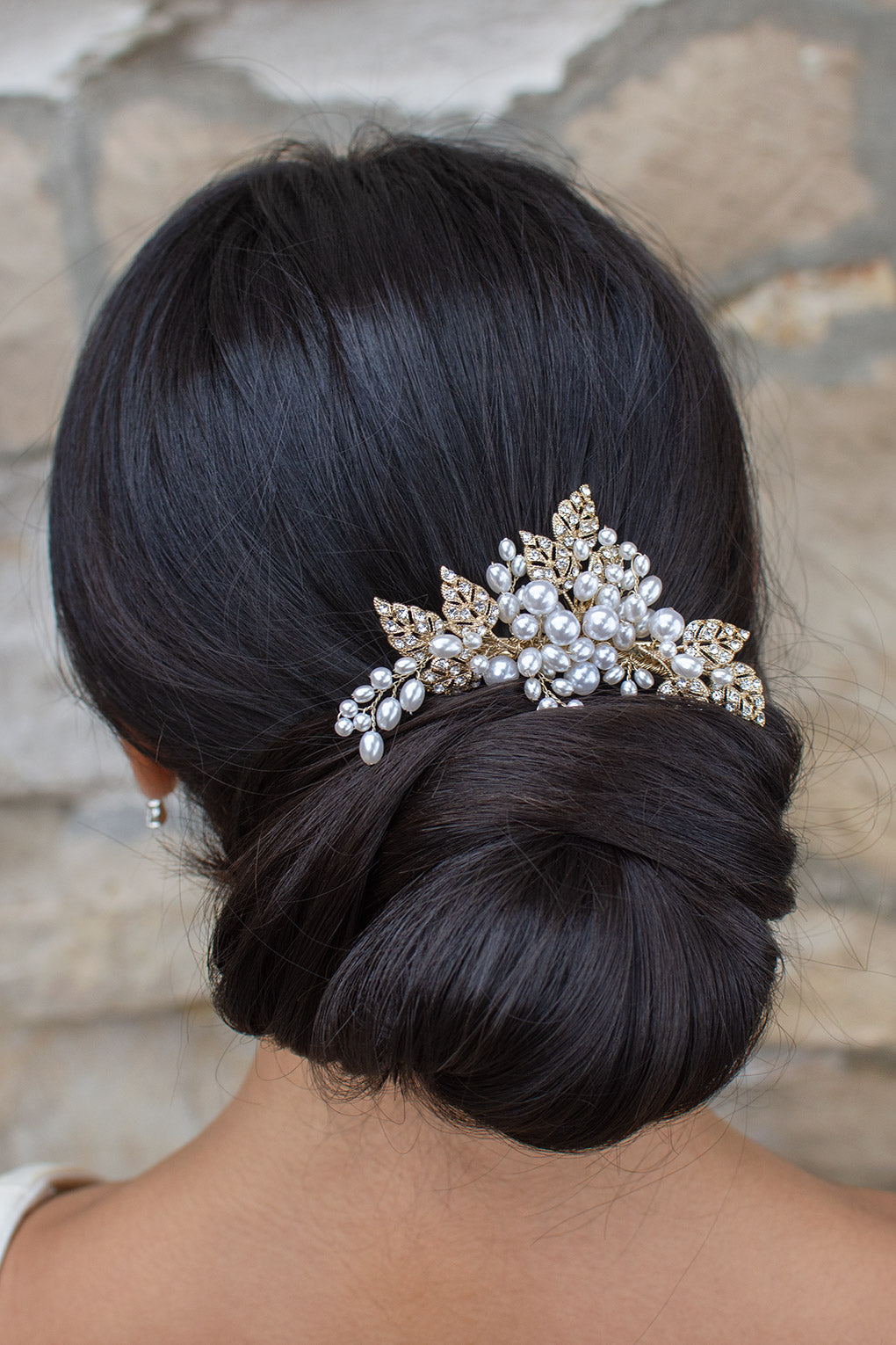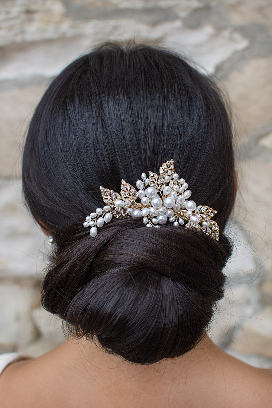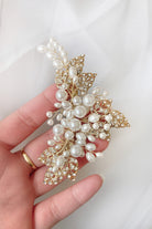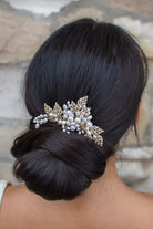 An elegant array of encrusted pale gold leaves and beautiful quality pearls, Charlotte is a simply charming sidepiece. Intertwined with subtle crystal and bead detailing, Charlotte's arrangement of metal leaves and pearls are backed by a secure clip fitting that allows for easy and secure wear all day long. Let Charlotte's understated elegance and quality make you stand out and shine.
