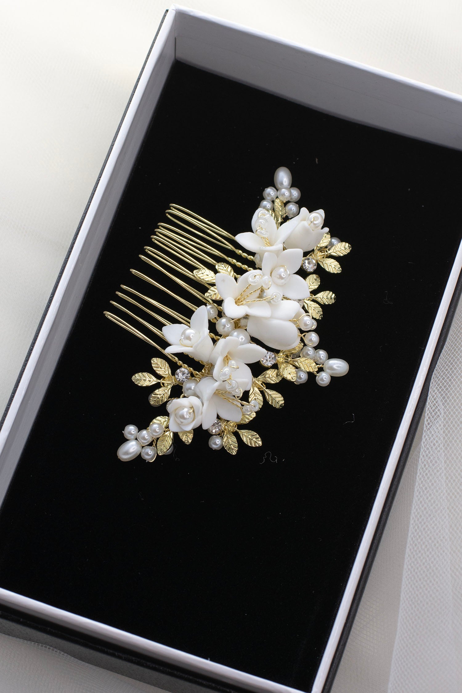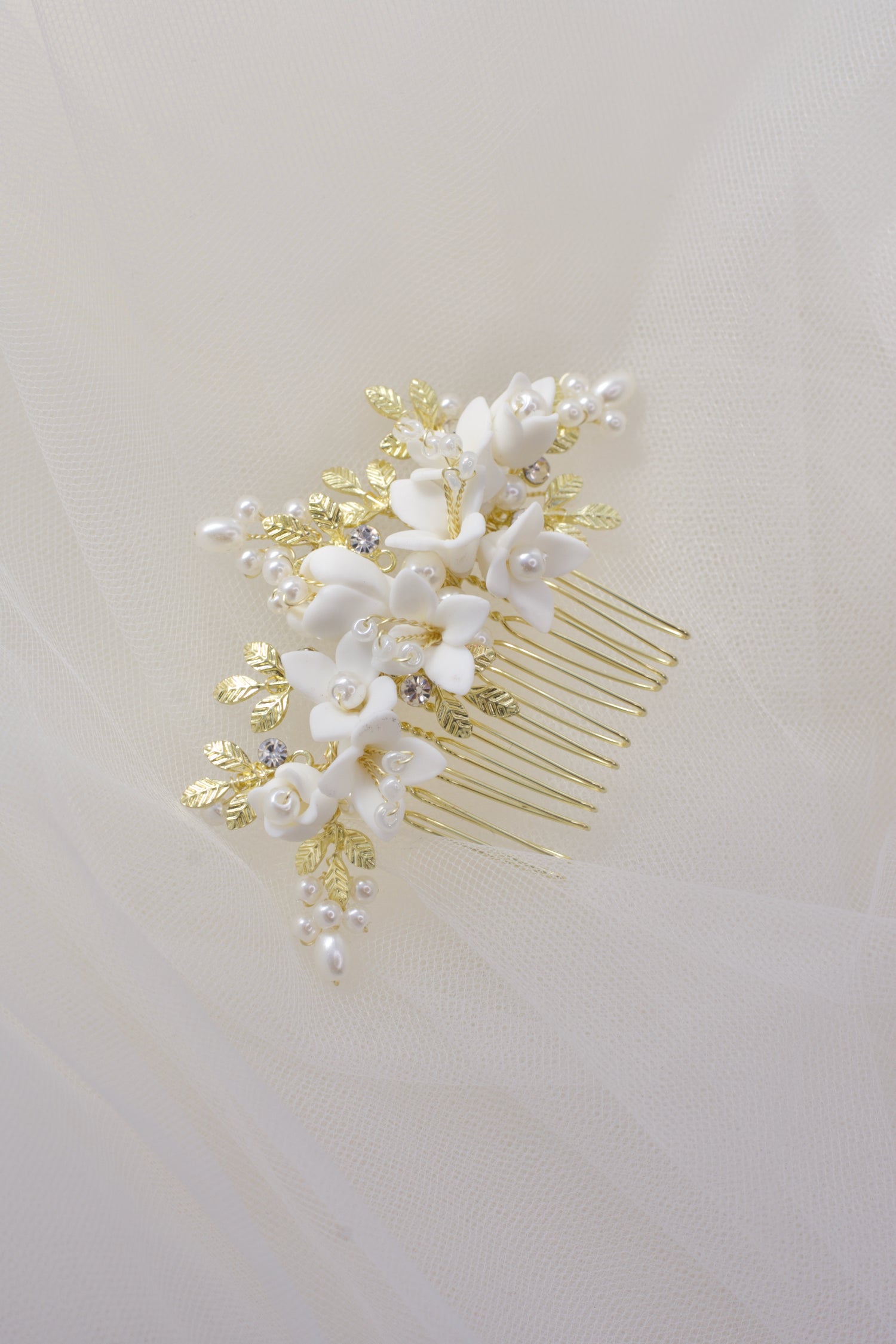 Perfect for the back of the bun, the Christina Comb is a gorgeous porcelain floral arrangement that suits all Bridal Styles. If you're looking for a piece to feature above your veil, Christina is the perfect size and weight. Wear her all night long, even after you take off your veil! Suitable for all Bridal styles- Modern Brides and Fairytale Brides alike. Let it be the wedding of your dreams with the Christina Comb.