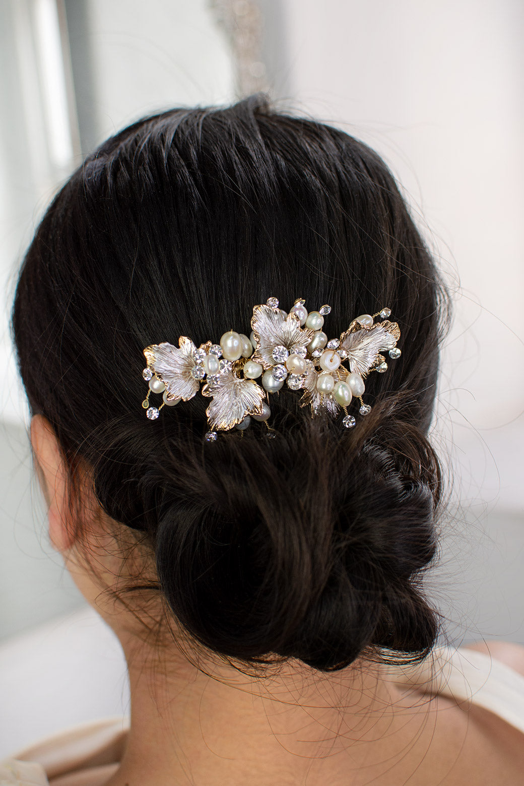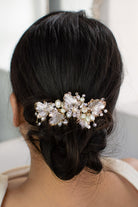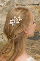 Cilla is a two tone side comb with soft pearlised leaves with fine gold tipped edges surrounded by a halo of real freshwater pearls with tiny bright crystals. With a comb fitting Cilla is a smaller size side comb and a perfect match for beach or garden style Bridal looks, matching perfectly with champagne tone dresses.