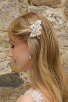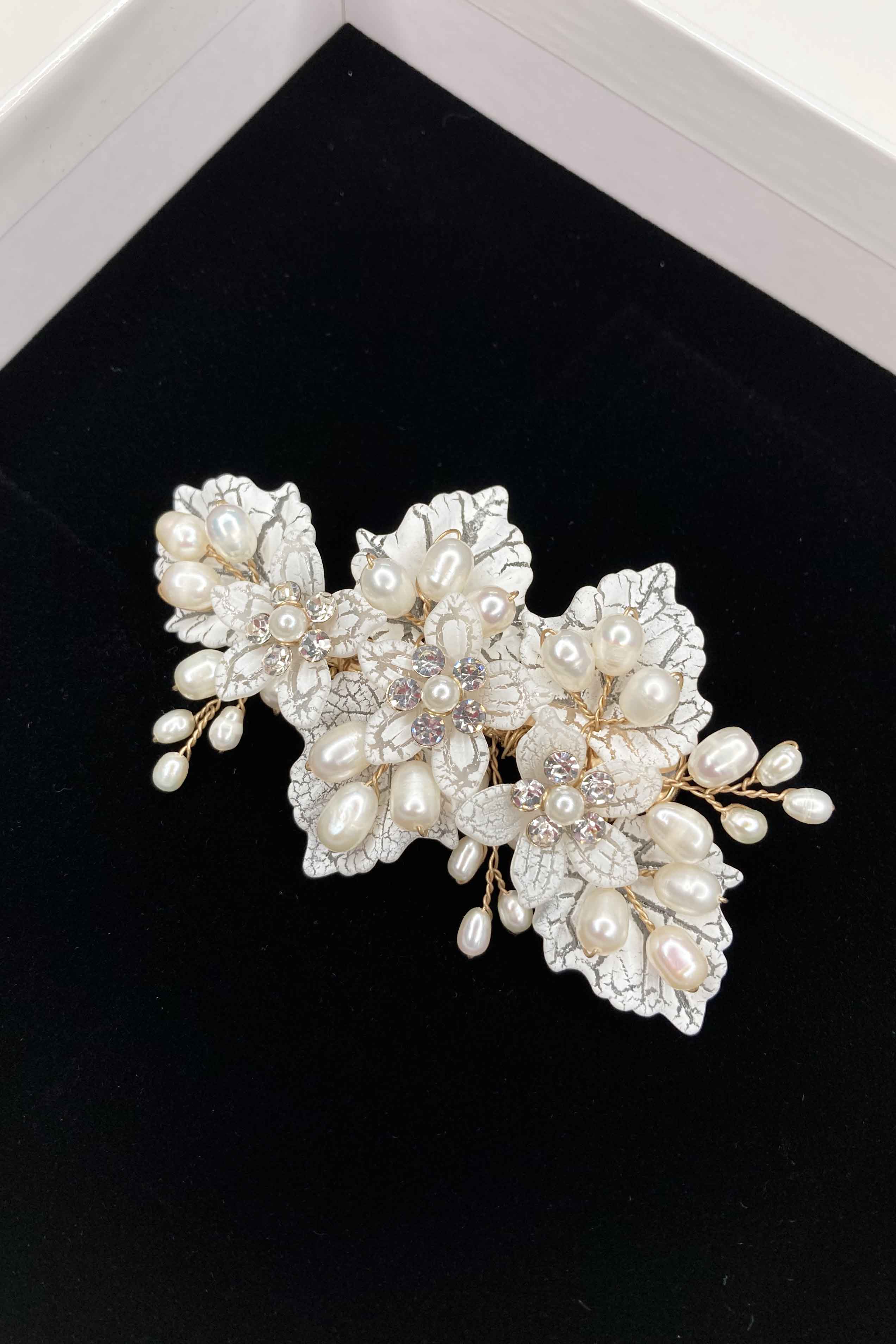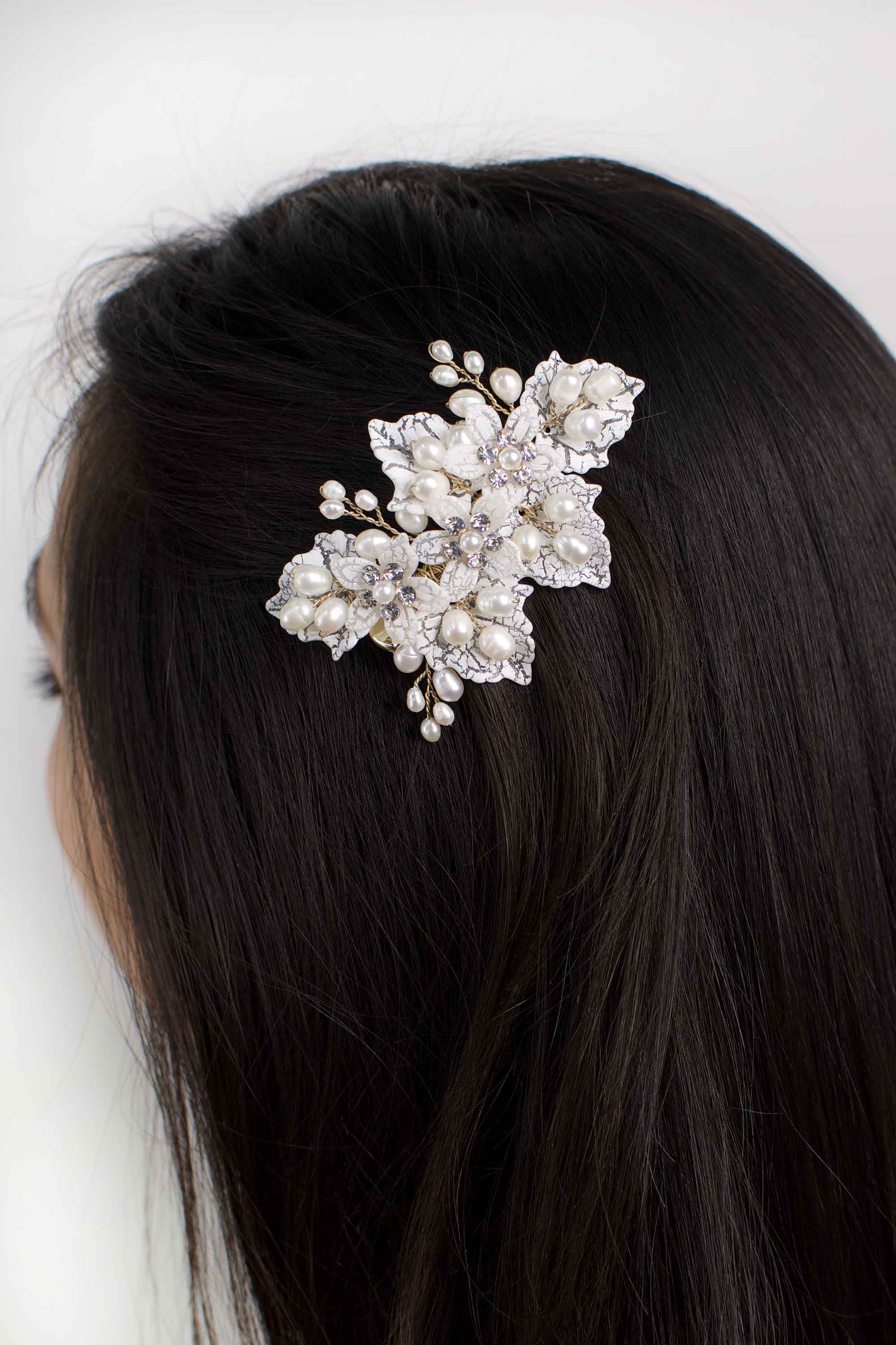 Dawn is a delicate side clip featuring a white and transparent crackled leaf finish. Three flowers form the centre of the piece and feature a pearl centre surrounded by small crystals. Dawn uses real freshwater pearls throughout. Each pearl is a unique oval shape and are naturally formed. The pearls have been woven with gold wire  framing the flowers. The combination of the ivory white pearls, gold wire and white florals gives a wondrous gleam perfect to top a bridal bun hairstyle.
