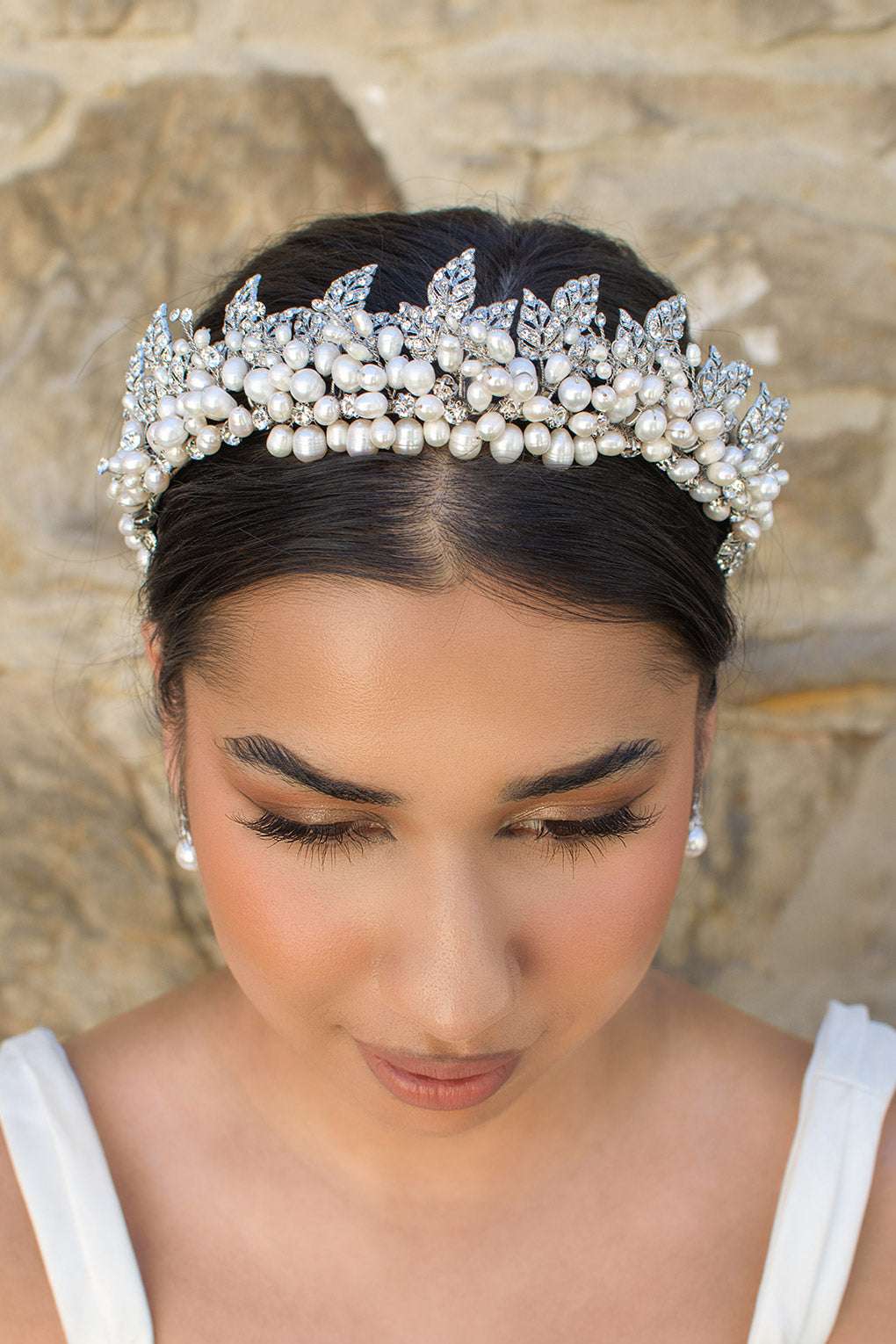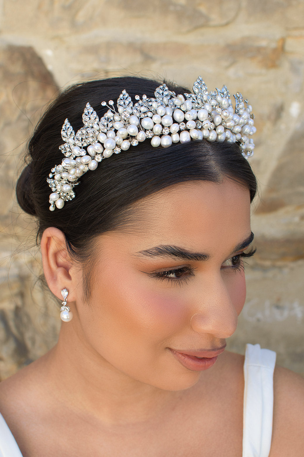 With a wide swathe of authentic freshwater pearls backed by rhodium leaves encrusted with a sprinkling of starry crystals, Eden is a natural and soft, medium height bridal crown truly worthy of its name. Eden will be your crowning glory as you make your way down the aisle with its natural elegance and grace adorning your head. Eden is made in the darker Silver finish called Rhodium. This slightly darker finish makes the tiny crystals glint and gleam and is often used in high end quality pieces.