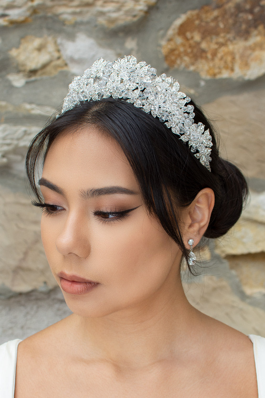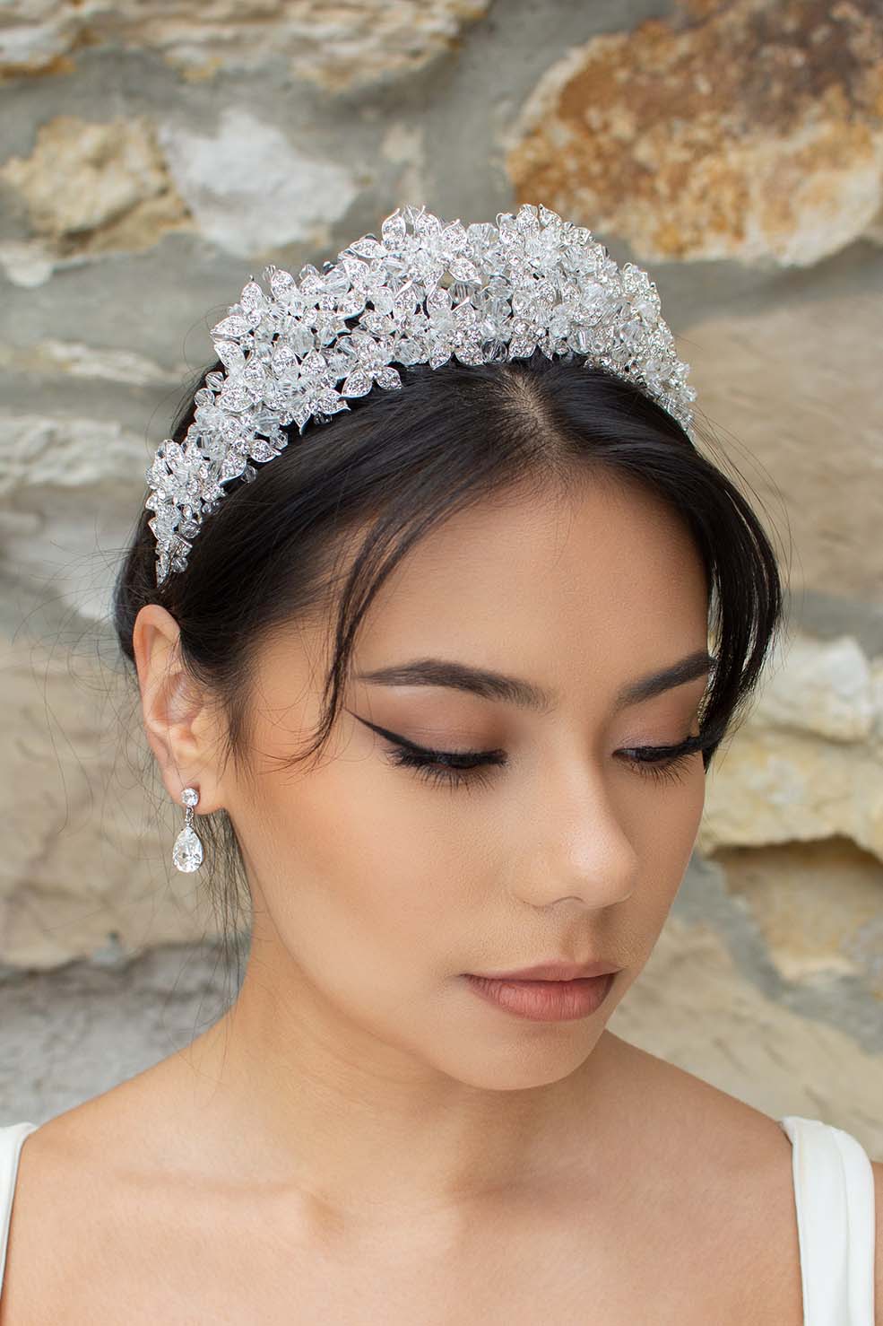 This Classic Magnificent Bridal Tiara is a dream come true featuring a symphony of shining crystal, floral details and soft silver leaves. Edwina Double is sure to be the crowning glory of your big day and make you look and feel wonderful. Edwina is easily reshaped so you can adjust the shape to suit your style because of the special headband we use to make it very comfortable to wear. A lovely and elegant bridal tiara encrusted with lovely clear crystals Edwina is all about exquisite crystal embellishment. Edwina is the good luck charm you’ll want to be wearing as you float down the aisle in front of so many happy admiring glances.