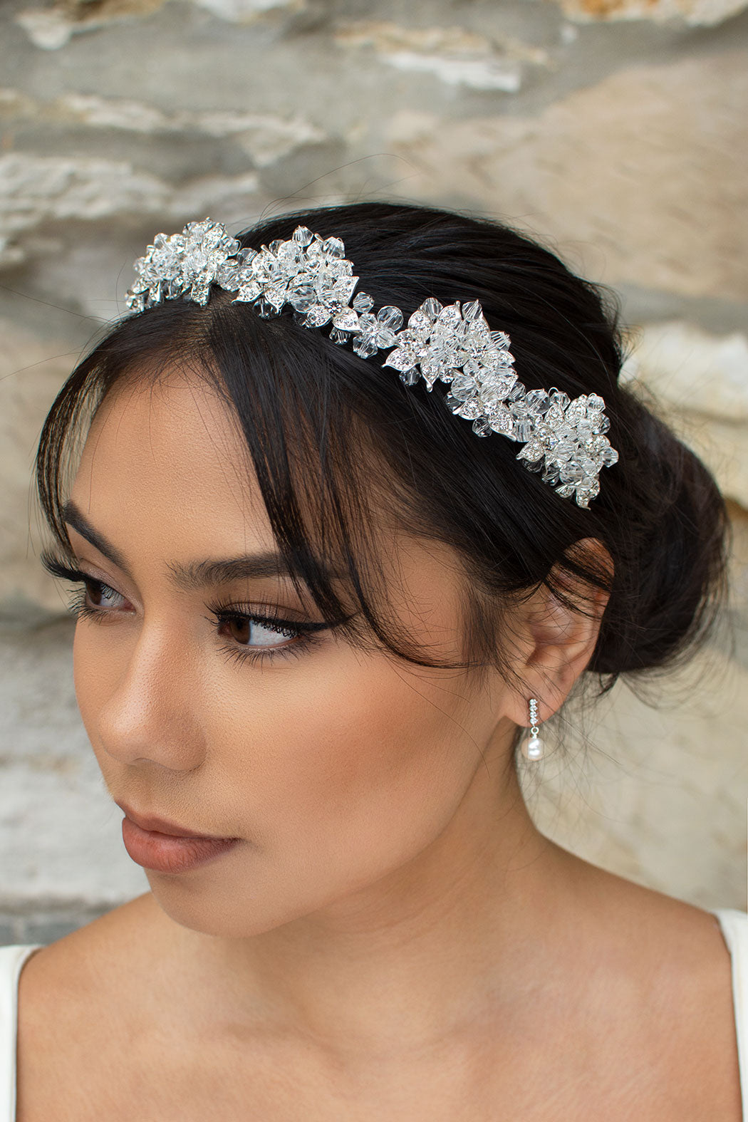 This tiara is what bridal dreams are made of featuring a symphony of crystal, floral details and bright silver leaves. Whether you choose to wear this versatile design as a traditional tiara or a bridal headband, it is sure to be the crowning glory of your big day and make you look and feel wonderful. Edwina is easily reshaped so you can adjust the shape to suit your style because of the special headband we use to make it very comfortable to wear. A magnificent bridal headband or low-rise bridal tiara encrusted with lovely clear crystals. Edwina is all about exquisite crystal embellishment. Edwina is the good luck charm you’ll want to be wearing on your way down the aisle.