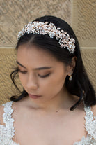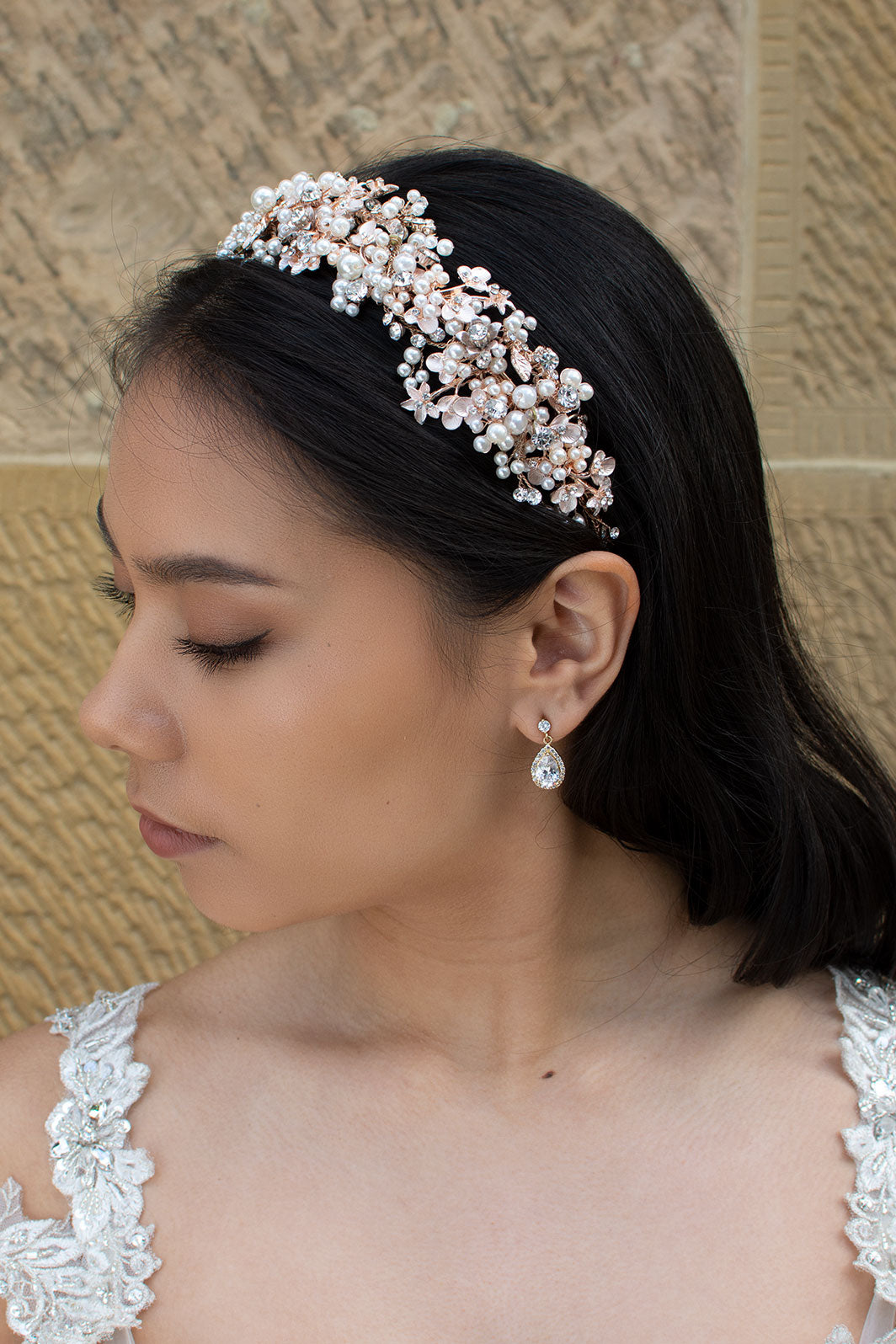 Our beautiful Elizabeth headband is a wide-set design featuring an angelic array of crystals, pearls and rose gold pearlescent motifs. Elizabeth is an ornate wide headband that arches over your head with hundreds of diverse pearls. Twisted among the branches of pale rose gold peep out small circular crystals, some encased by rose gold pearlescent floral motifs. Elizabeth is a truly angelic pearl headband which follows an organic form. Elizabeth is soft and flexible and can be easily moulded to the shape of your head without pressure.