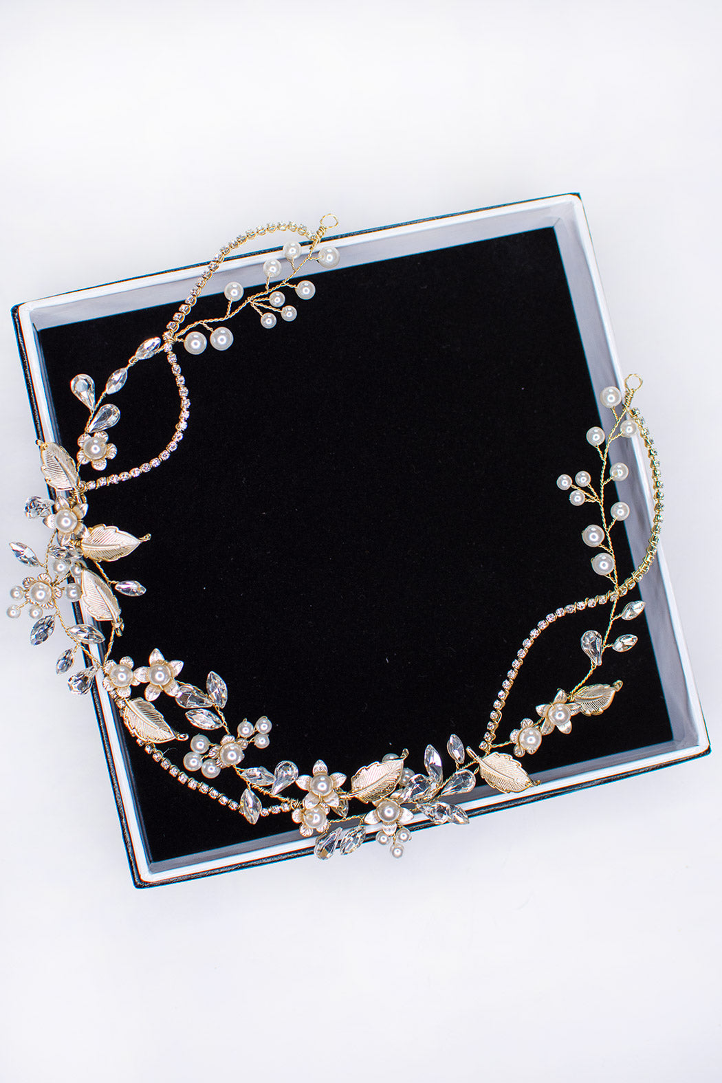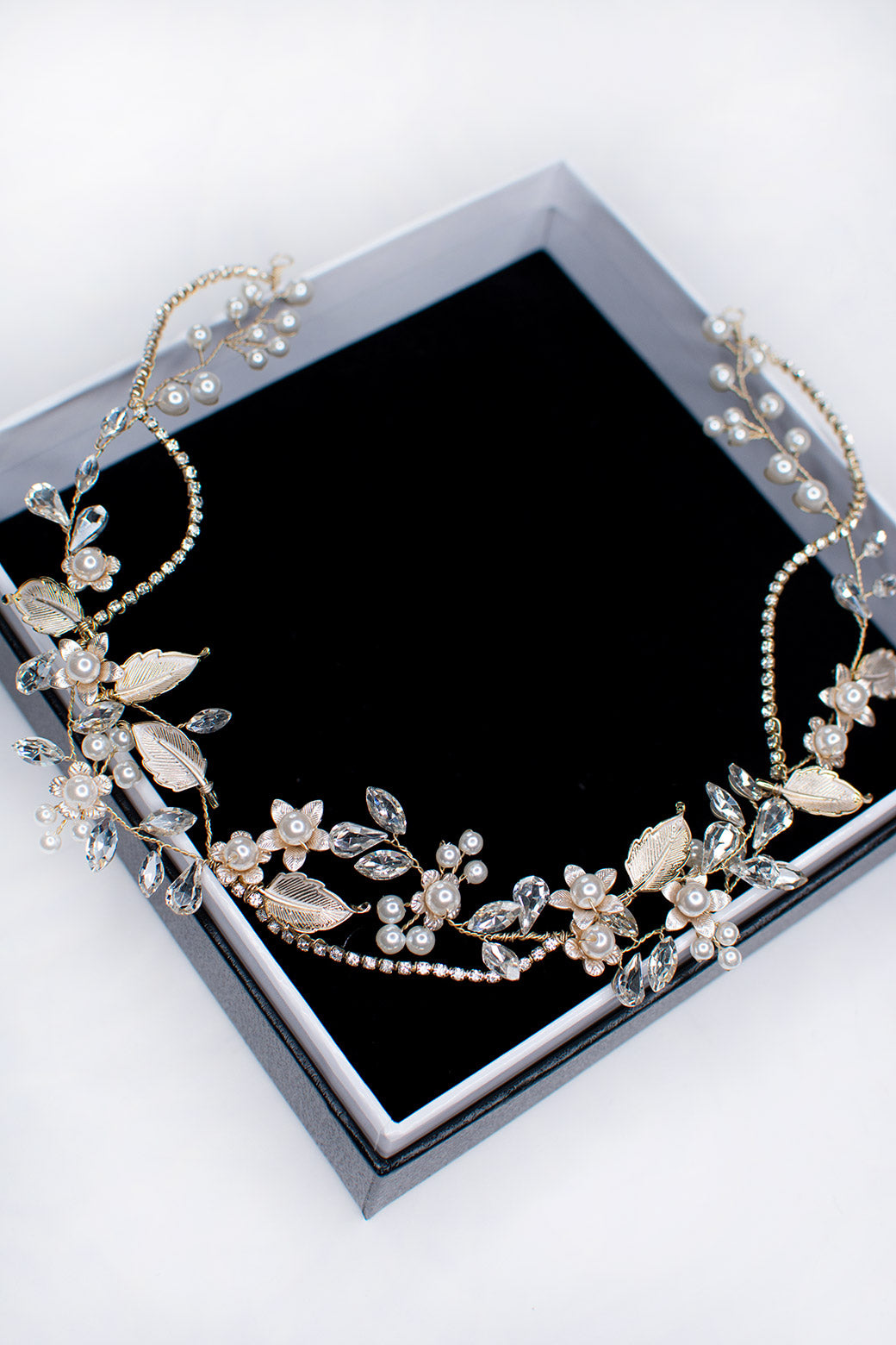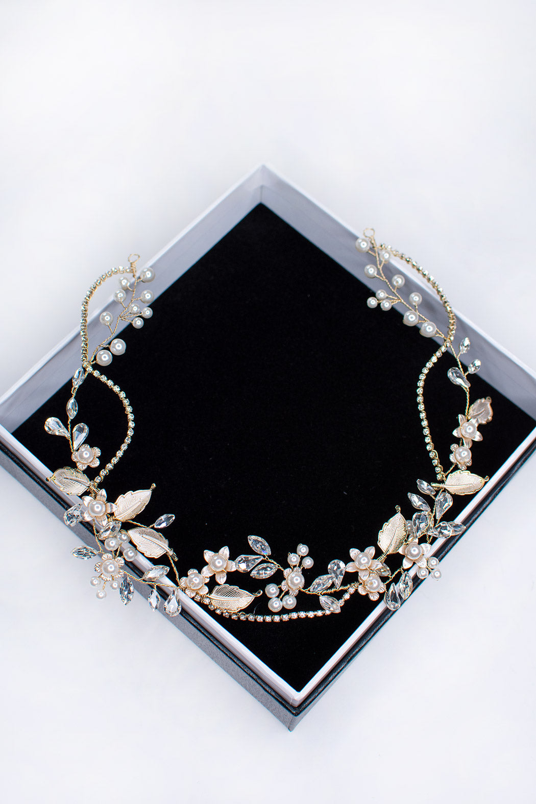 A beautiful boho style bridal vine, Elle will adorn your bridal hairstyle with a symphony of sparkling leaves, shimmering flowers and gorgeous crystal and pearl beading. Elle can be worn around the head, around a bun or anywhere on the head due to its flexible design. Be the bohemian princess of your bridal dreams as you walk down the aisle wearing this stunning piece.