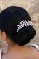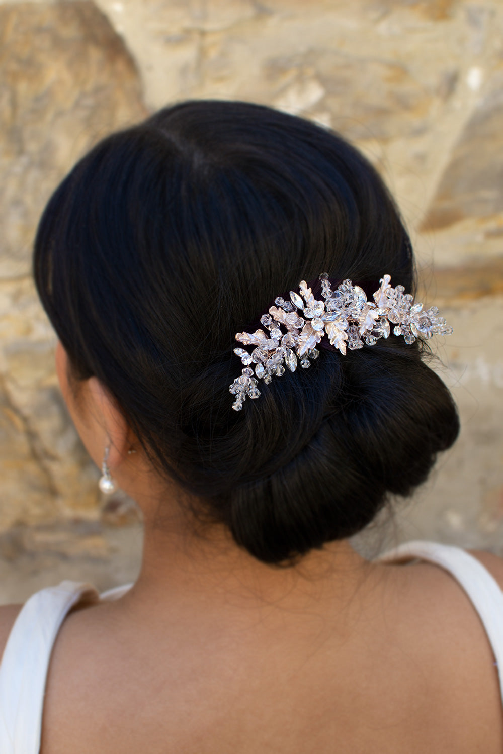 Clear crystals and fine pale rose gold leaves the Eloise side comb will complement your bridal hairstyle with understated elegance. A collection of clear crystal and bead sprigs create a cluster effect alongside long delicate metal leaves. Eloise is a perfect piece for a bride who doesn't want anything "too much", yet still wants just a little sparkle on their big day. With a clip fitting Eloise is comfortable and secure.