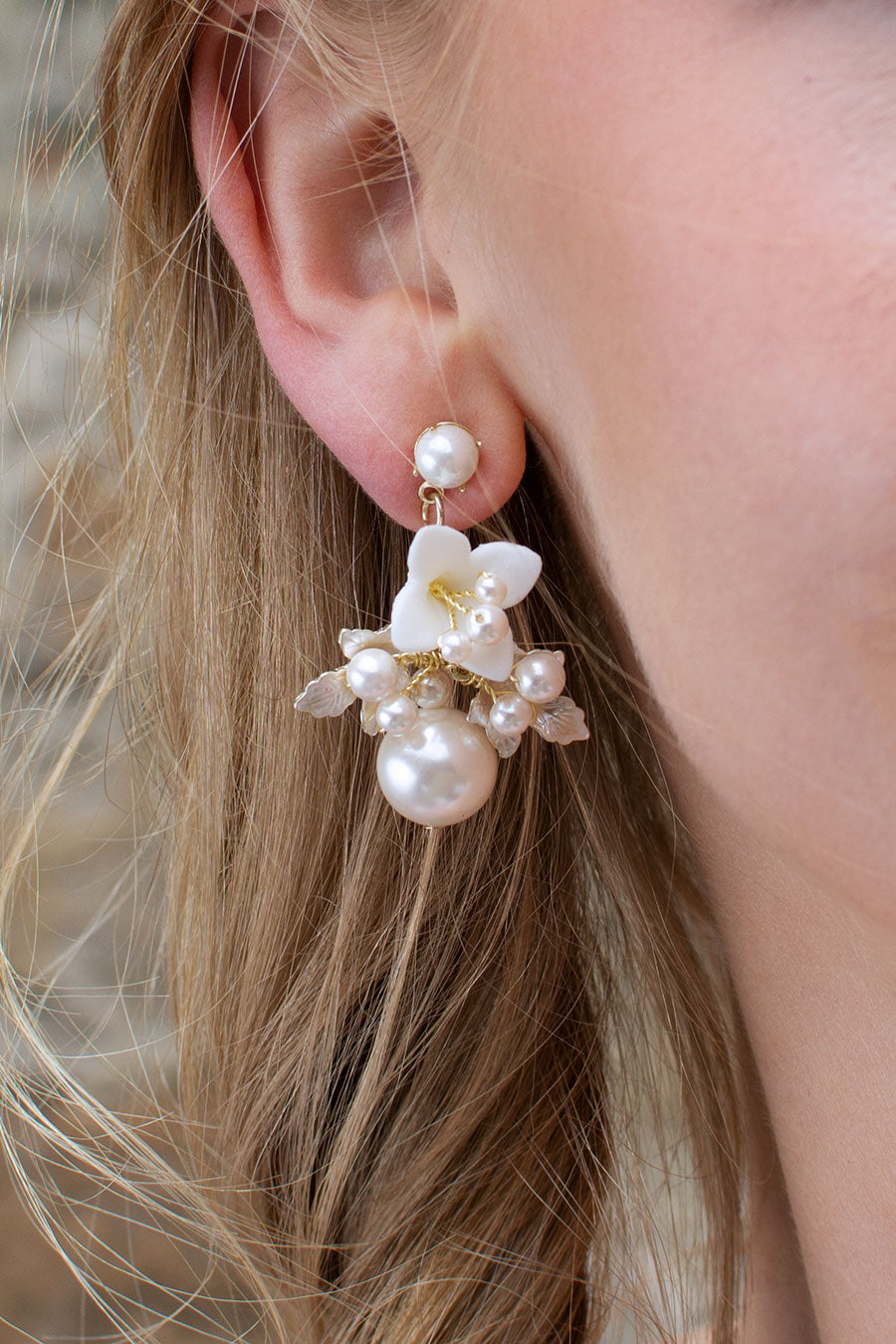 Stunning in its simplicity, Galliano is a gorgeous cluster earring featuring pearls and painted brass leaf details and a single pure white ceramic flower. Galliano is a luminous pearl earring featuring a teeming cluster of our favourite pearl, ceramic and brass leaf pieces. Wondrous and undeniably pretty, Galliano is modest statement earring with the perfect amount of "va-va-voom". Pair Galliano in Pale Gold with matching headpieces Anita in Gold and the Anita Double in Gold. Our Galliano earring weighs 7 grams each and is approximately 4cm long and 3cm wide. Brides and bridesmaids alike are falling in love with this earring!