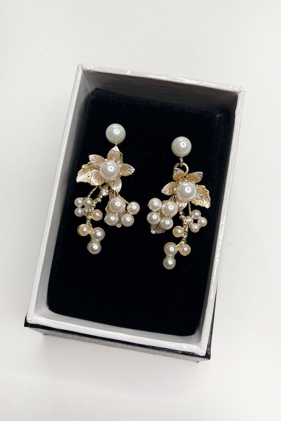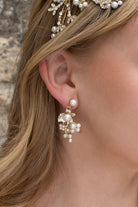 Our Georgie Earring is a pearl wonder with pale gold floral features that fall curvaceously to frame the face. A small flower is dotted with a rounded pearl as the main motif of the arrangement, picking up on matching details in both our Elizabeth in Pale Gold and Carmella in Pale Gold Bridal headpieces. Georgie is a fantastic earring to wear as a singular statement or to match with an array of our Pearl Jewellery. Georgie is easily wearable all day weighing only 5 grams and is 4cm long by 2.5cm wide. Match Georgie with one of our Pearl Headbands, Crowns, Side Combs or Vines in any of our three colours- Georgie in Silver, Pale Gold or Rose Gold. A perfect addition to your pearl bridal look and an amazing gift to bridesmaids.