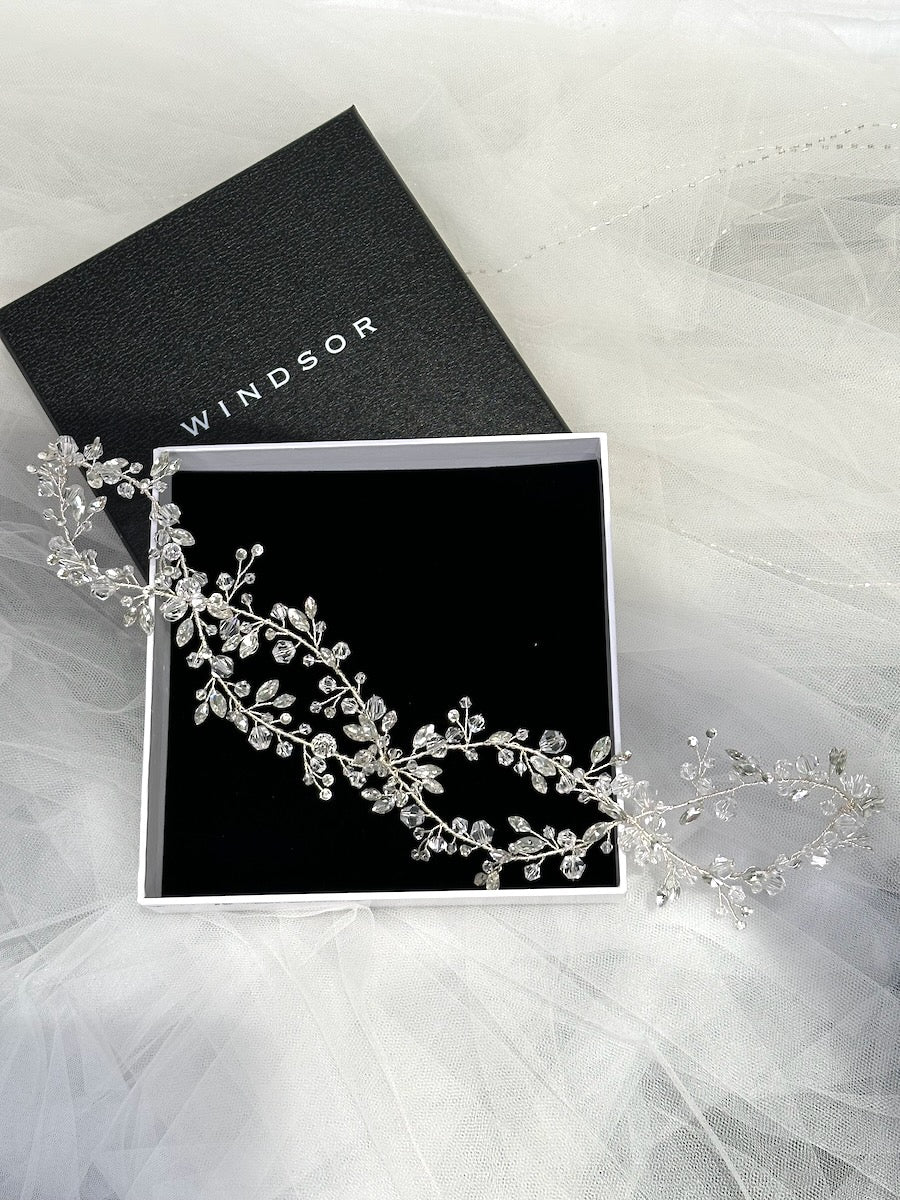 Gia Twin row is a beautiful wider crystal bridal vine. Crystal beads and stones of varying sizes and shapes glisten and glint as they adorn Gia's super soft flexible metal wire base, making it easy for you to wind Gia around up-do's and intertwine in hairstyles. The possibilities are endless with Gia, and is sure to add a little sparkle and beauty to your bridal ensemble.