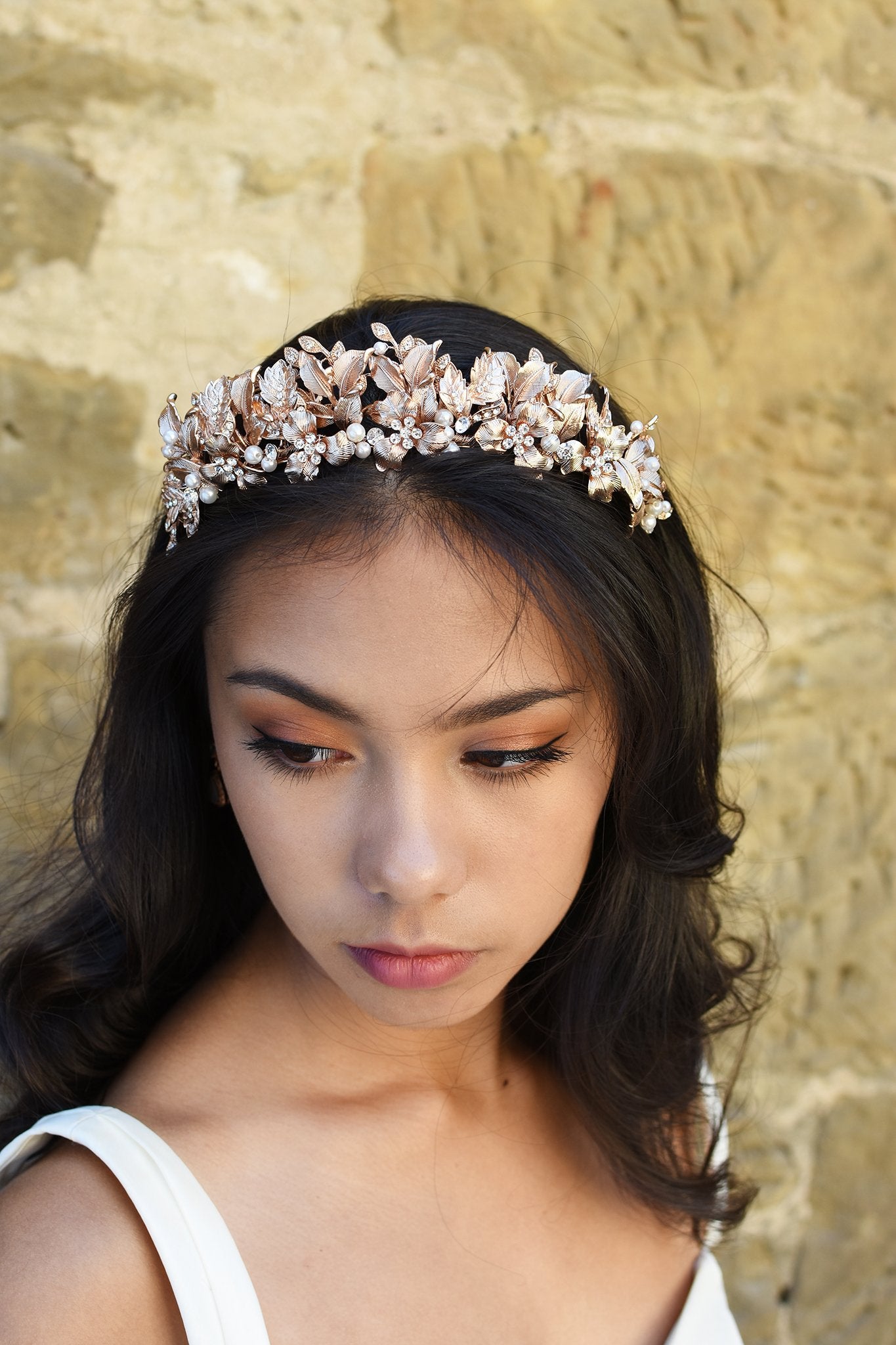 A beautiful floral statement, Hannah is a gorgeous pale rose gold bridal headpiece. An arrangement of rose gold pearlescent leaves and floral elements embellished with tiny pearls and crystals combine to create a sweet sensation that is Hannah. With delicate crystal and pearl detailing, Hannah will radiate with beauty and elegance atop of your head. Lightweight and easily adjusted for individual comfort and style preference, Hannah will have you looking like a picture-perfect princess.