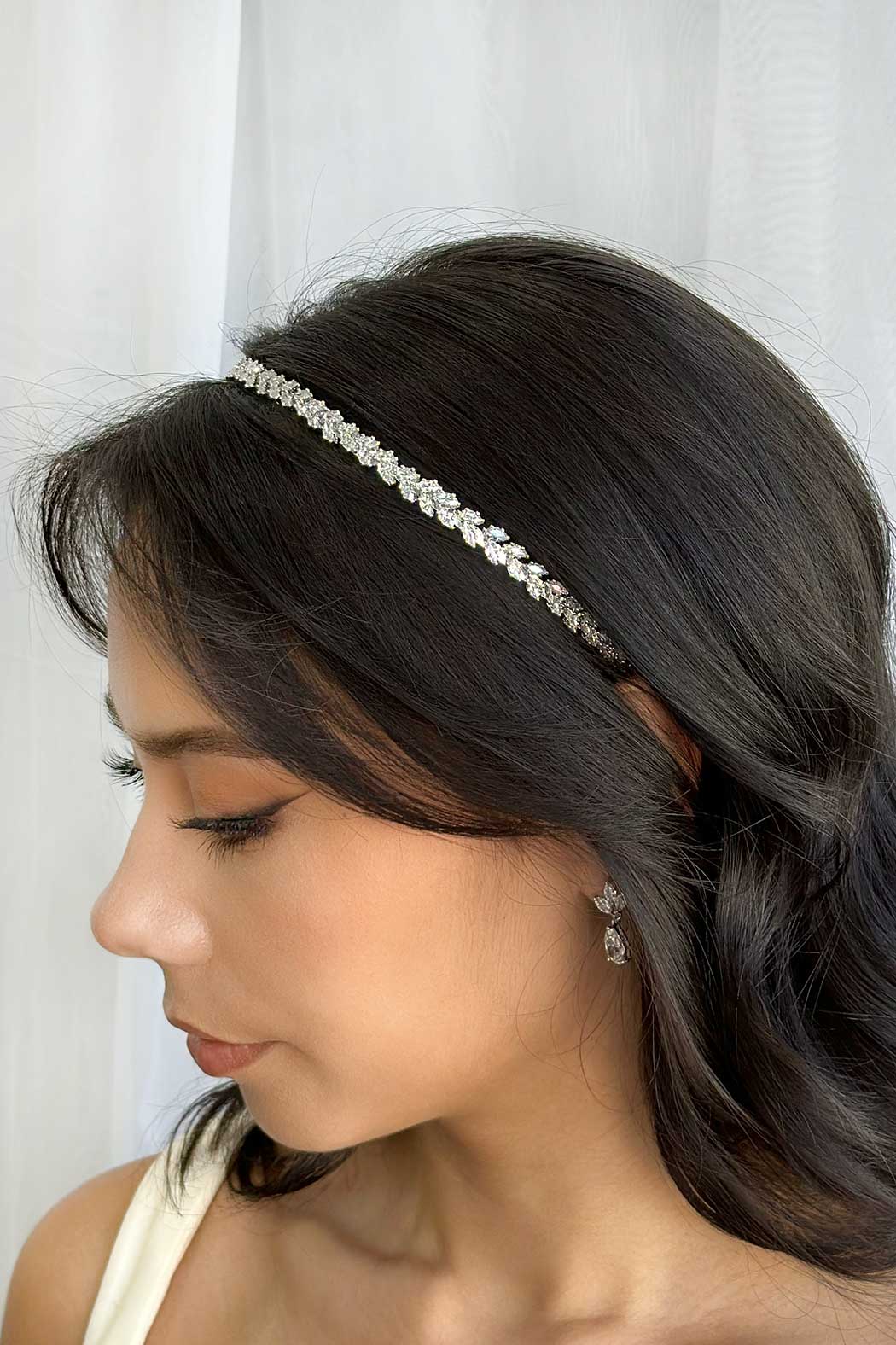 Hazel is a beautiful single row headband encrusted with gleaming navette-shaped crystals that stretch the length of the band to give a modern luxury look. The high quality eye-shaped zirconia stones are individually claw set in cups that stop short to reveal the headband's frame.