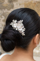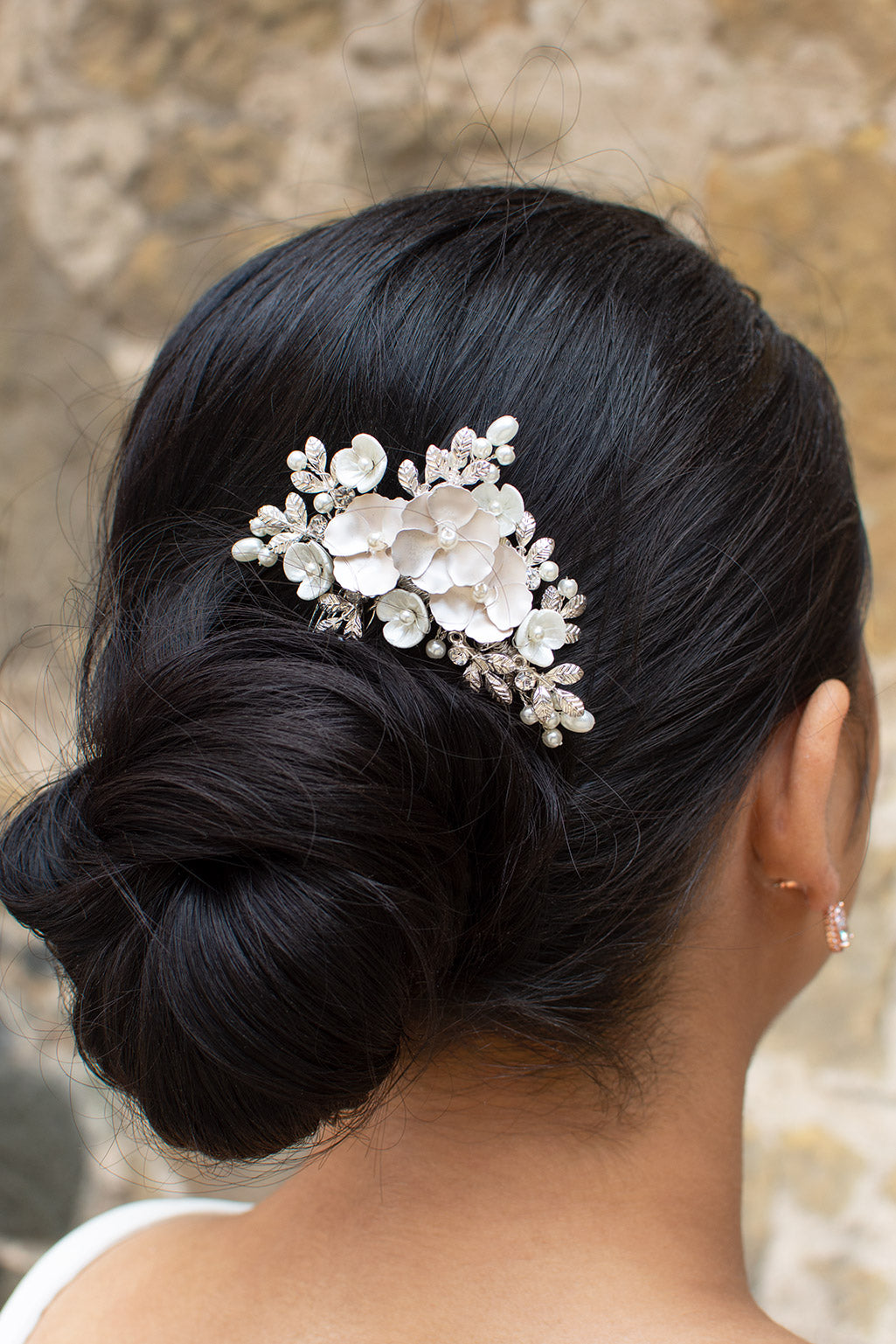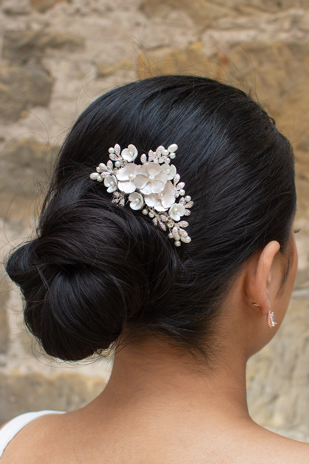 A beautiful budding beauty, Iris is a small yet stunningly detailed headpiece. Complete with a comb fitting, Iris features three delicate metal flowers hand-painted with a pearlescent blush silver finish coupled with an array of gorgeous pearls. Similar to our Ava Side Comb, Iris is a downsized version and is perfect for brides, bridesmaids and flower girls alike.