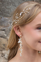 With a symphony of radiant rose gold leaves and crystal, this piece is simply stunning. Juliet, a divine stream of pearls bound by pale gold wire, gracefully falls in a long outstretched manner with touches of polished pale gold leaves and sprigs of rounded crystal. Ultra light and flexible, Juliet is a romantic vine style of earring. Juliet is approximately 11cm long and 2cm wide and weighs only 4 grams each. Juliet is the matching earring for our Magnolia Vine in Pale Gold.