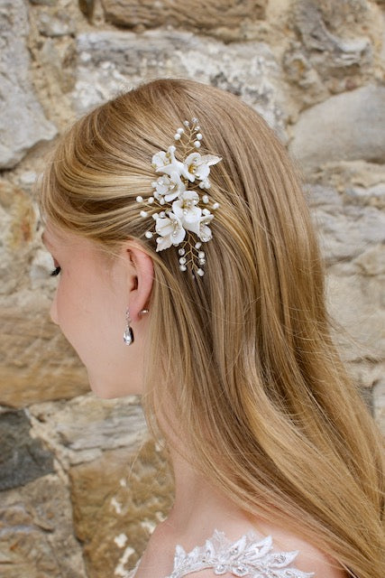 Featuring ceramic wildflowers, Karlie is a masterpiece of floral romance. The white clusters of bell-shaped bud finished with crystal centres are to die for, not to mention the delicate silver wiring and pearl beading. Lightweight and easy to fit, Karlie clip softly slides in to sit as desired. Our Karlie side comb is practically wearable romance for the wedding day of your dreams.