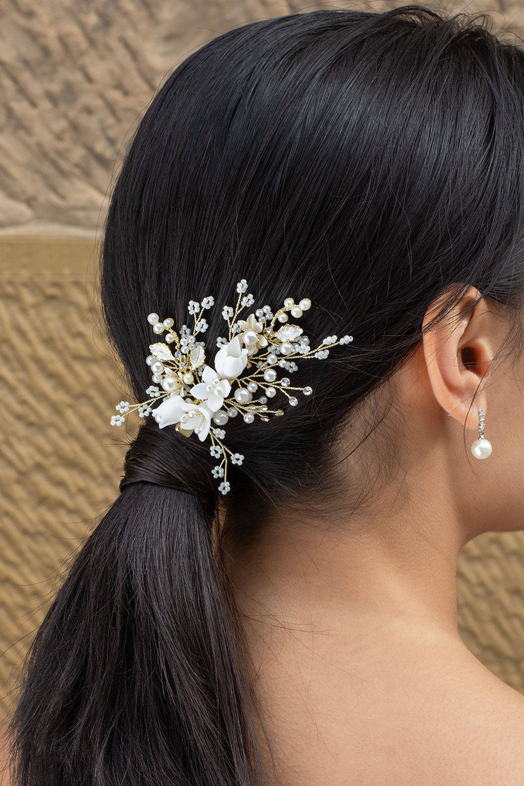 Kiara is a fantastical burst of organically shaped crystal and seed pearls. Centred by a bloom of porcelain florals, Kiara is ethereal in her nature. She is the perfect touch of dreamy elegance suitable for any Bride.