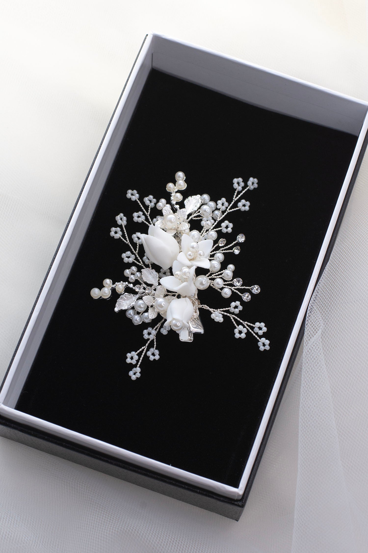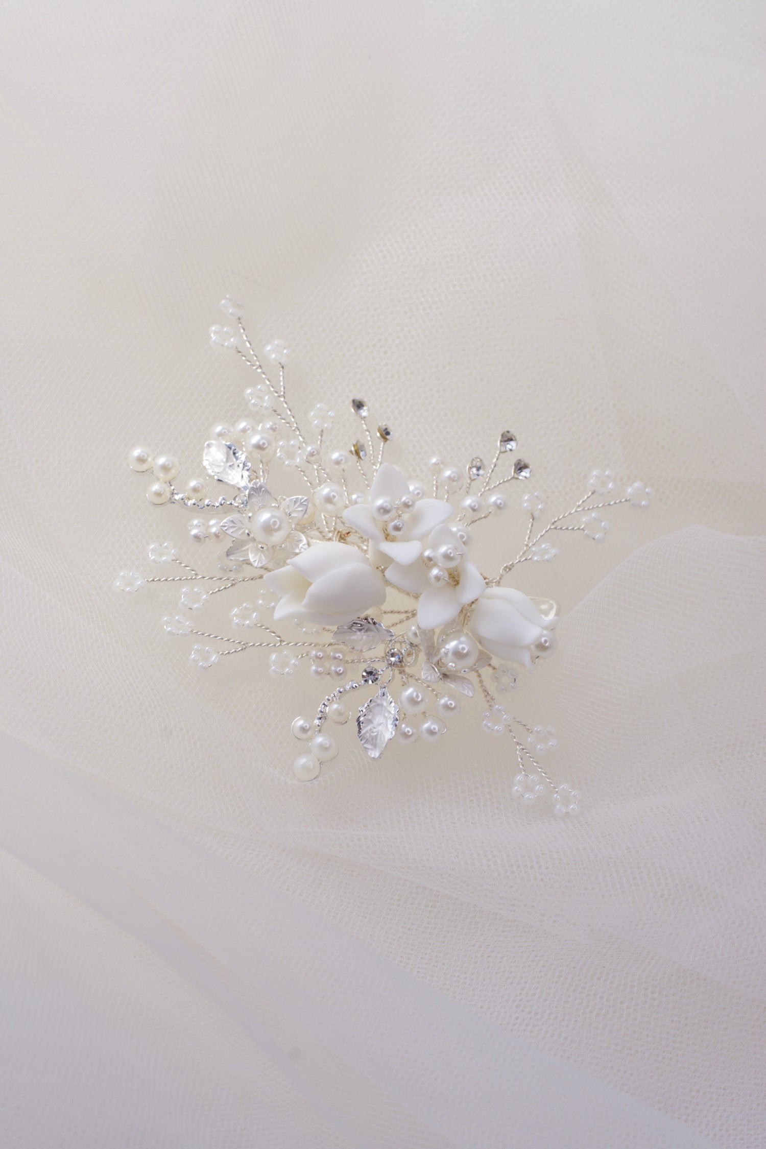 Kiara is a fantastical burst of organically shaped crystal and seed pearls. Centred by a bloom of porcelain florals, Kiara is ethereal in her nature. She is the perfect touch of dreamy elegance suitable for any Bride.
