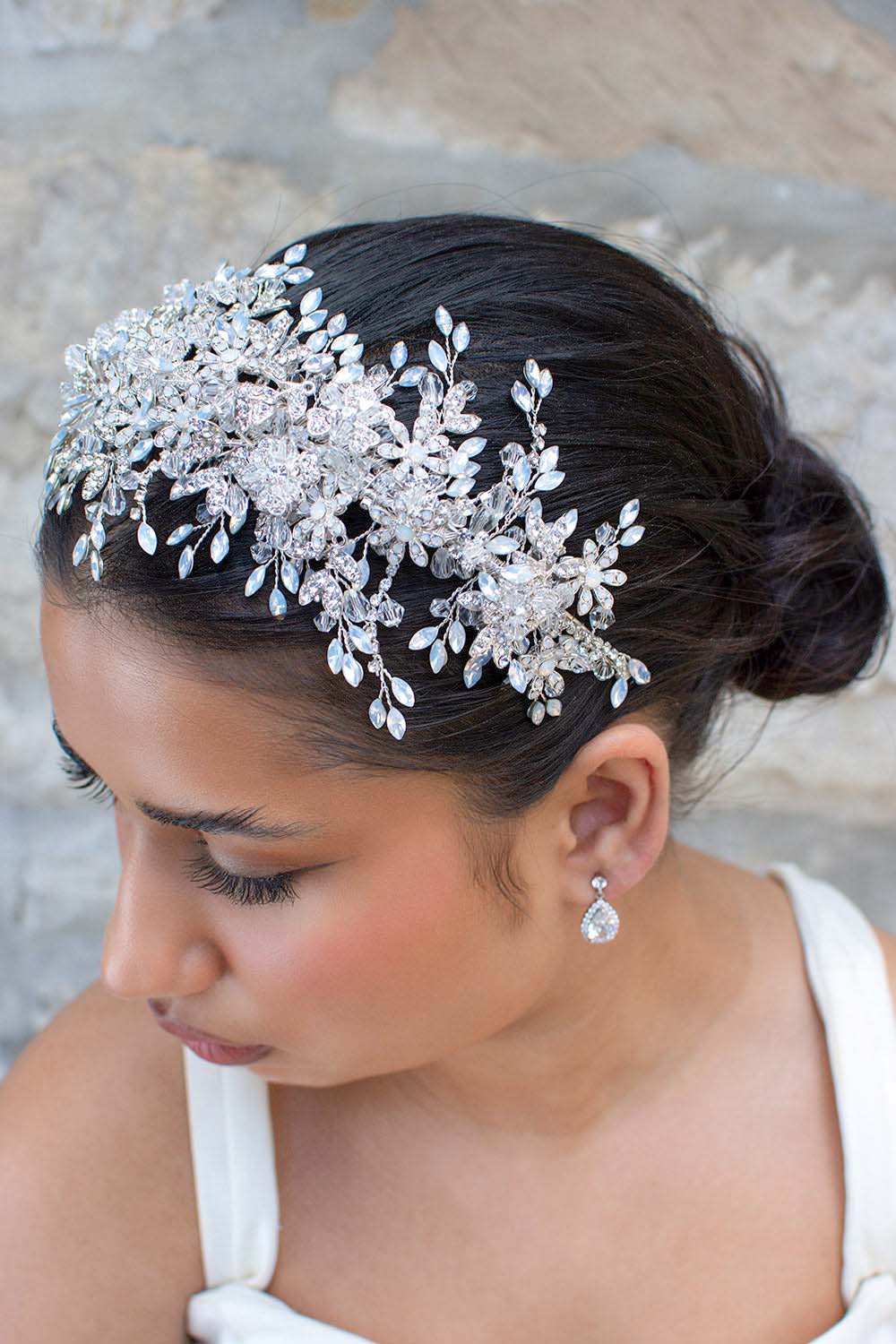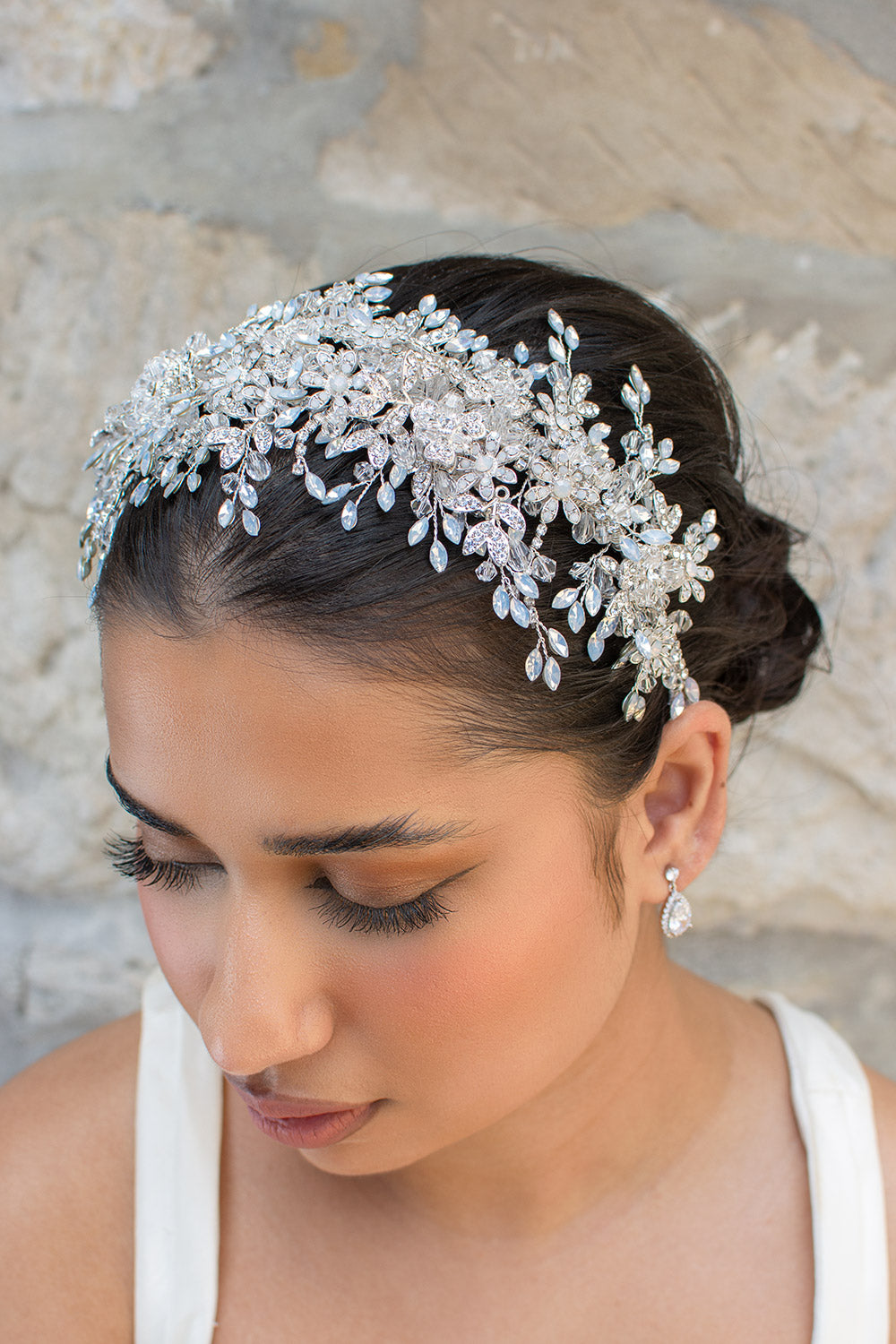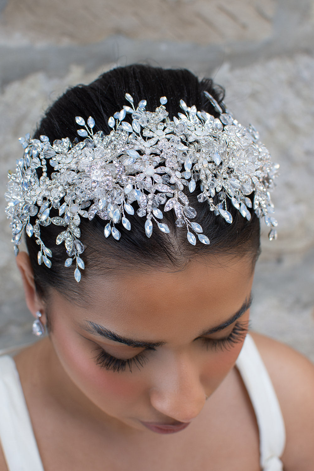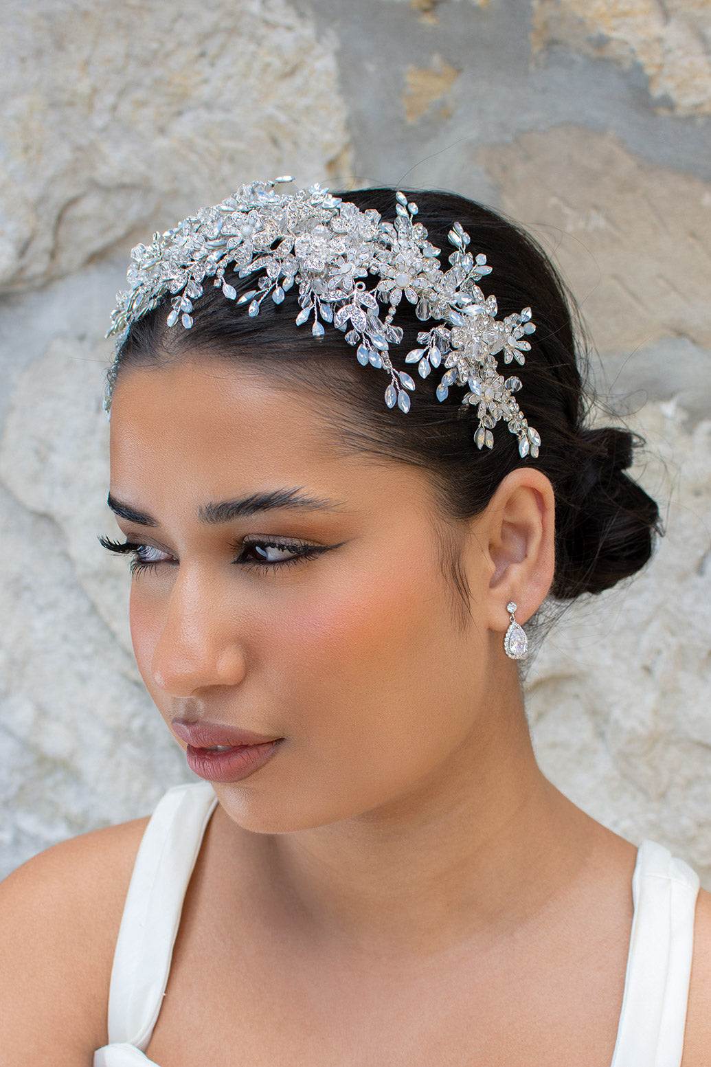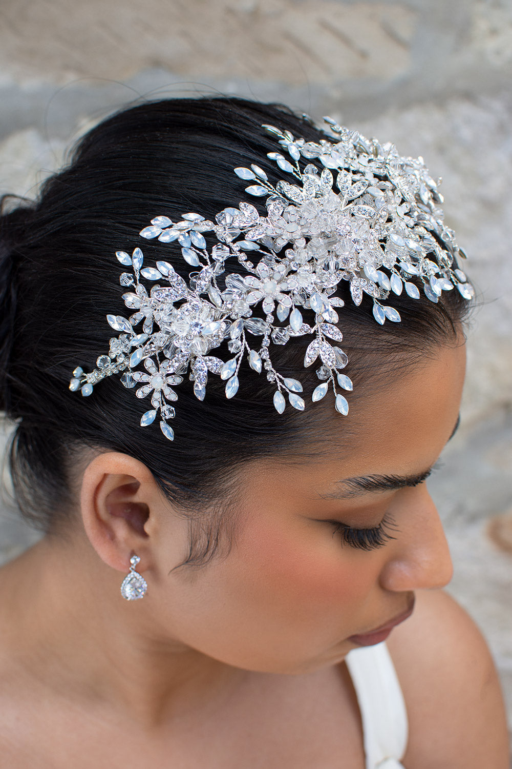 Bedazzle in our gorgeous Kiera Bridal Headband, a larger version of our Jennifer Headband, beautifully created by weaving double the number of clear and white-opal stone-encrusted leaves, flowers and crystals onto this divine wide headband in a natural formation. Kiera's gleaming clusters of crystals and beads make this piece a magnificently detailed headband, the perfect complement for any bridal look.