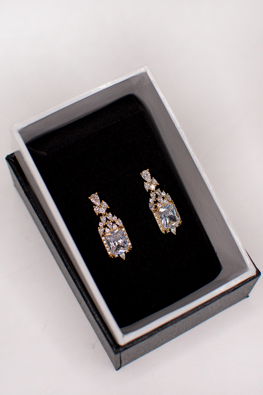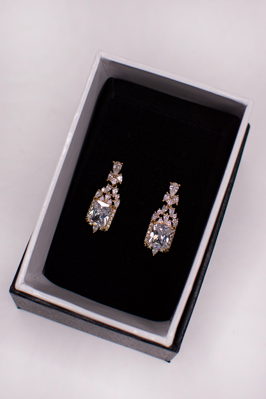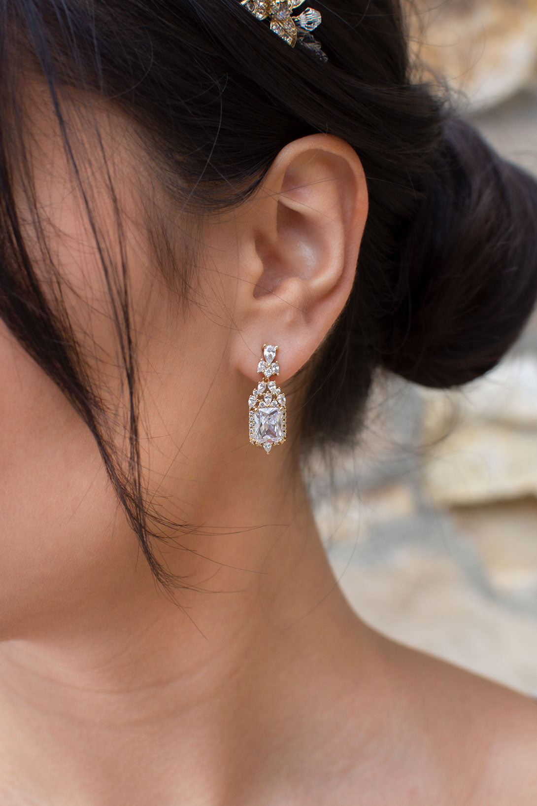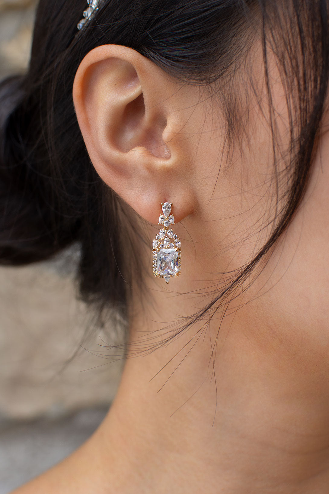 Detailed and sophisticated, Lena is a small yet striking statement drop earring. Lena's centrepiece octagon stone gleams as it is bordered by an abundance of small zirconia crystal stones. Set in a white gold plating, Lena features a symmetrical and intricate design of small teardrop stones reaching up towards the post fitting. Let Lena's mirrored beauty and elegance perfectly compliment your bridal outfit on your special day.