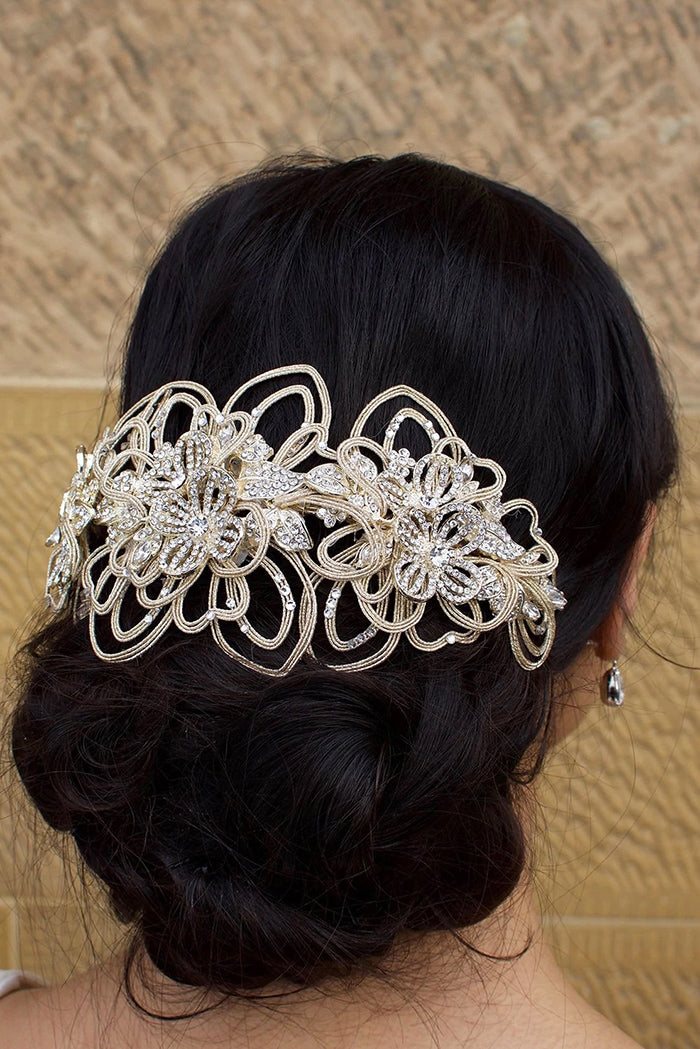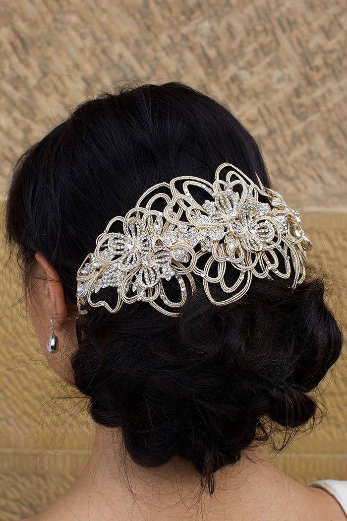 A wide style Handmade headband, Magdalena shines beautifully in a Matte Gold finish encrusted with tiny sparkling clear stones. With Magdalena as your crowning glory, you won't need to give your hair a second thought on your wedding day. Magdalena will dress your hair in golden elegance.