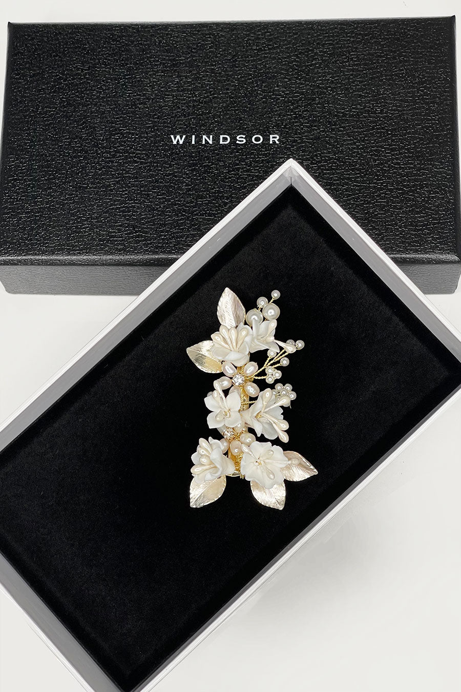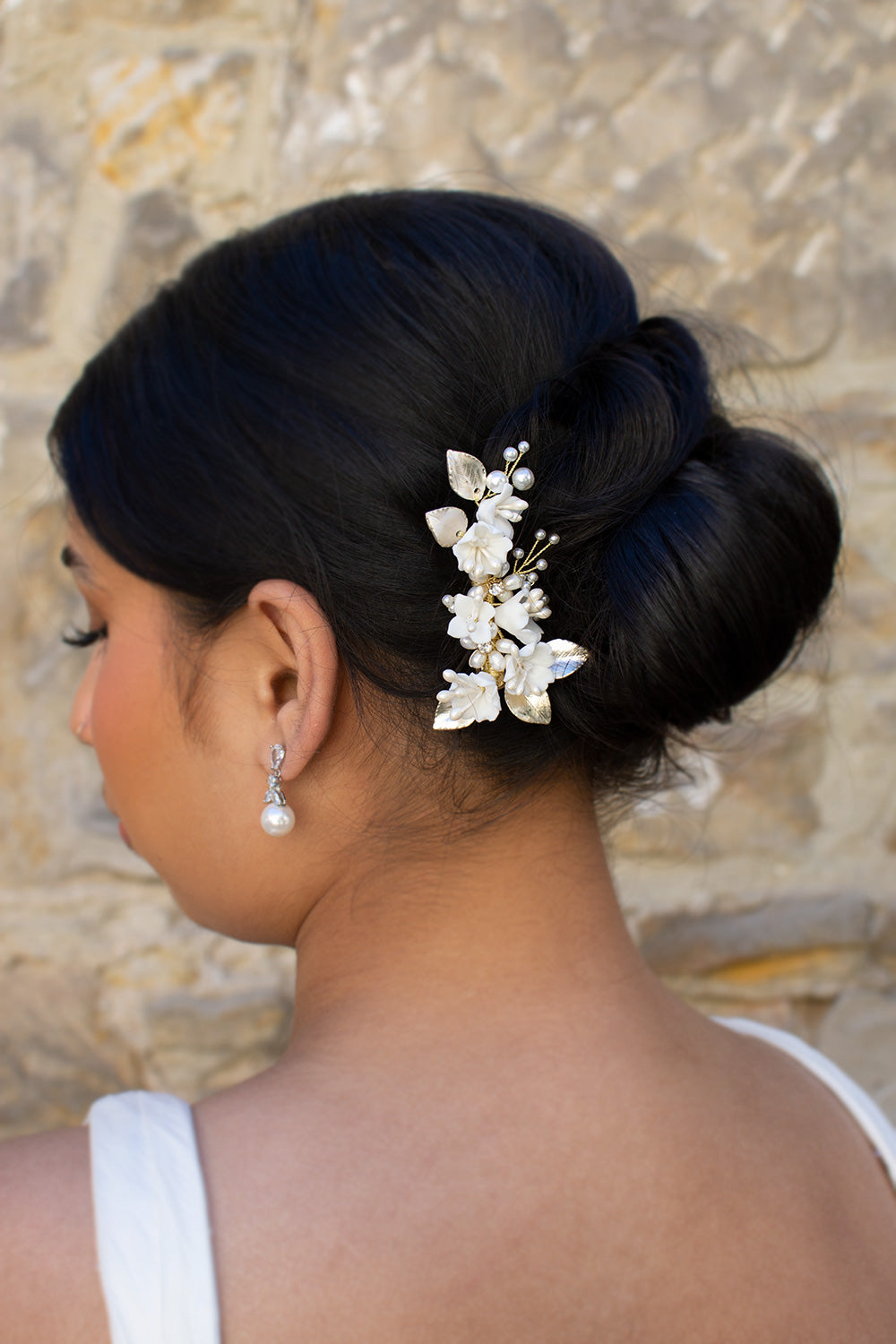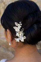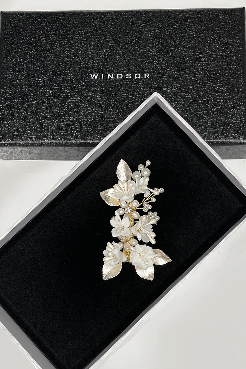 Marija is a beautiful small side clip with flowers and pearls that will have Brides, Bridesmaids and Flower girls dancing down the aisle on your wedding day. Small porcelain flowers of different shapes with pearl stems and surrounded by soft silver flowers make this small unique hair clip a pretty feature for wedding day hair. Sprigs of pearls in the background complete this very lovely design. Unusual and very lightweight Marija is the perfect small feature to finish a Bridal look.