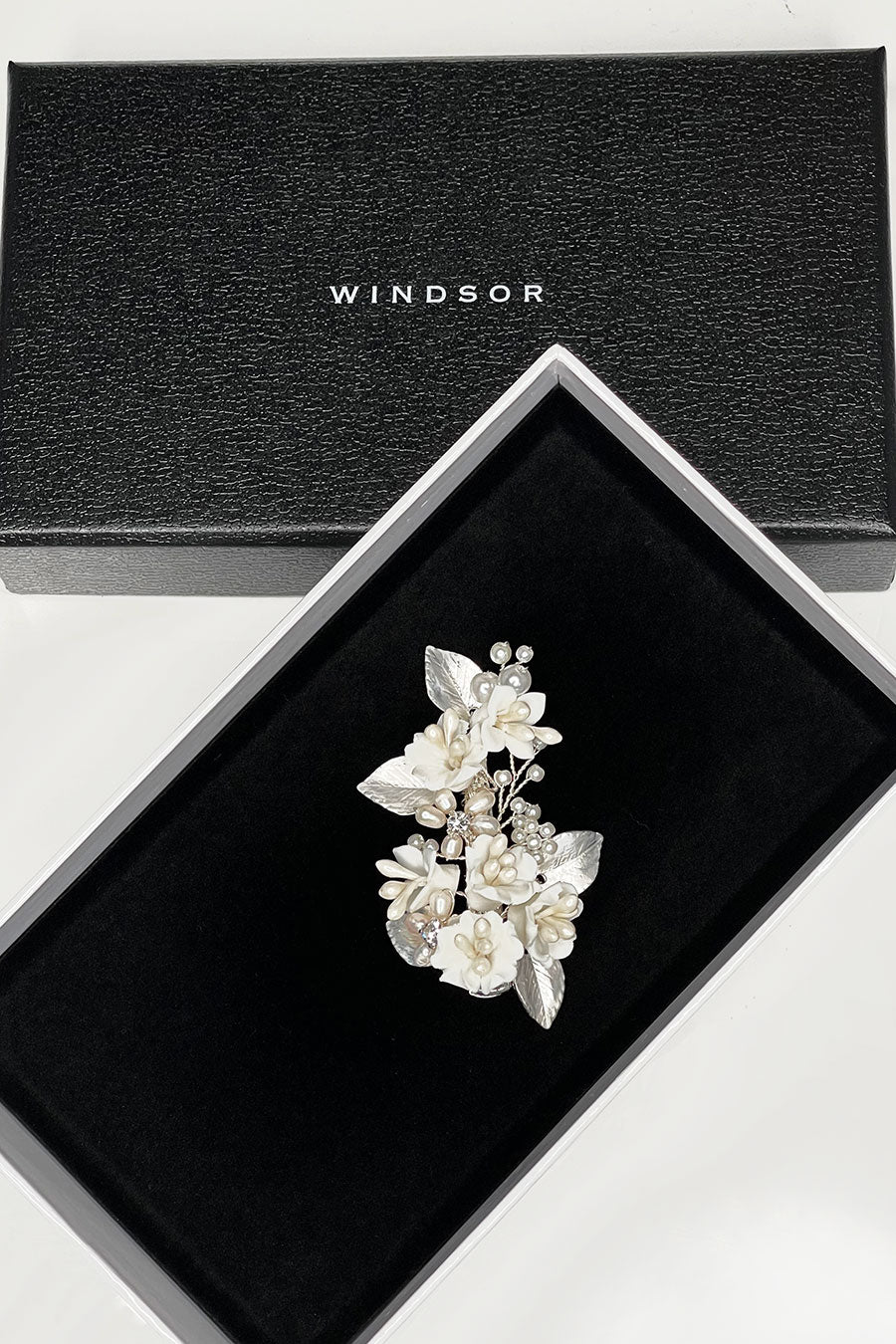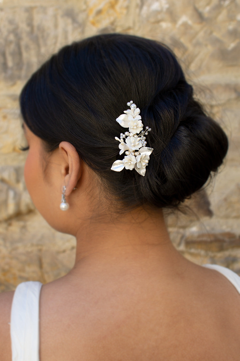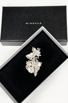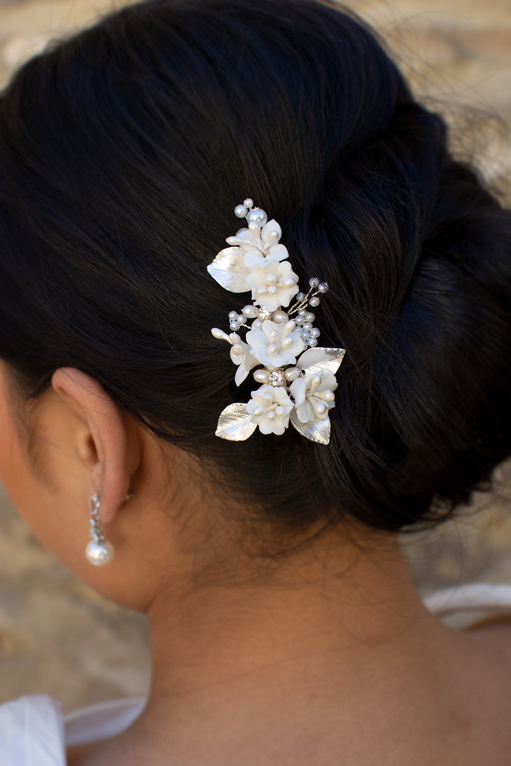 Marija is a beautiful small side clip with flowers and pearls that will have Brides, Bridesmaids and Flower girls dancing down the aisle on your wedding day. Small porcelain flowers of different shapes with pearl stems and surrounded by soft silver flowers make this small unique hair clip a pretty feature for wedding day hair. Sprigs of pearls in the background complete this very lovely design. Unusual and very lightweight Marija is the perfect small feature to finish a Bridal look.
