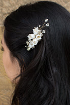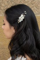 Millie is one of our daintiest clip designs. This piece is an incredibly versatile design, featuring a miniature gold spun flower arrangement and tiny bursts of pearl. This piece is a universally stylish option for brides, bridesmaids and flower girls.