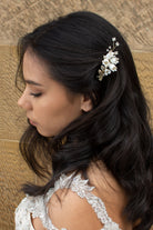 Millie is super easy to wear and versatile, she can be worn in almost any hairstyle. This mini sized side clip is perfect for a Bride looking for a hint of gold in her hair or a brilliant matching piece for each of your brides maids. Millie has it all- small gold leaves, hints of crystal, ceramic flower and small branches of pearls. Millie is perfect for all weddings and styles, a perfect all rounder side clip!