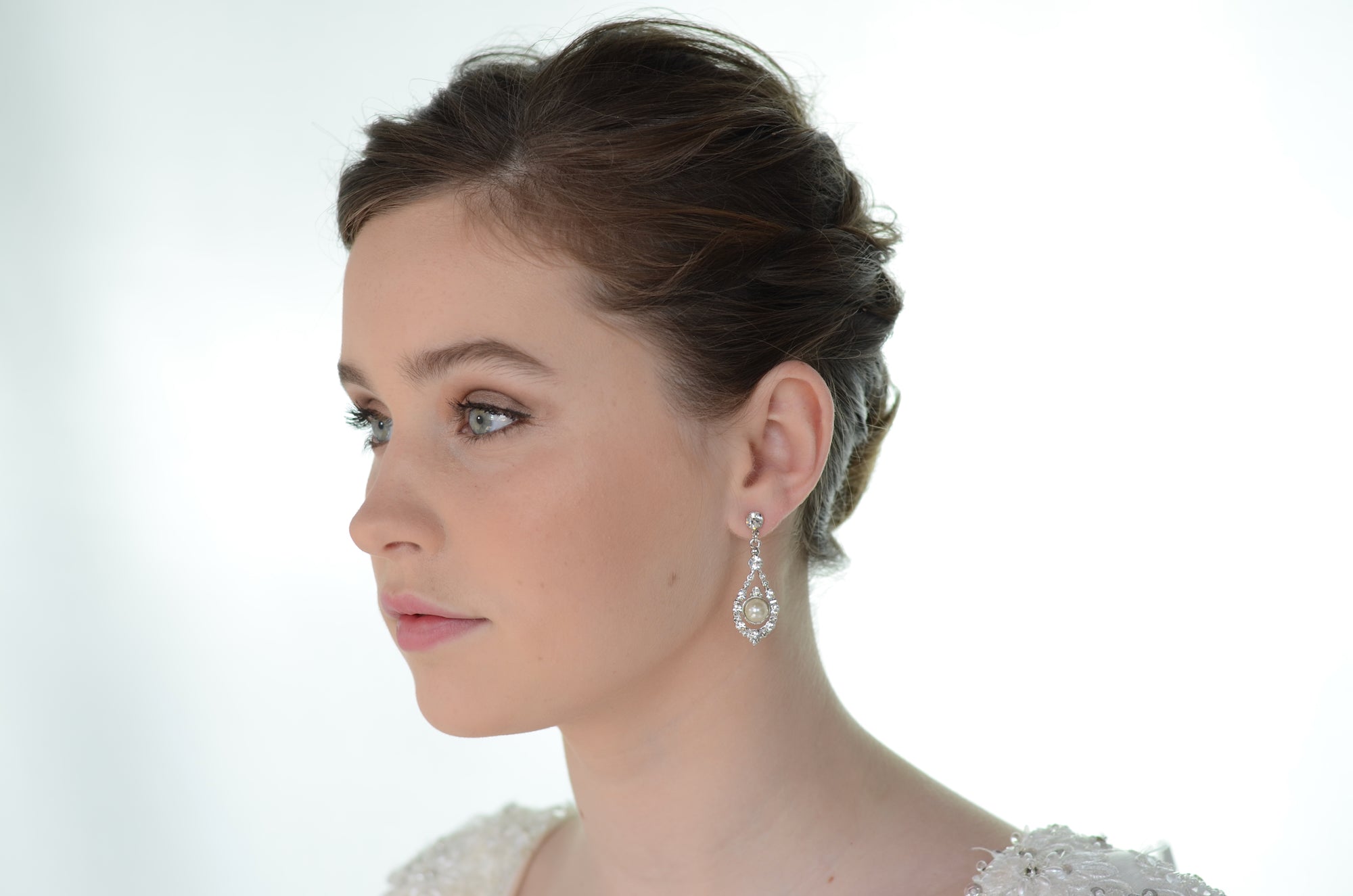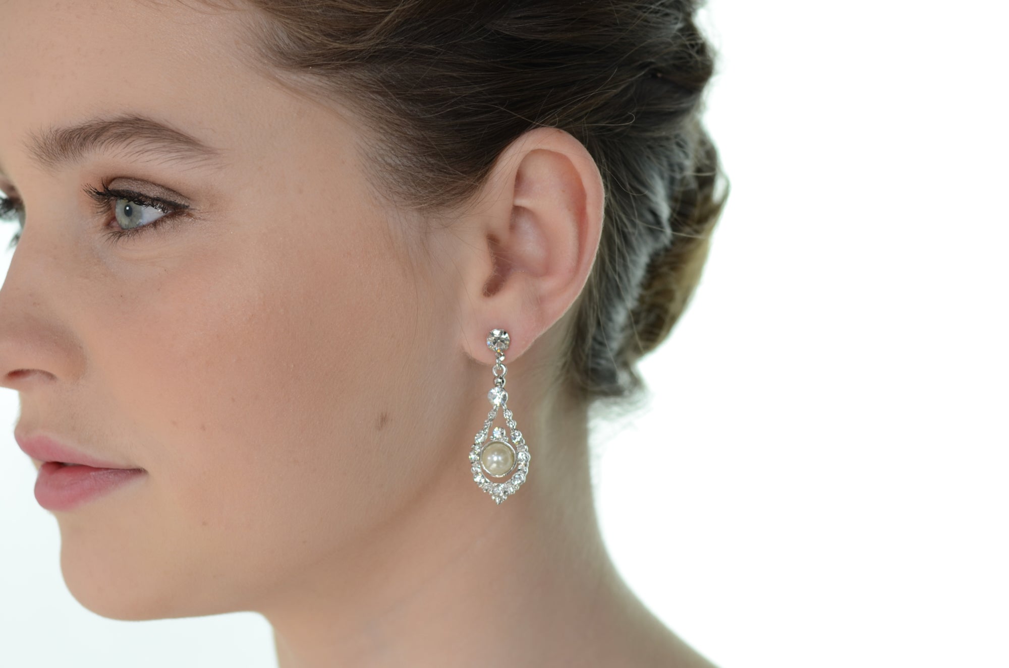 A drop earring straight out of a fairytale, Nova features a stunning suspended pearl surrounded by a ring of tiny crystals held up by a single silver crystal stud, fitted with a titanium post. This elegant teardrop design truly pulls out all the stops and is sure to add a sprinkle of fairytale sparkle to your special day.