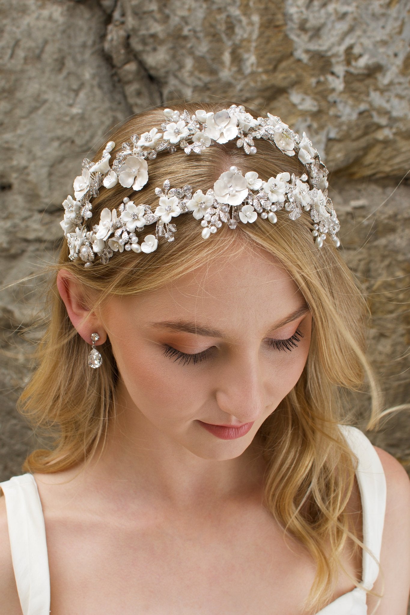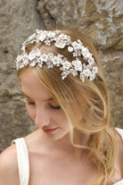 Ophelia is a double row headband featuring small ceramic flowers mixed with fine painted metal flowers. This gorgeous design is the ultimate floral fashion statement for the garden wedding of your dreams. Lightweight and easily adjusted for individual preference and comfort, you’ll be wearing this headband all day long. This is a lovely floral design matching perfectly with many modern floral Wedding dresses. Ophelia is made with a bendable band allowing you to adjust the two rows closer or further apart. Ophelia is also available in gold.