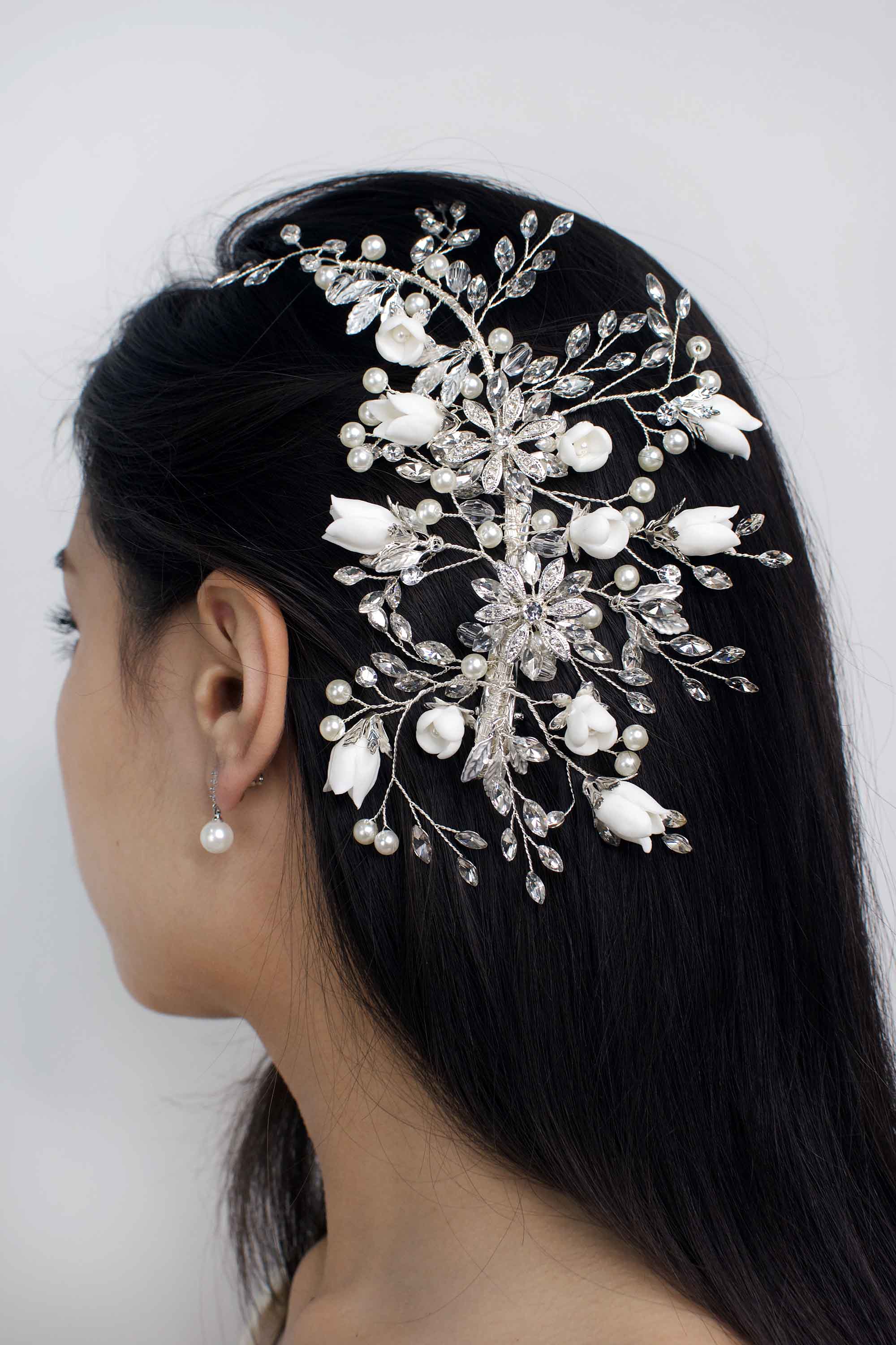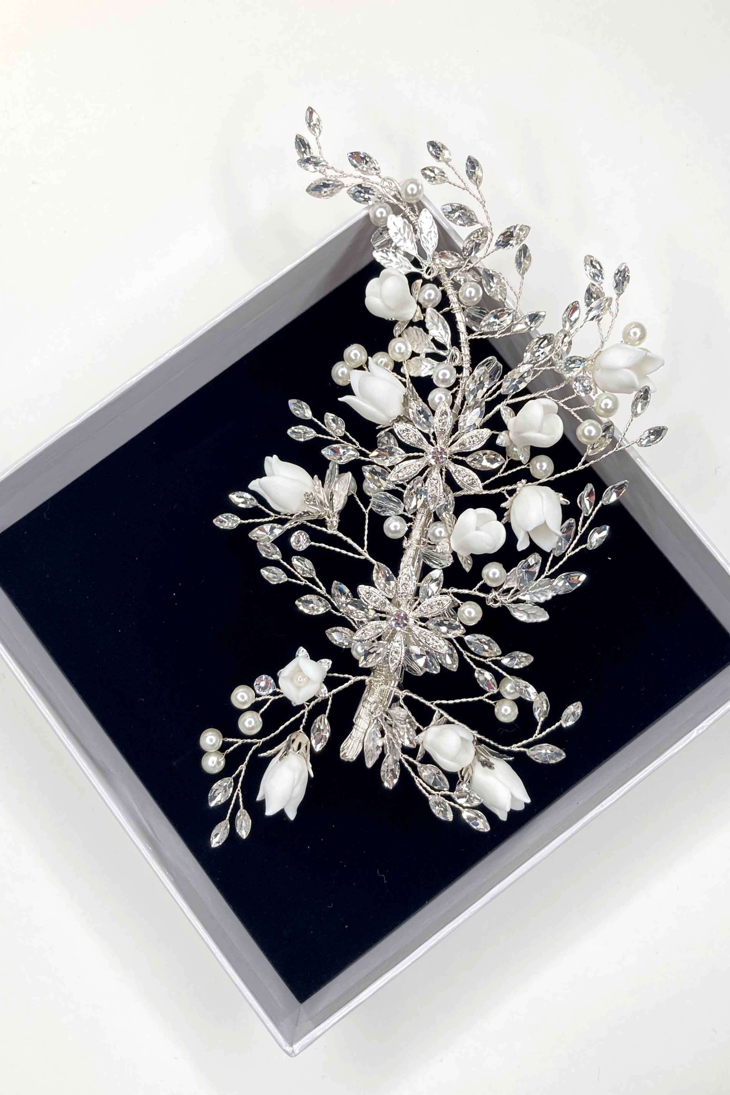 Our Paloma design featuring ceramic and crystal flowers embellished with dramatic sprays of crystal and pearl is a stunning statement piece.