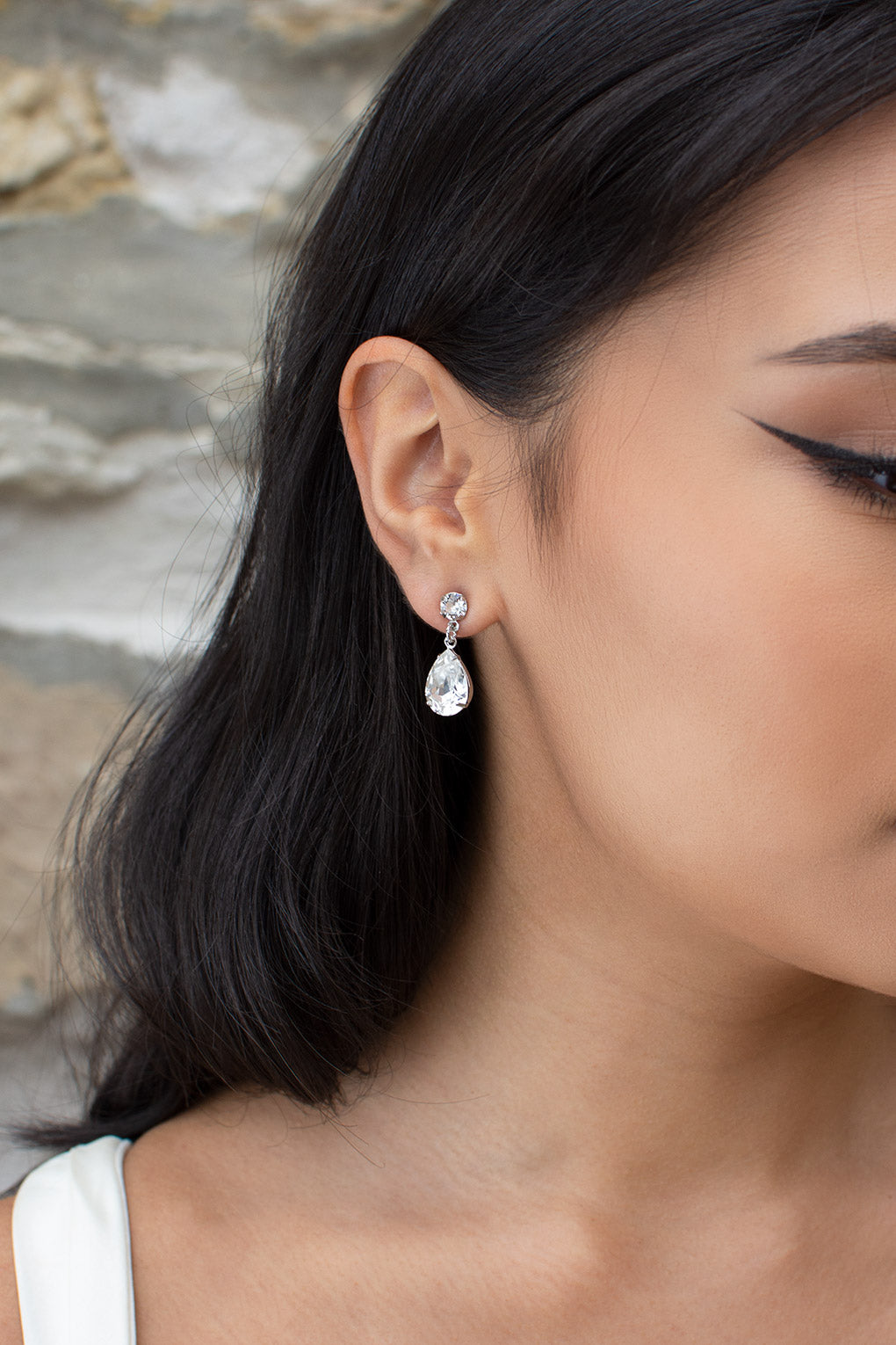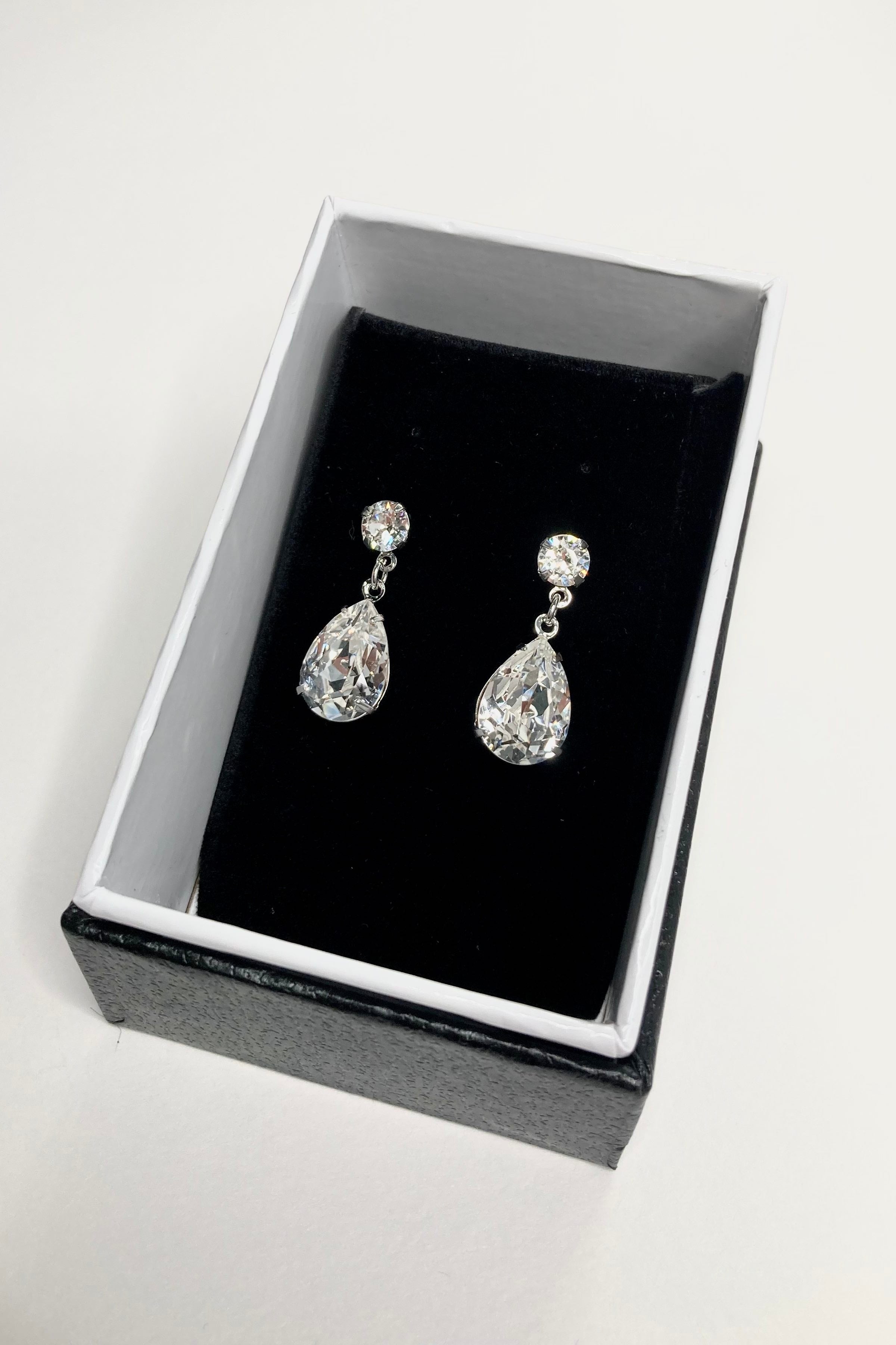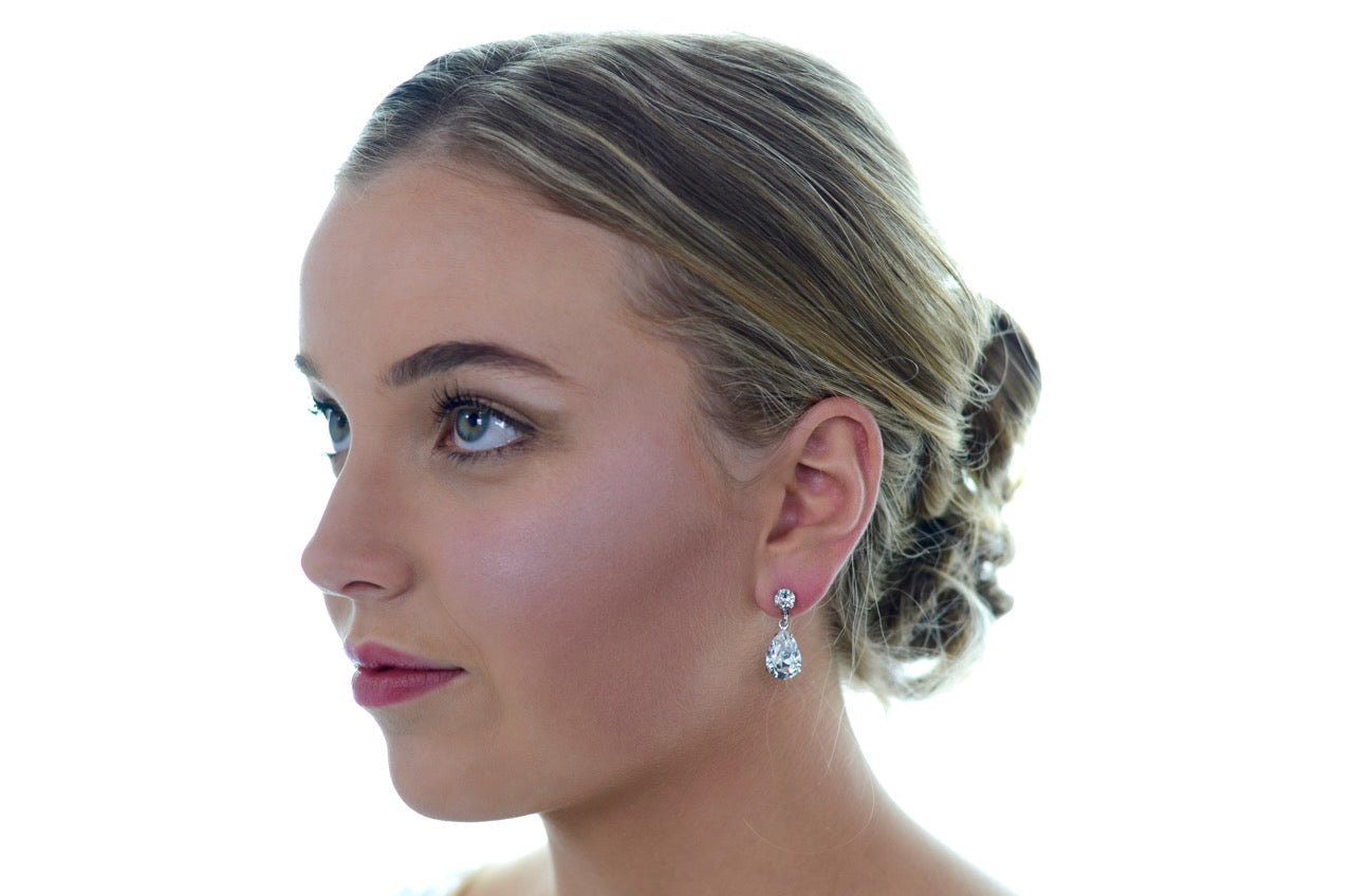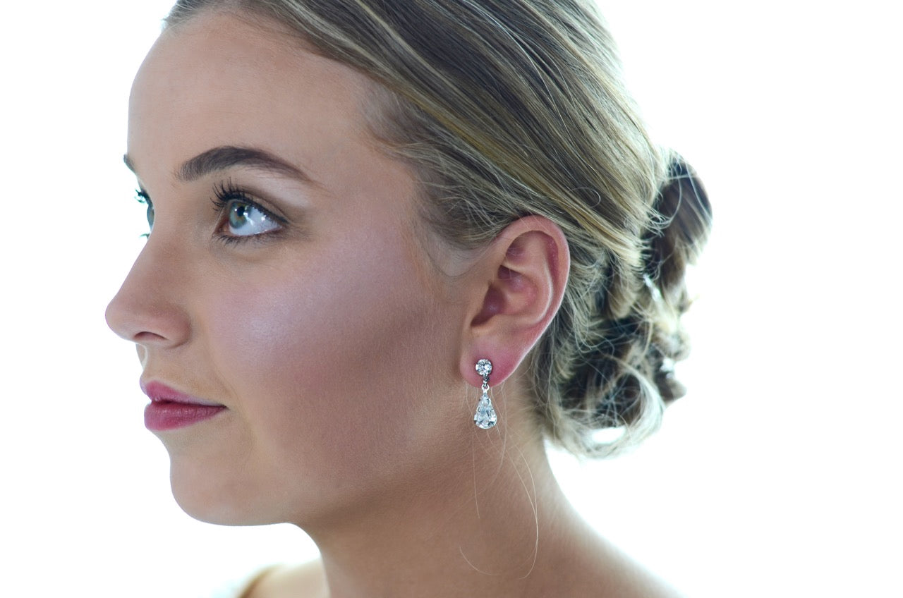 A bridal classic, Rosemary features a genuine Swarovski pear shape crystal set by hand in our studio. These two make a pretty pair for the bride who wants to sparkle just a little on her big day.
