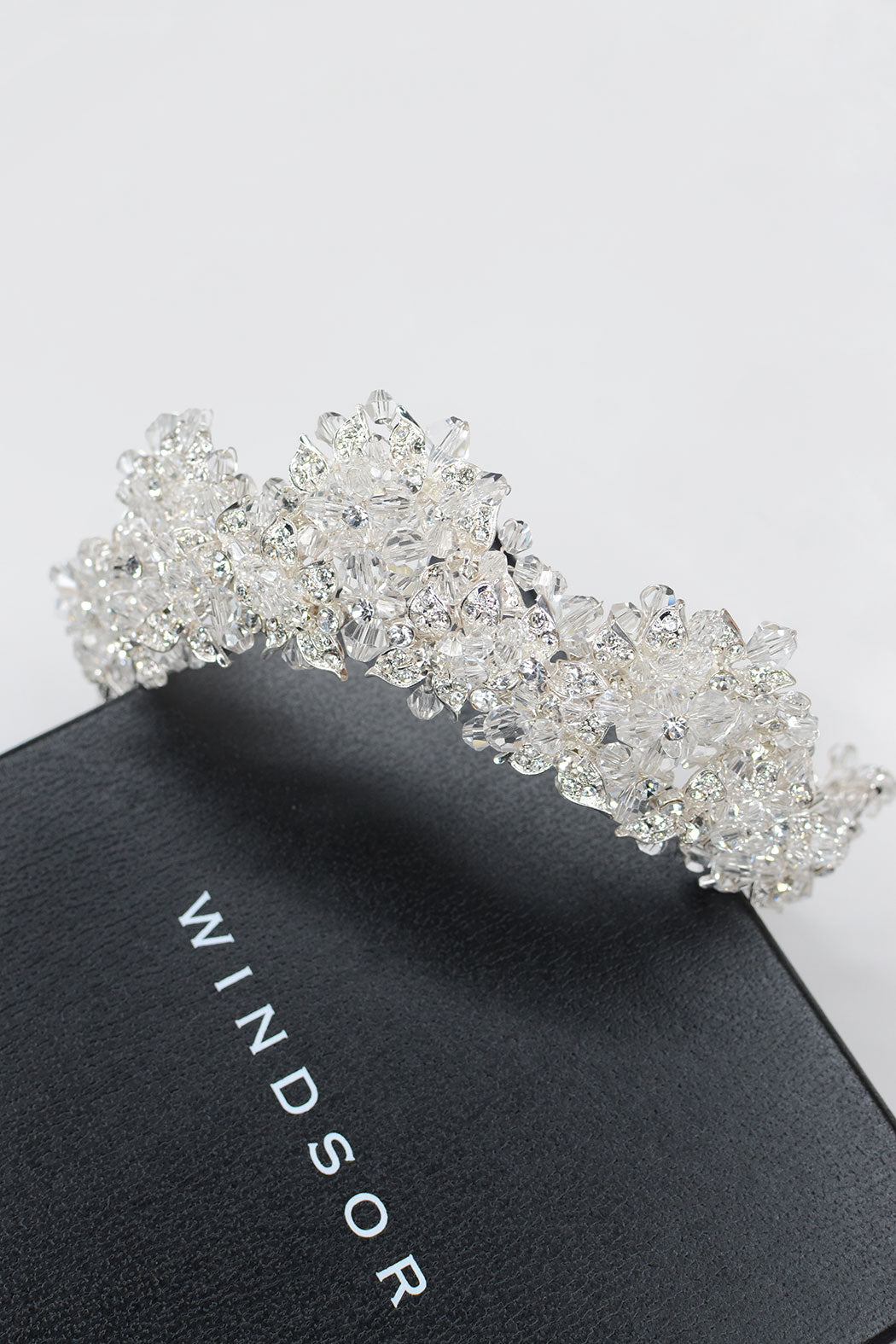 Look Stunning in this beautiful Modern Bridal Tiara, the Simona Crown is a rounded tri-peak handmade headpiece full of gleaming crystal embellishments. Fine silver leaves shine amongst the crystal clusters that adorn this crown's three main peaks, with delicate embellishments graduating to a single small peak along each side. Easily reshaped for wearing preference and comfort, Simona is the perfect piece to compliment your bridal outfit and dress you in timeless elegance. Also available with pearls custom made to order same price.