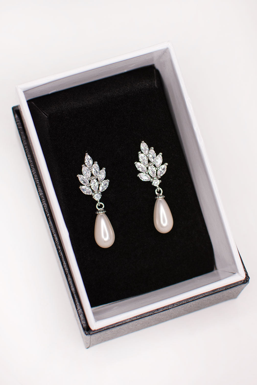 Held below Carla's symmetrical outstretching spiking design of tiny navette shaped stones is a single teardrop pearl that sways and dances elegantly with movement. Carla's simple yet eccentric design is a perfect choice for the Bride looking for that final touch of radiance to their bridal ensemble.