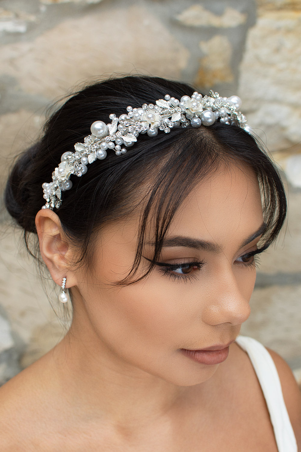 Wondrous Stella is an amazing Silver Pearl Headband that illuminates the room. Feel like the most exquisite bride wearing a piece that has been handcrafted with lustrous pearls and dazzling crystal stones. With subtle flower motifs, Stella is like a charming garland of pearls and leaves made with intricate detail. Stella is perfect to wear for long periods of time, causing no pain or headaches due to the frame's bendable nature. Soft and easy on the head, Stella is suitable for a range of bridal hairstyles. Become the bride of your dreams with Stella.