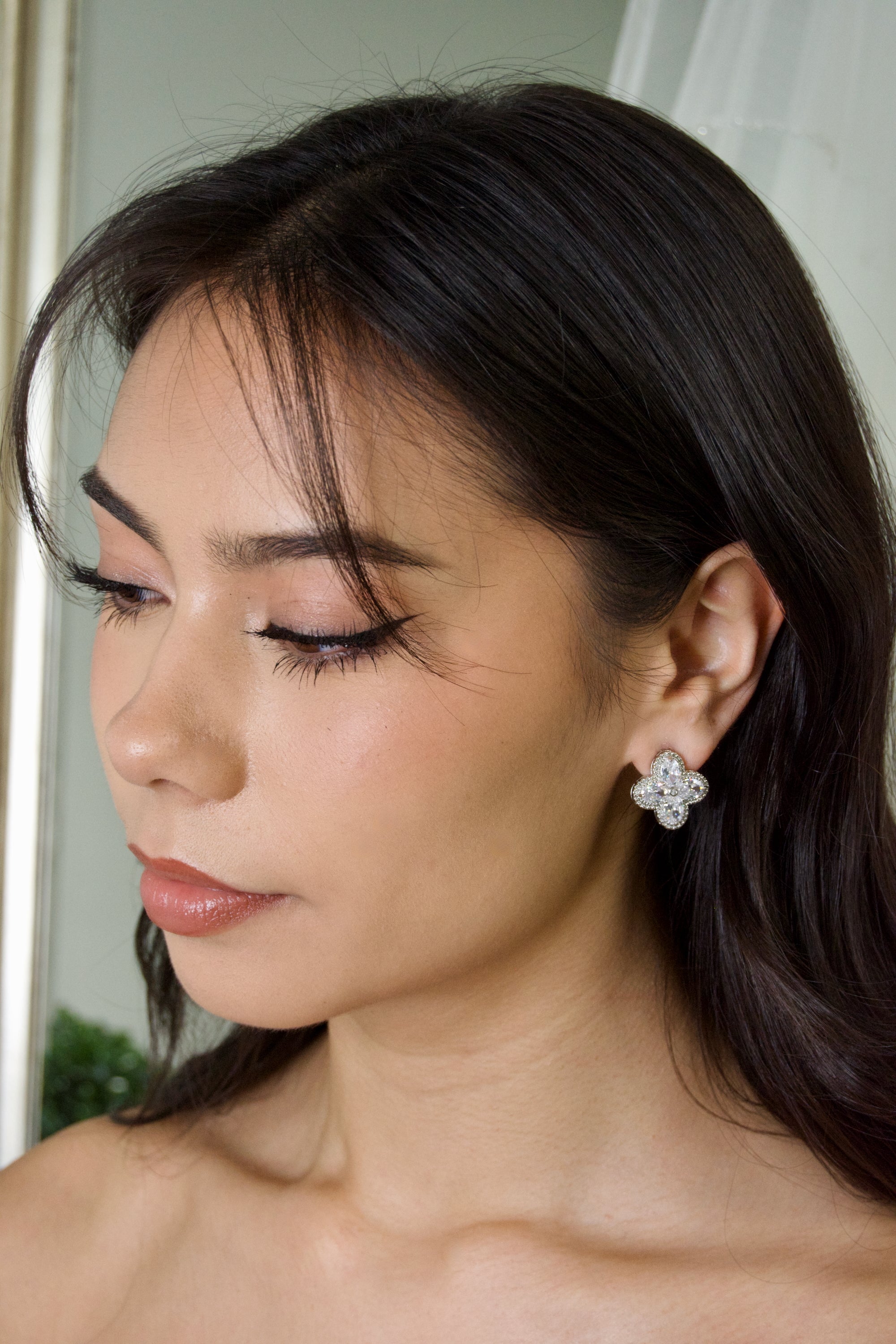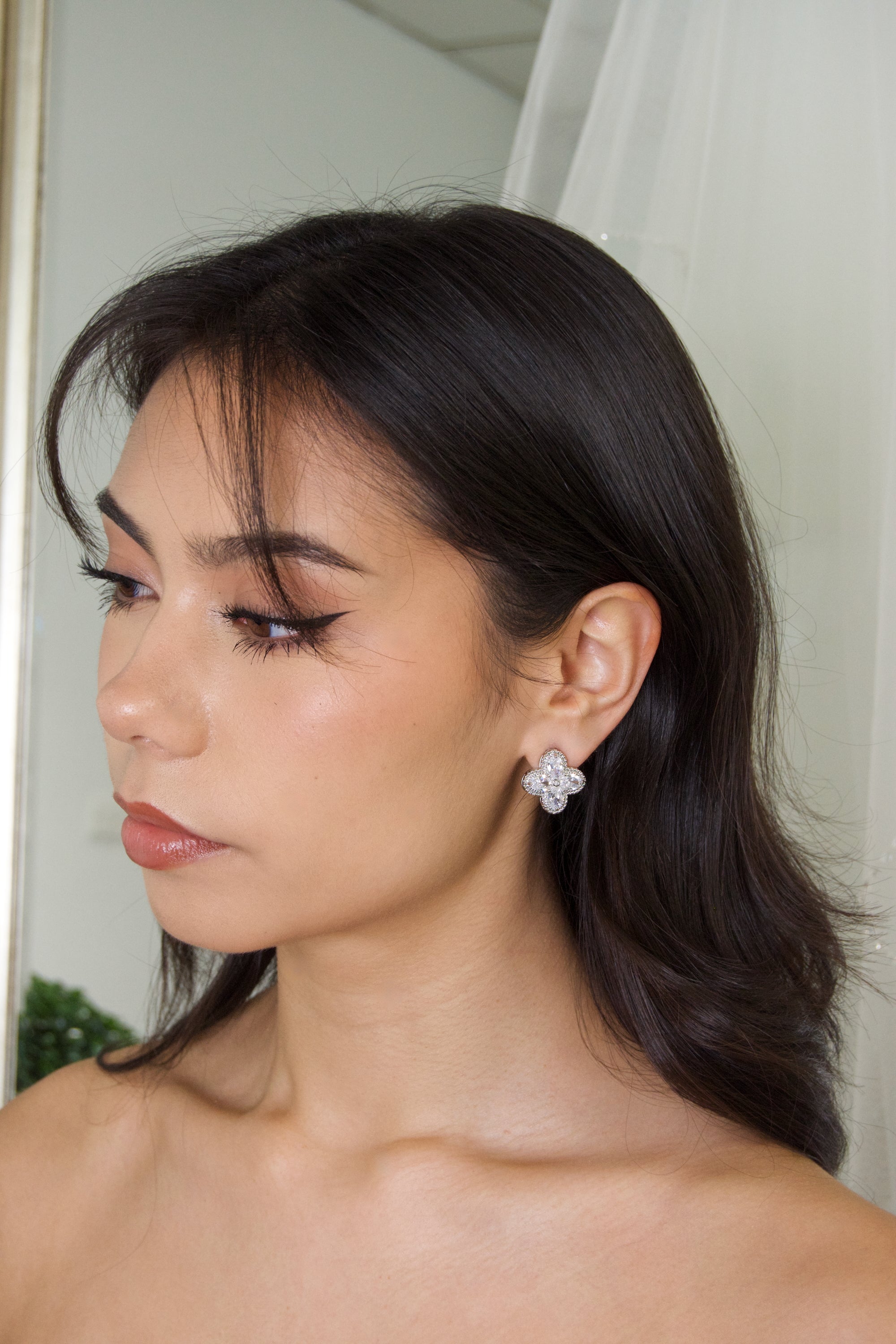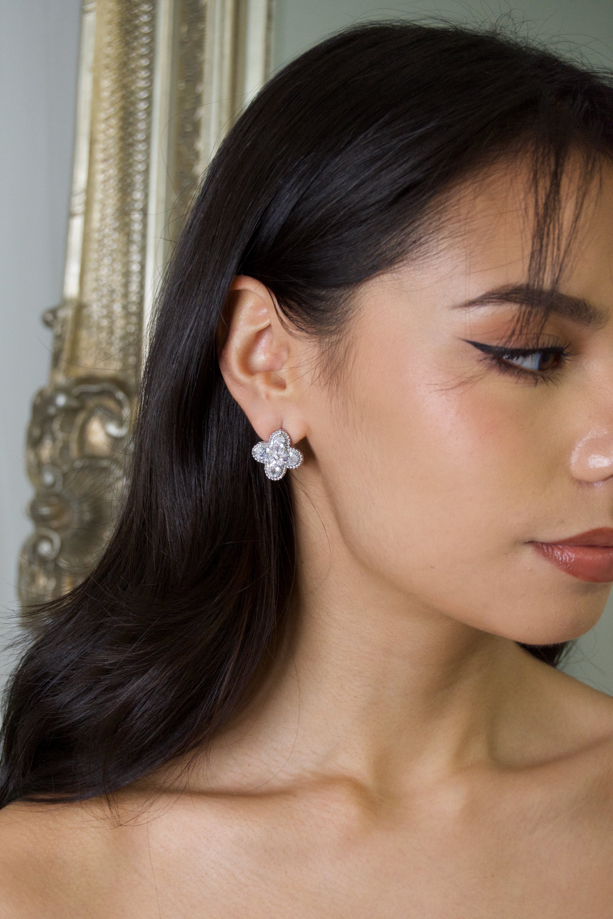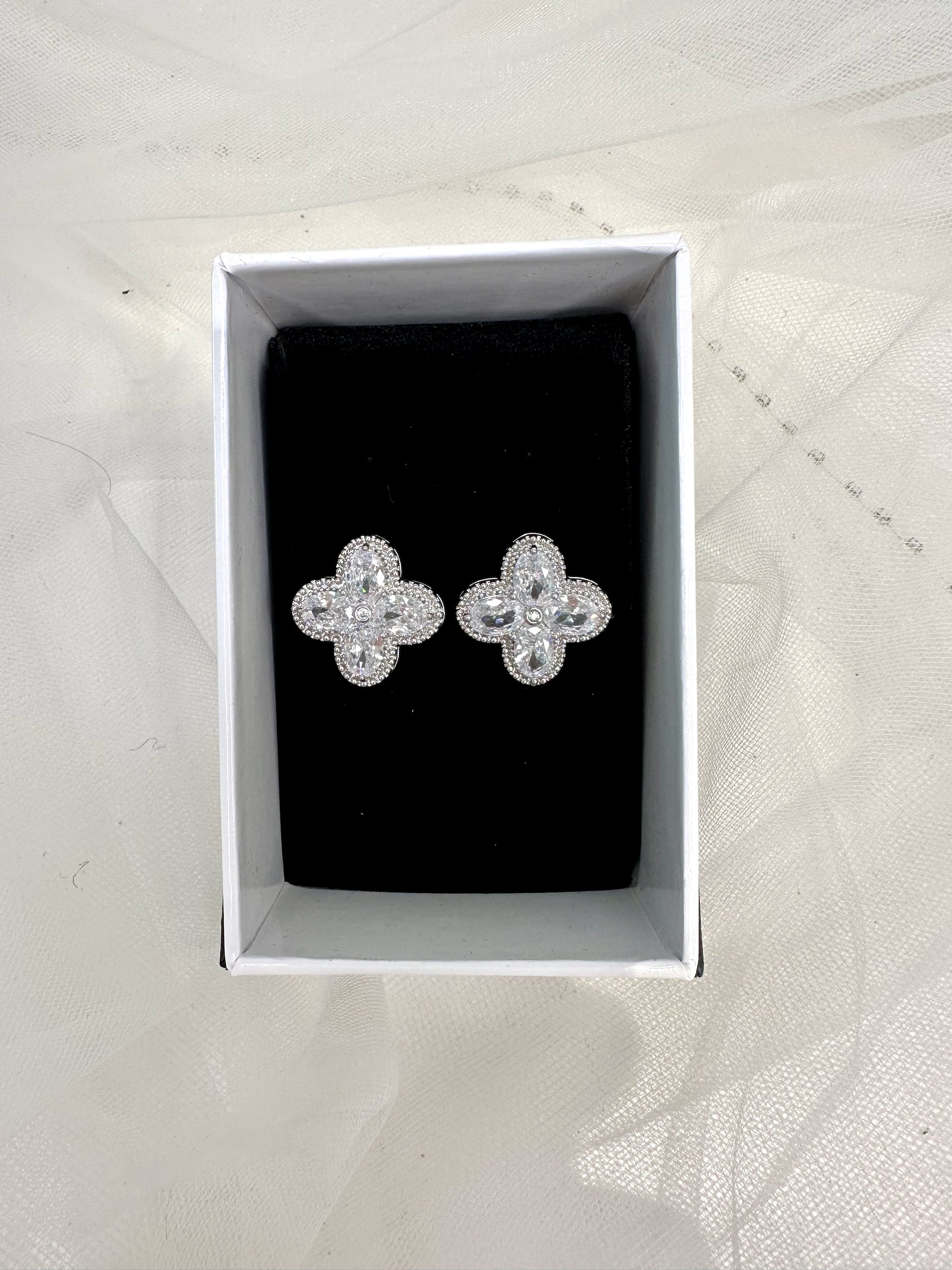 Introducing our Van Cleef Silver Earrings, the perfect accessory for brides and bridesmaids. These elegant earrings are made with high-quality zirconia stones, adding a touch of sophistication to any outfit. They come in a beautiful display box, making them a great gift option. Whether you're walking down the aisle or supporting your loved one on their special day, these earrings will add a touch of elegance to your look.