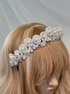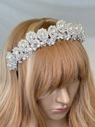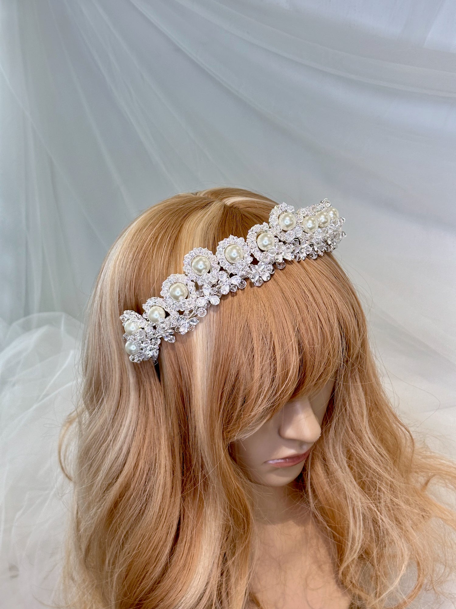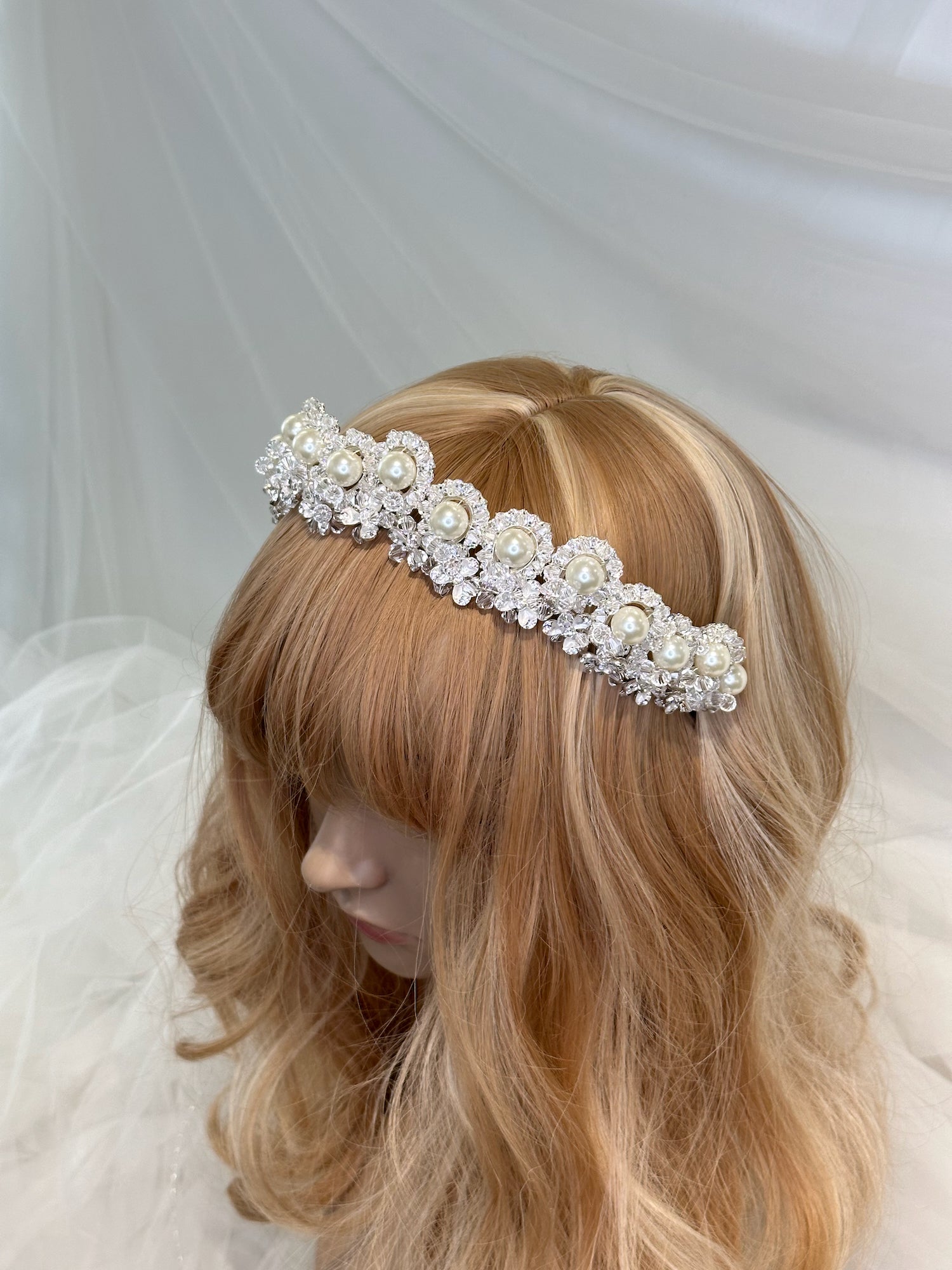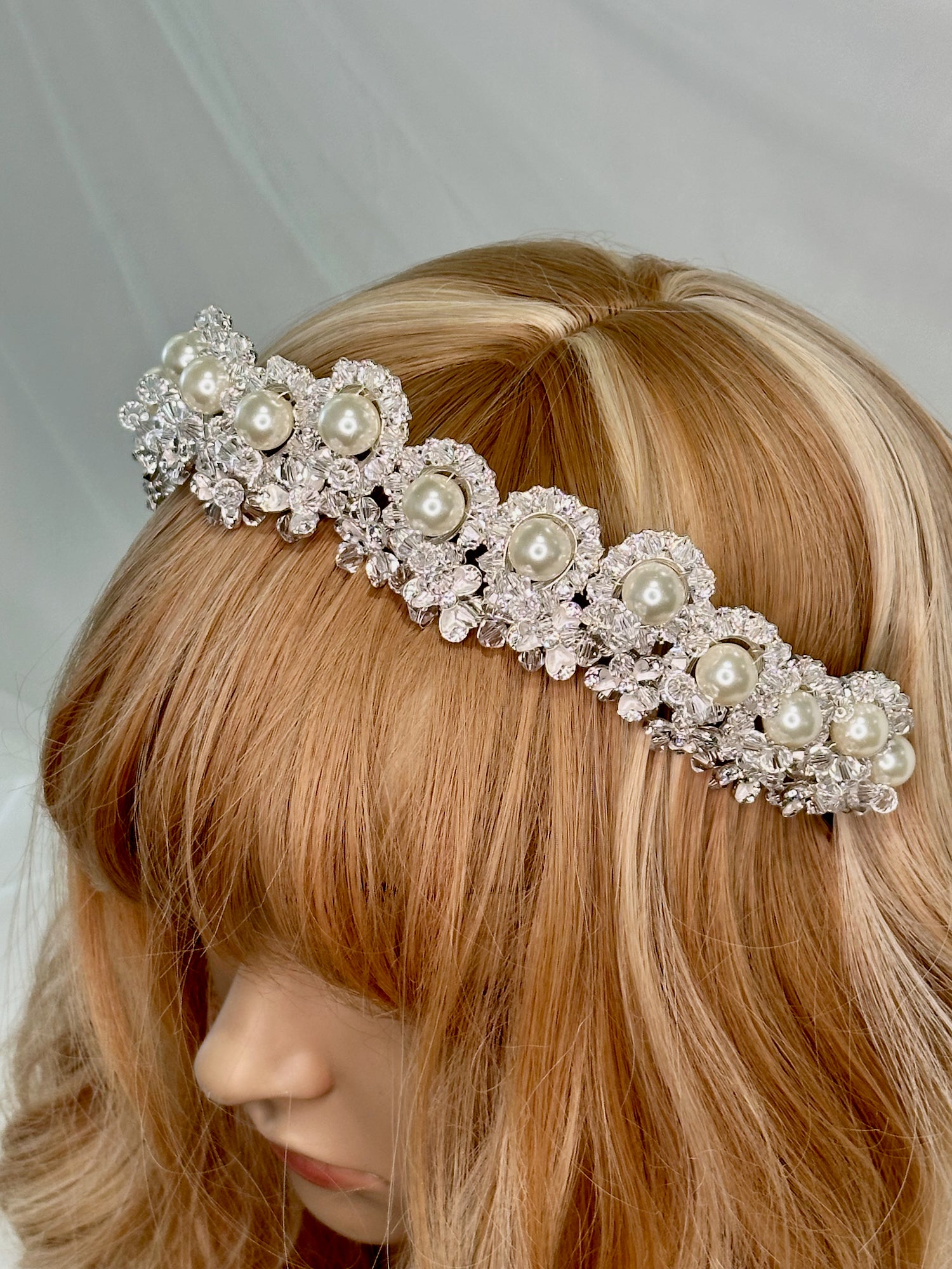 The Winona Crown arches its pearls over your head, forming a magnificent low crown. Winona is a showstopper. This Handmade delight is a wonderful shape, flattering on the head and fits like a headband over the ears. Our brass crown bands are strong yet bendable and hold no tight spring in the arch, ensuring comfort for all day wear. Winona is characterised by her pure use of crystal beads looped around pearls from end to end. Small silver brass flowers decorate the base of the crown sitting comfortably on the head. Winona is an incredible piece. She matches perfectly with satin dresses or wear her with a crystal and pearl detailed dress to complete your look.